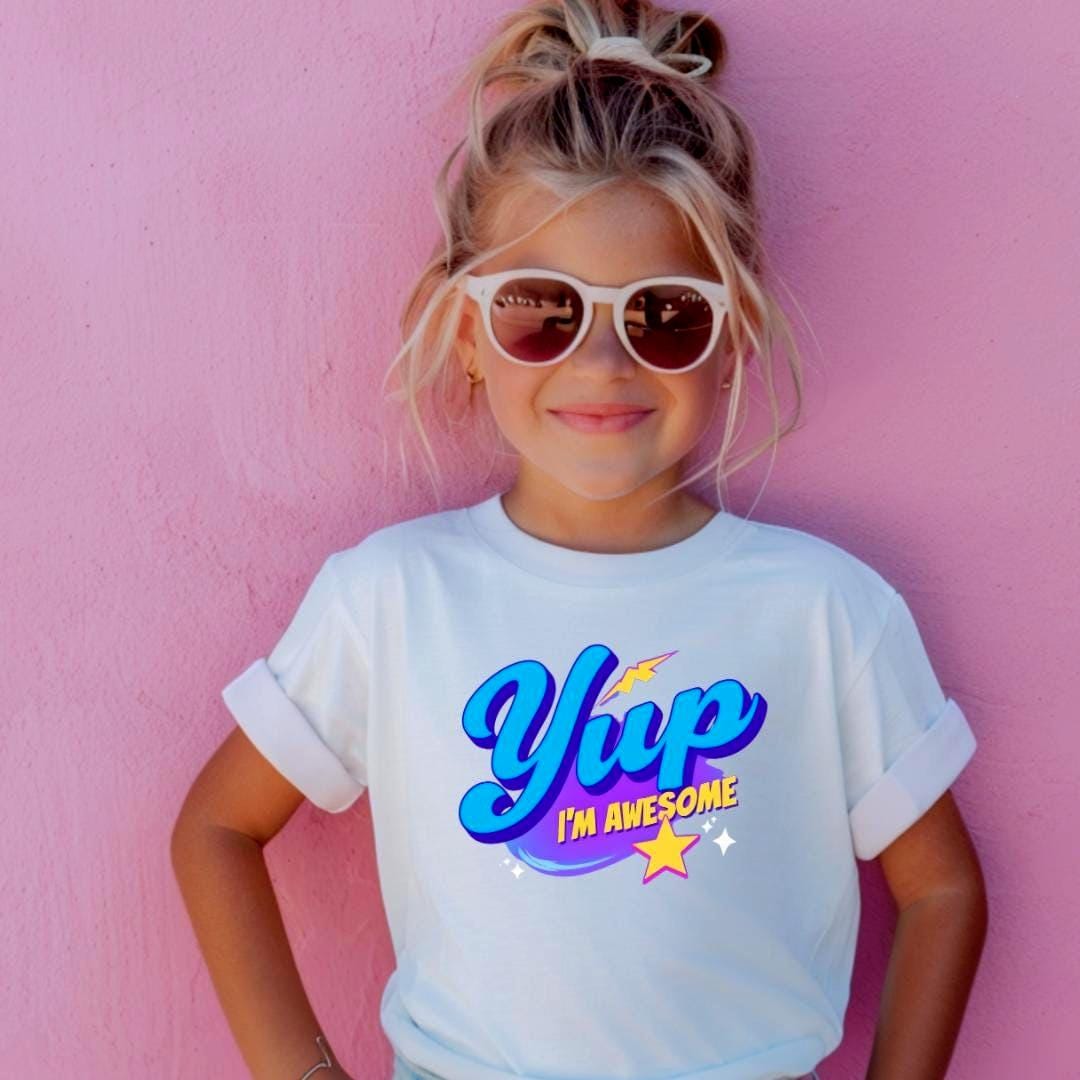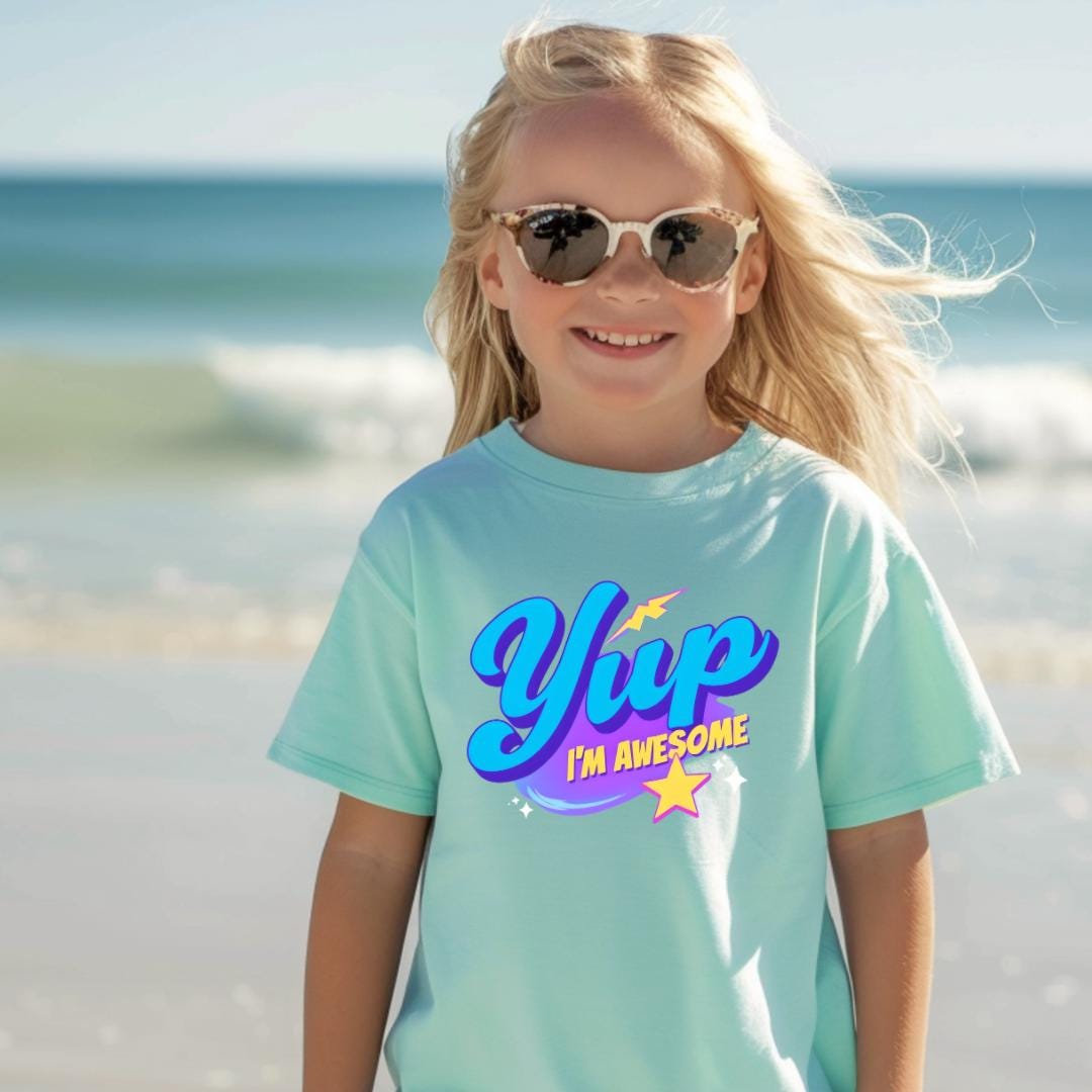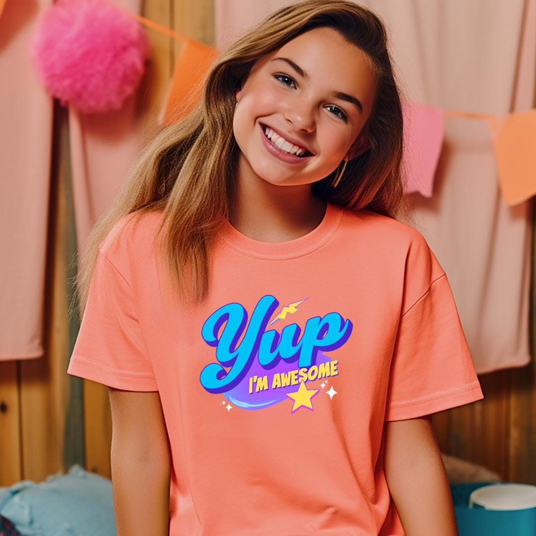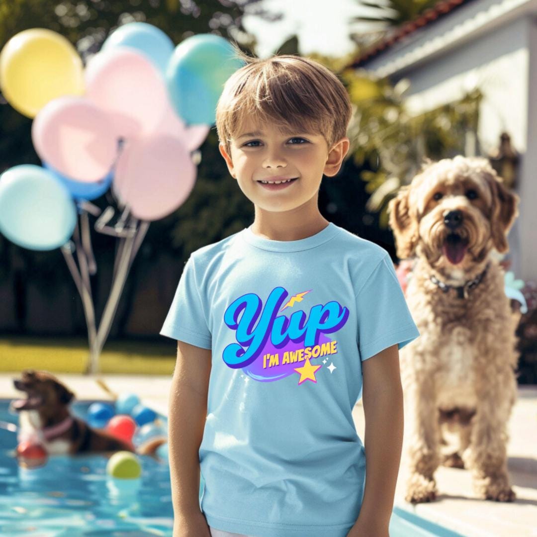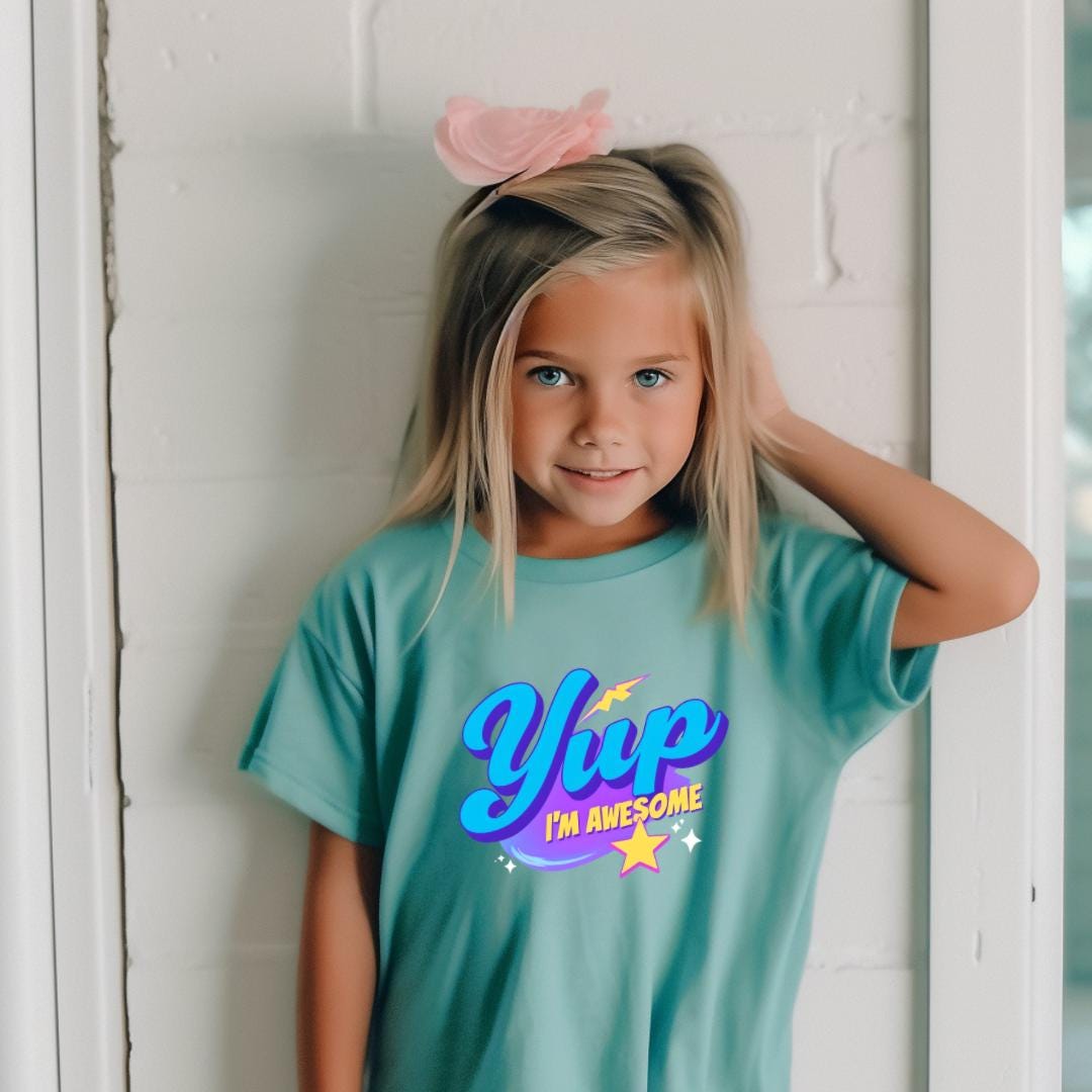 Celebrate your child's confident spirit with this fun and positive Kids Birthday T-Shirt, featuring the bold statement "Yup I'm Awesome." Crafted on a Comfort Colors 9018 youth tee, this shirt offers a soft-washed, garment-dyed cotton fabric that provides a cozy, lived-in feel for all-day comfort. Whether it's a birthday party, back-to-school, or everyday wear, this shirt is perfect for boys and girls who love to showcase their self-esteem and upbeat attitude.