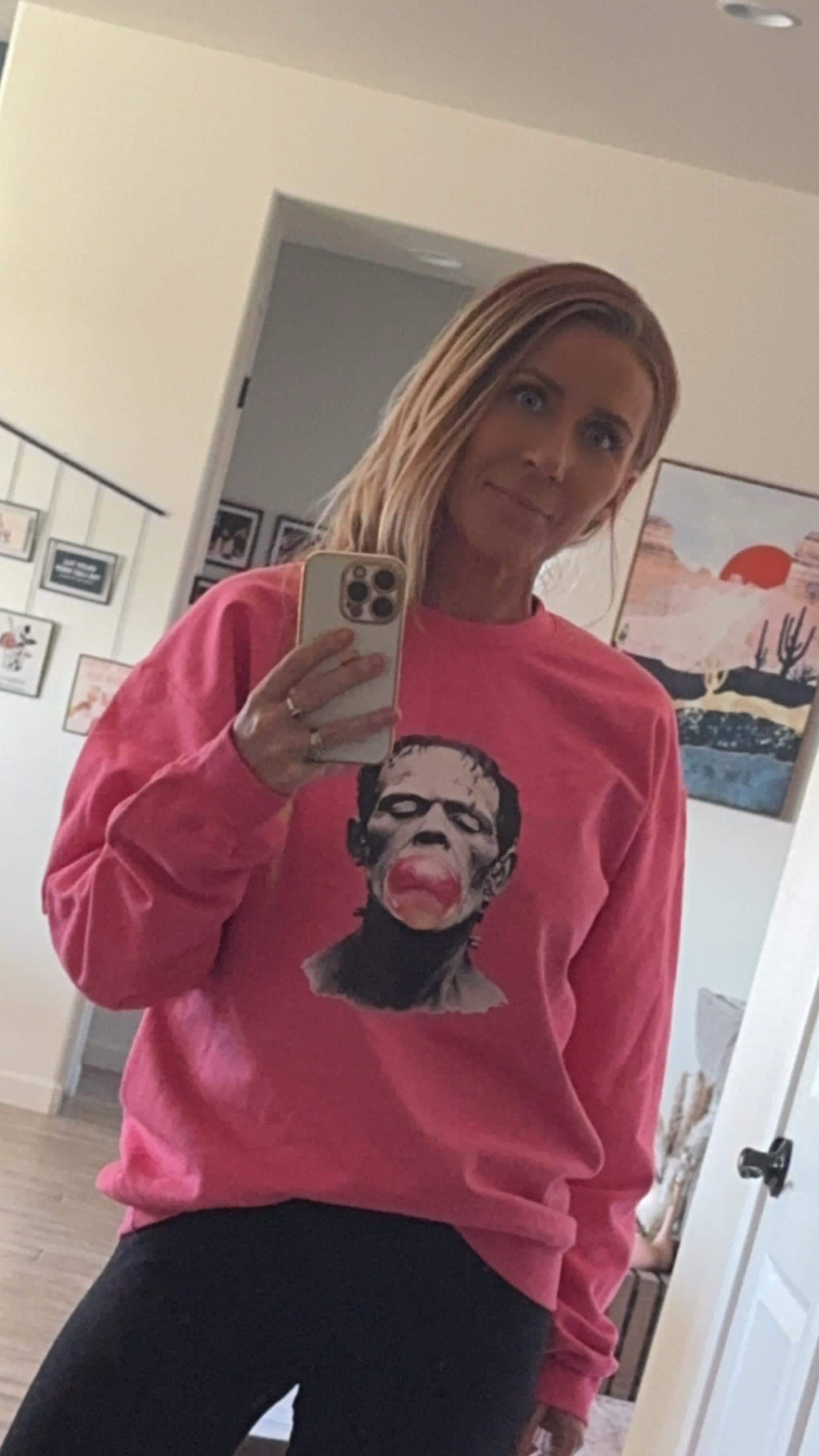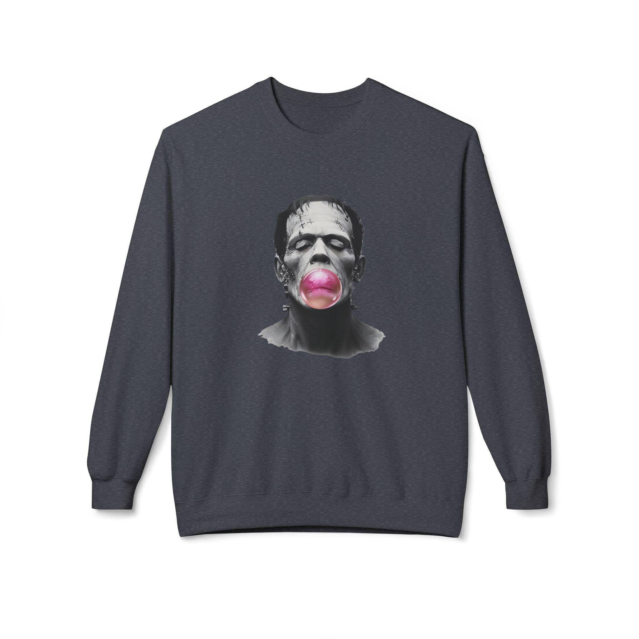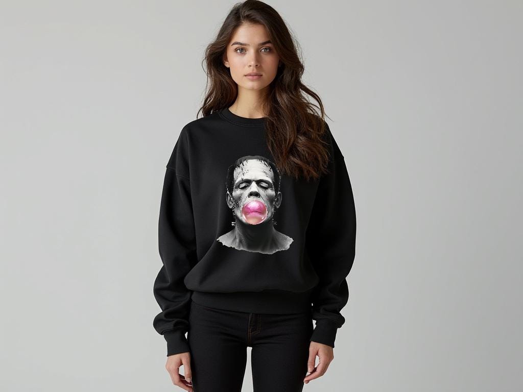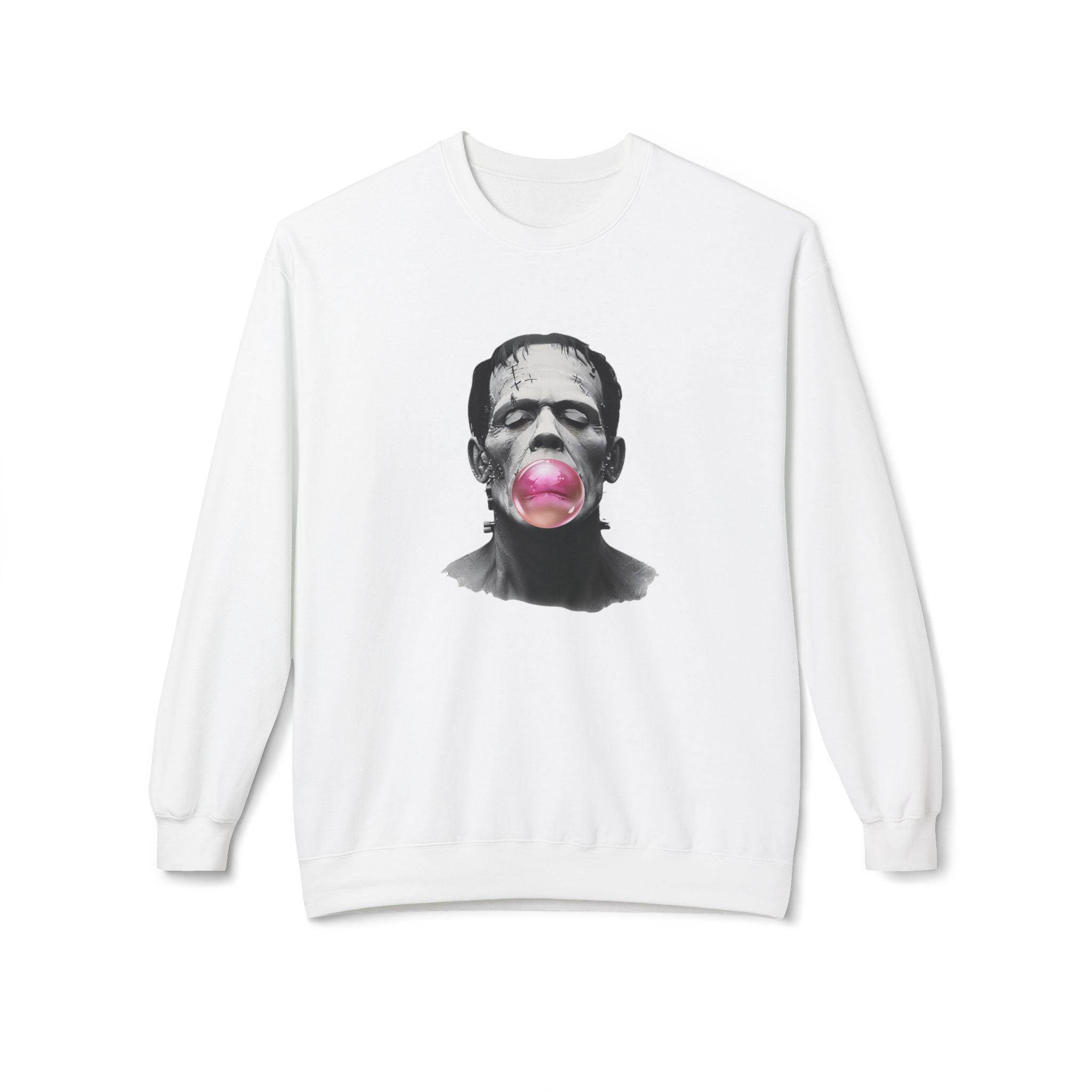 This Frankenstein Sweatshirt is the perfect horror movie fan gift. Its quirky bubblegum monster graphic doubles as a unique Halloween costume. The crewneck design combines horror fashion with pop culture apparel, creating a standout piece that's both comfortable and stylish for those who appreciate quirky, monster-themed clothing.