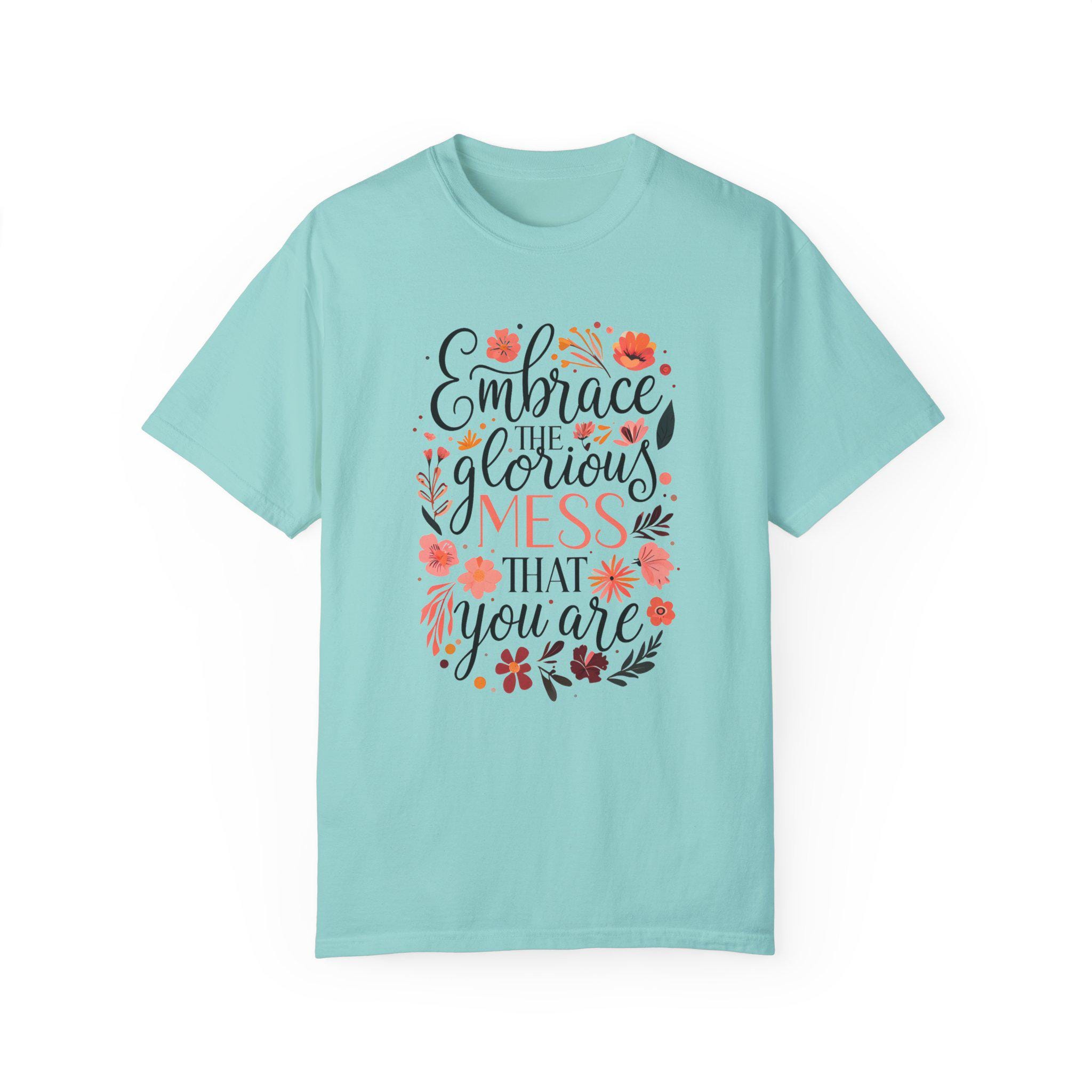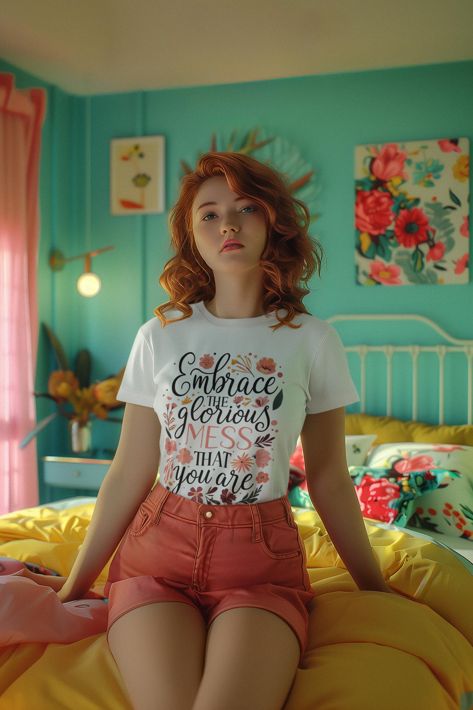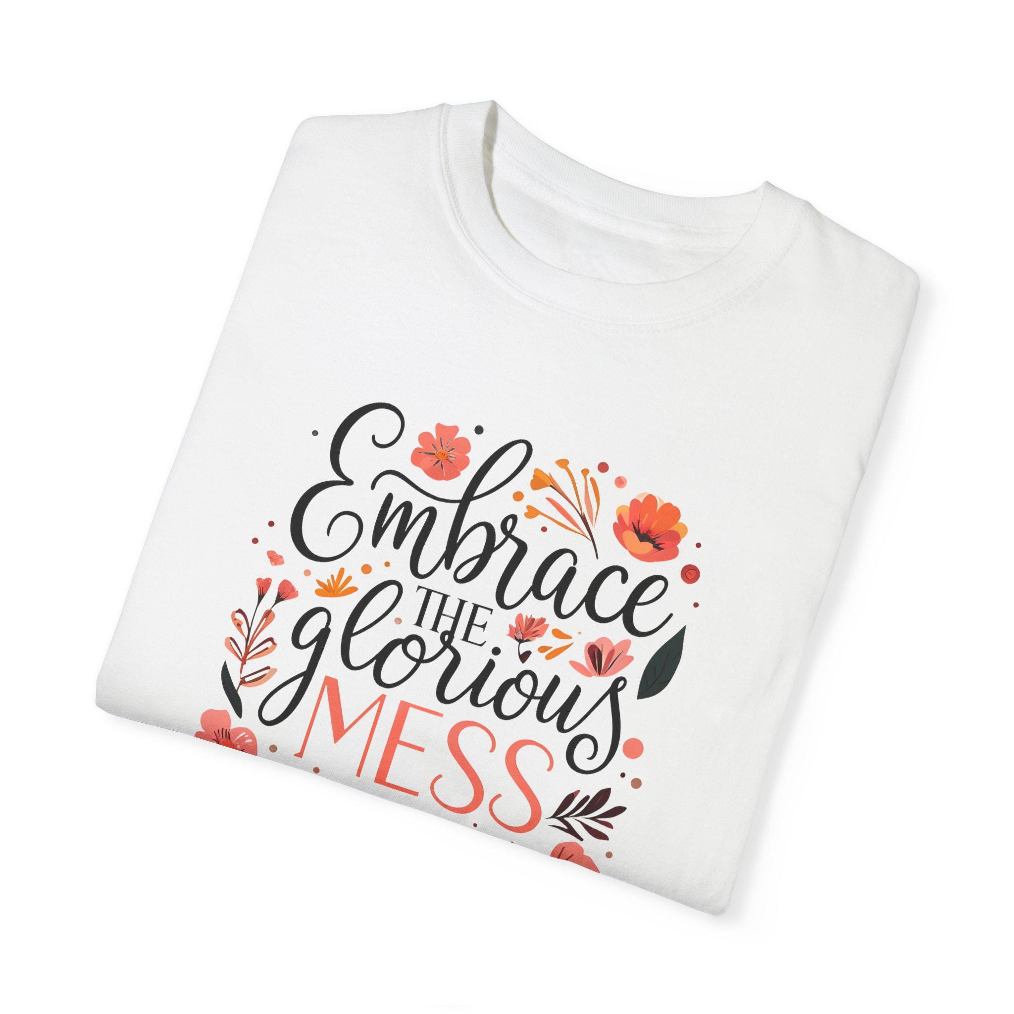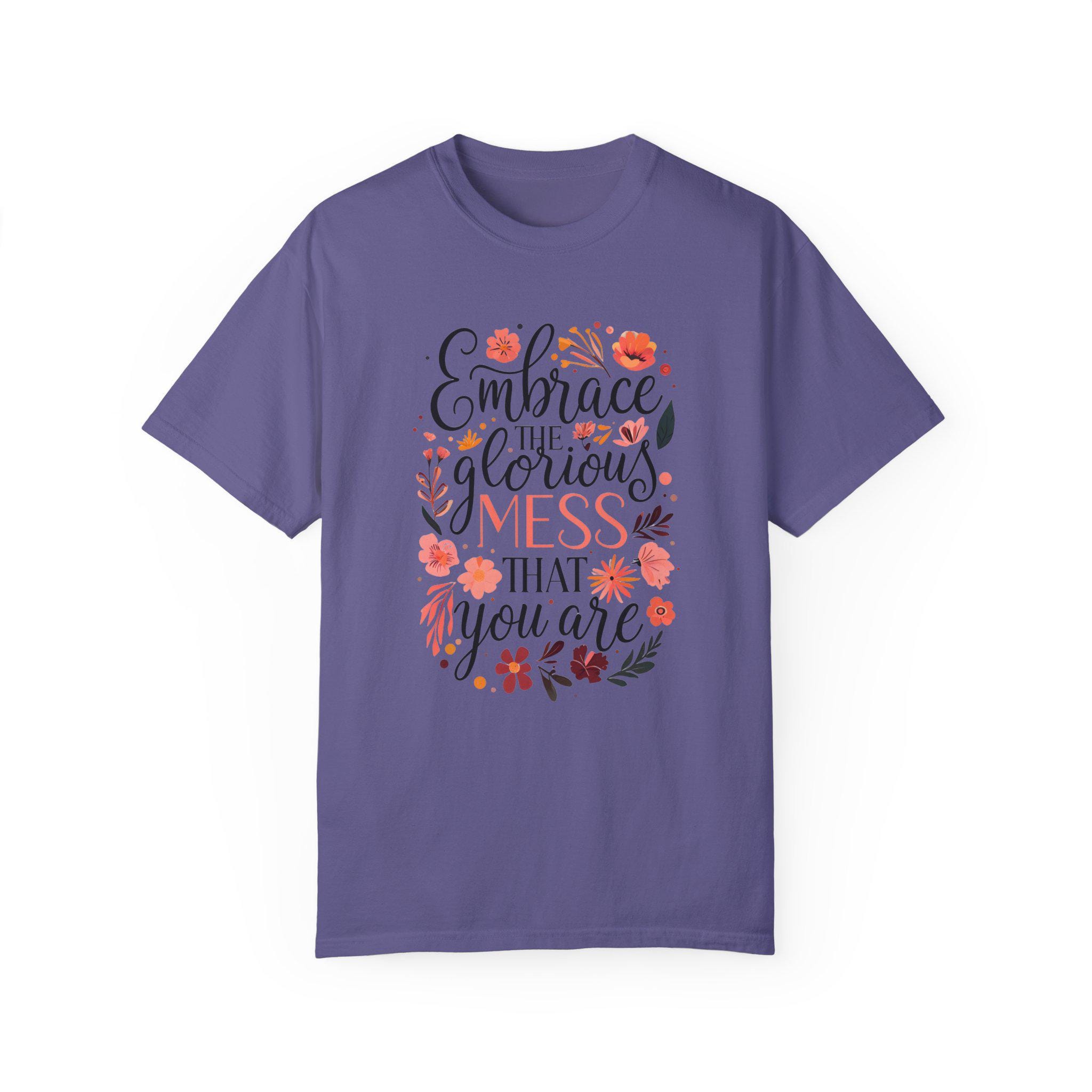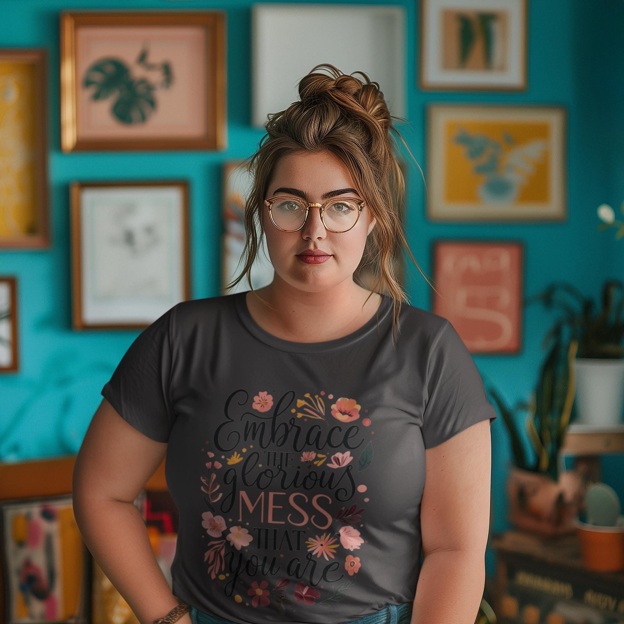 * Features the inspiring quote "Embrace the glorious mess that you are," surrounded by a beautiful floral design on a gray background
