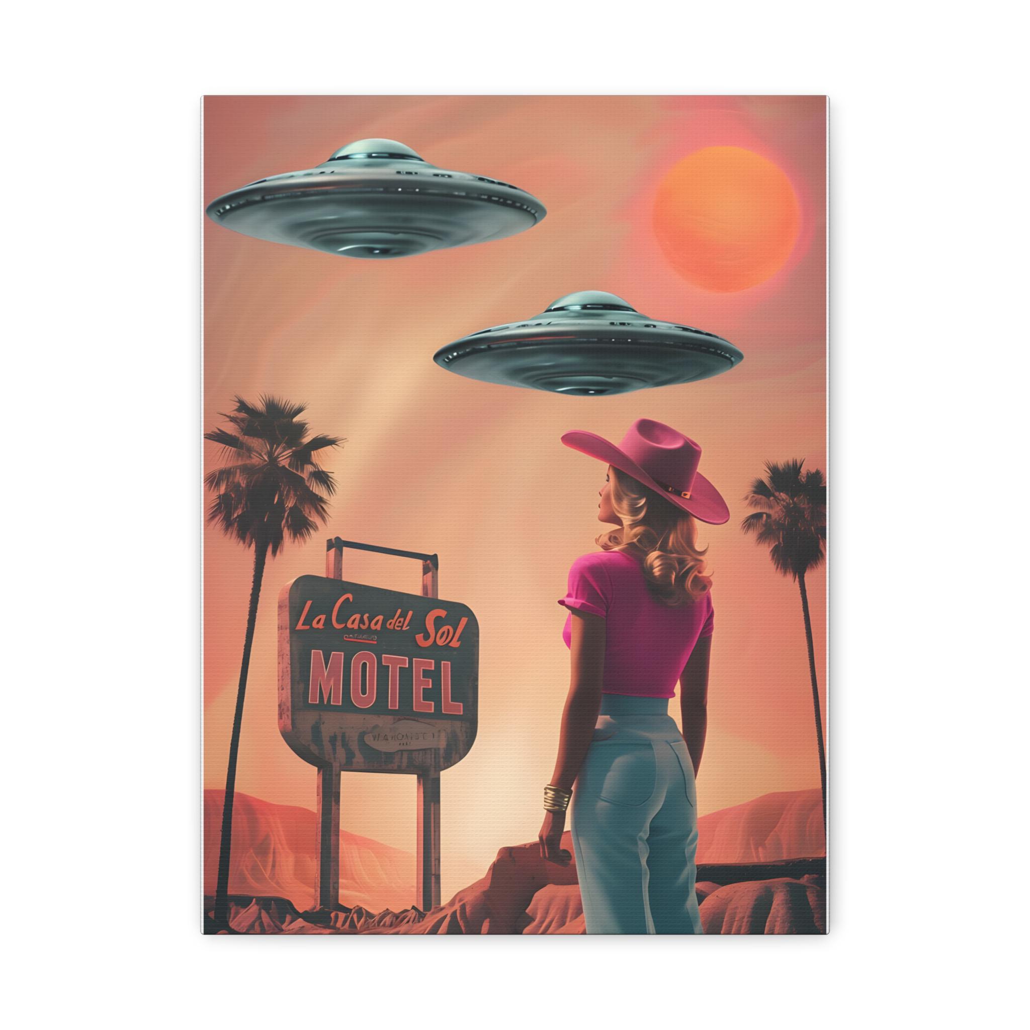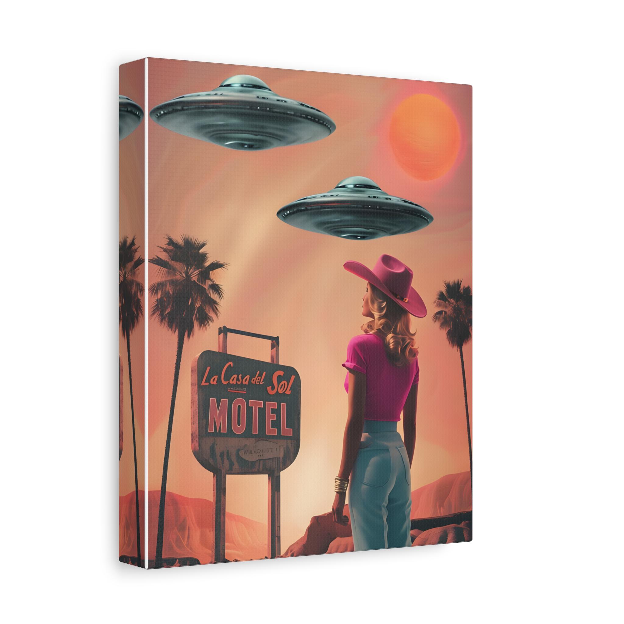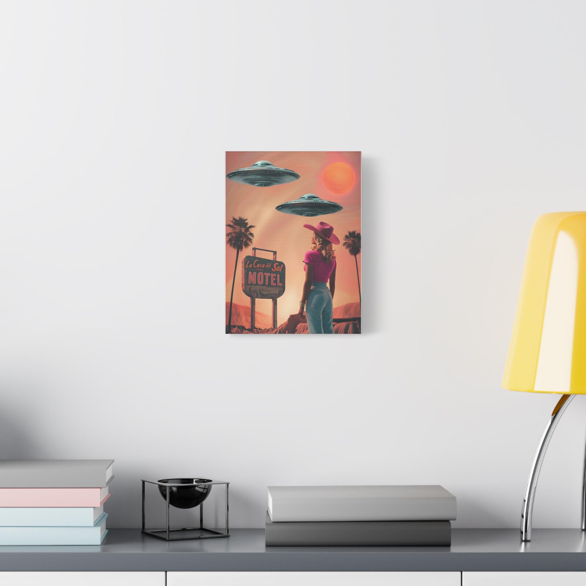 Elevate your space with this stunning desert wall art featuring a cosmic space cowgirl gazing over a vintage matte canvas desert landscape, complete with retro UFO accents that blend nostalgia and whimsy. This unique piece captures the serene vastness of the desert night sky, making it a captivating focal point that sets your home decor apart.