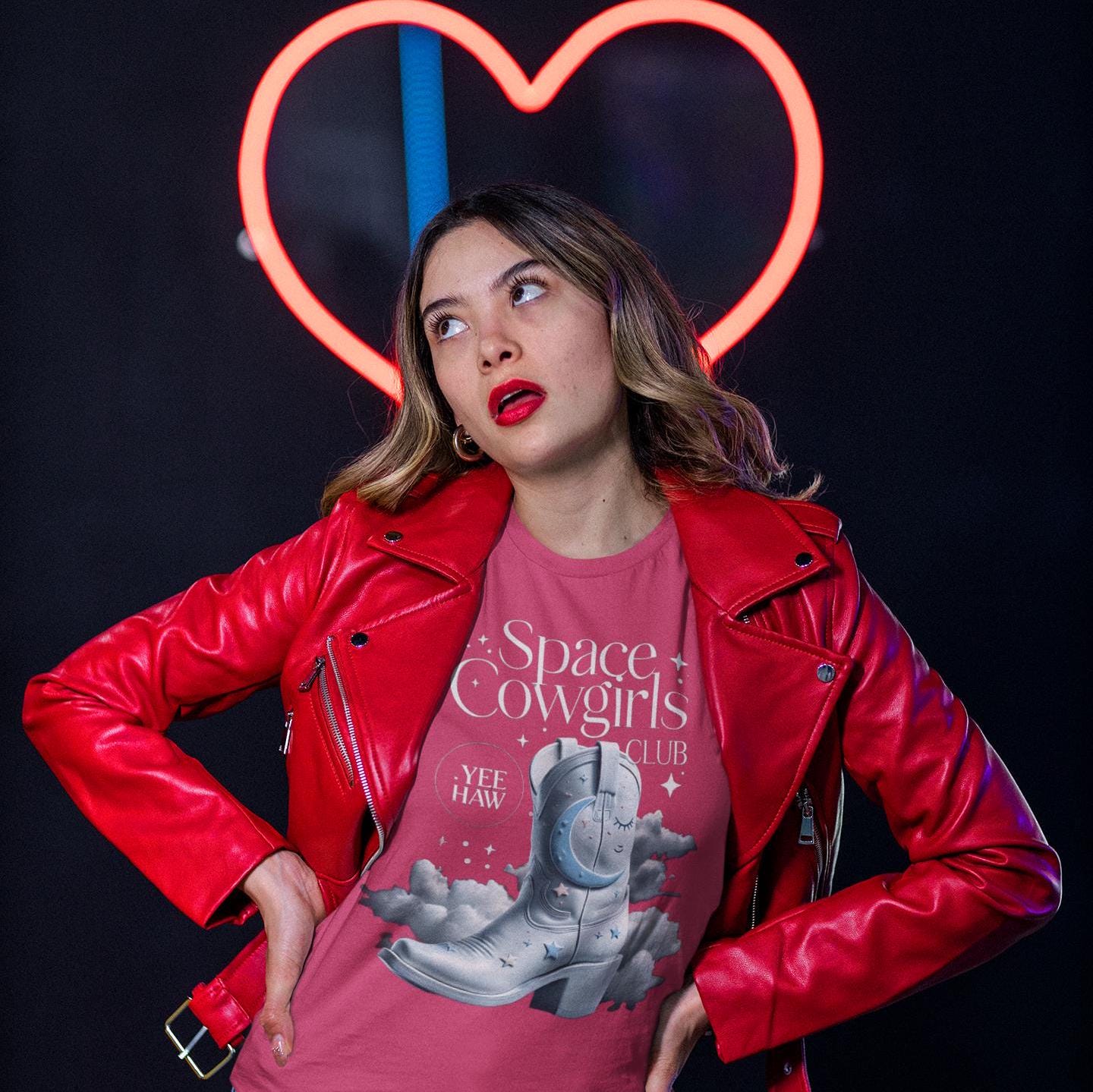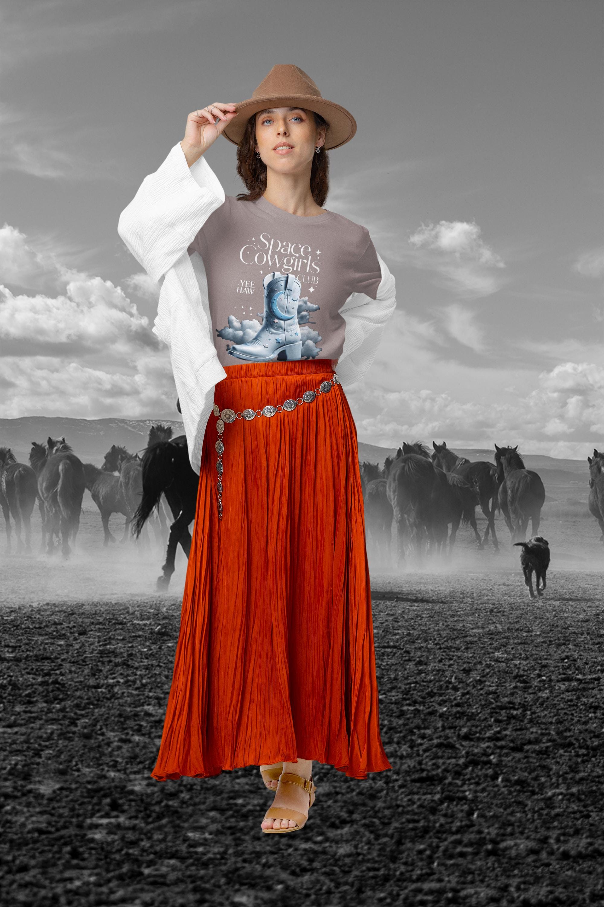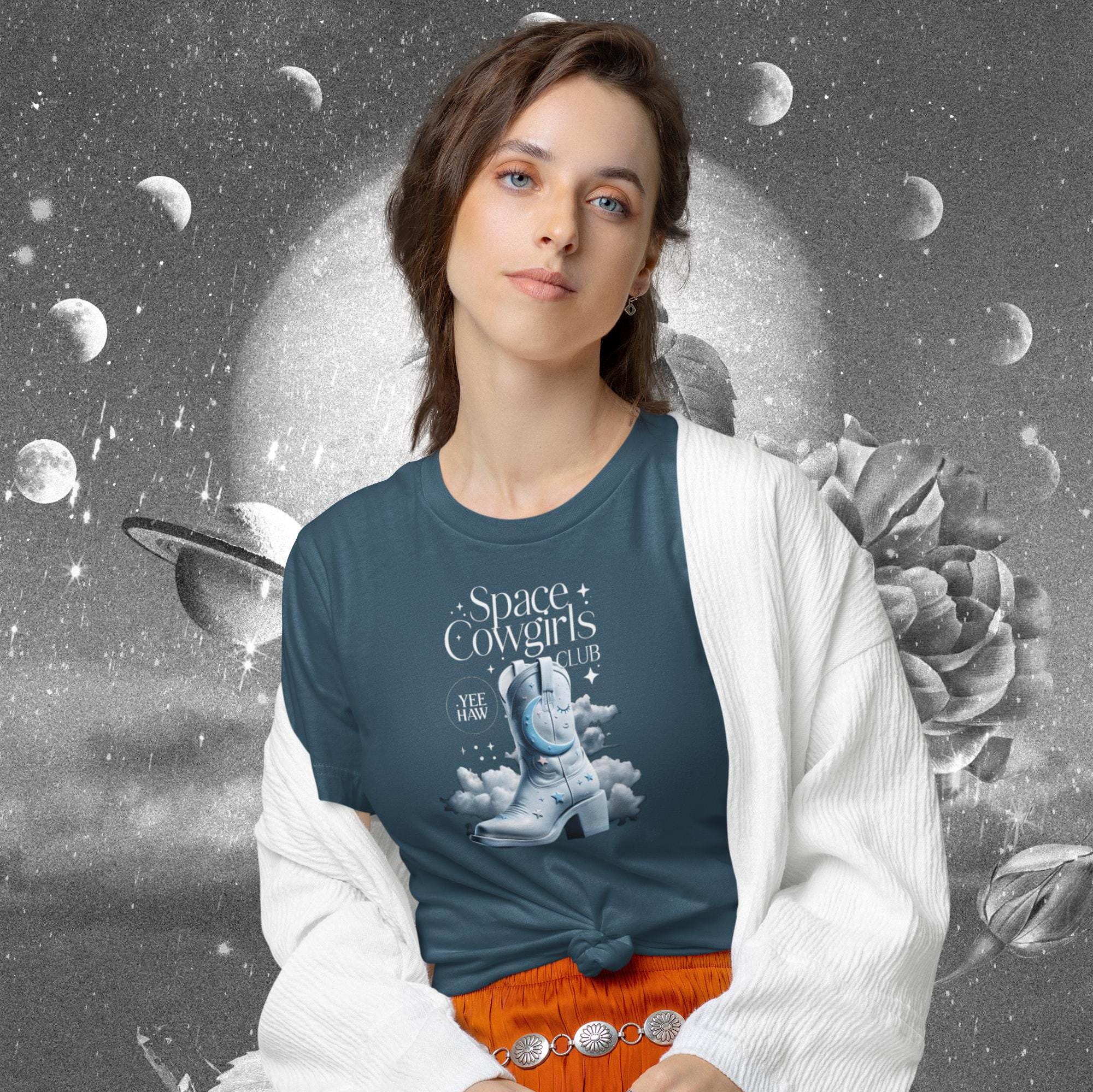 Join the Space Cowgirls Club with this stylish T-Shirt. Perfect for those who love space-themed designs and cowgirl vibes. Ideal for casual wear, layering, and accessorizing. Great for fans of western, sci-fi, and unique fashion. Suitable for holidays like Halloween, rodeo events, and casual gatherings with friends.