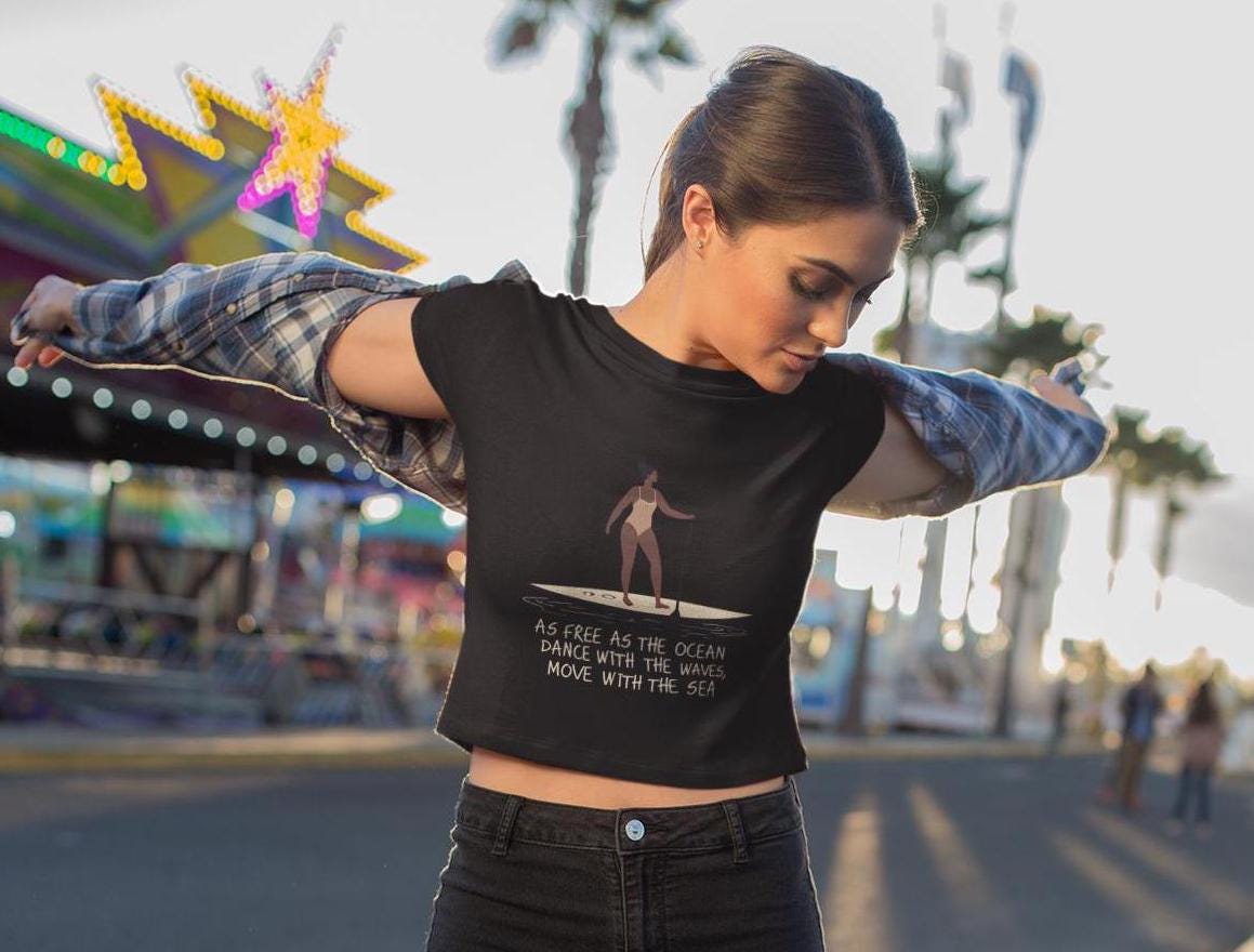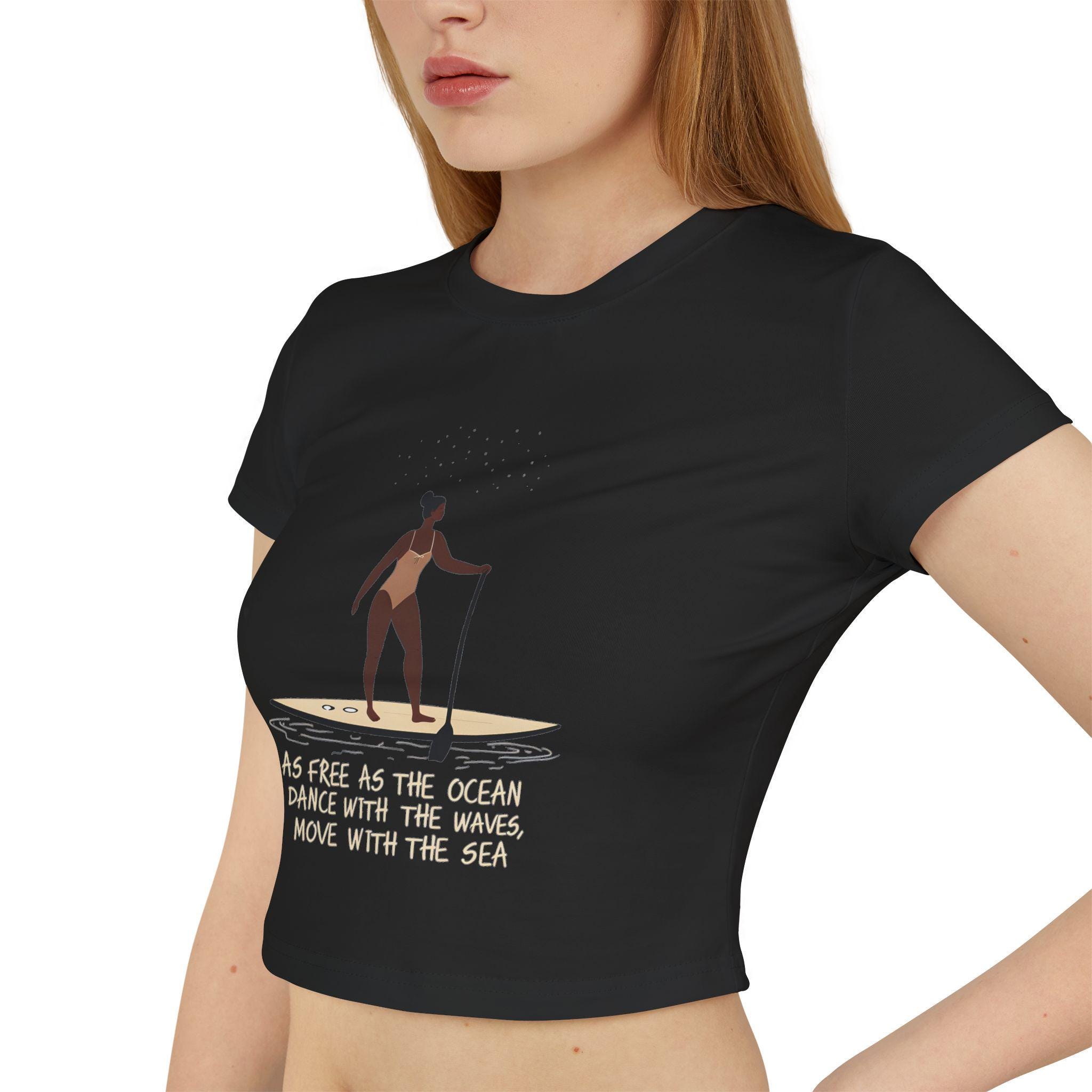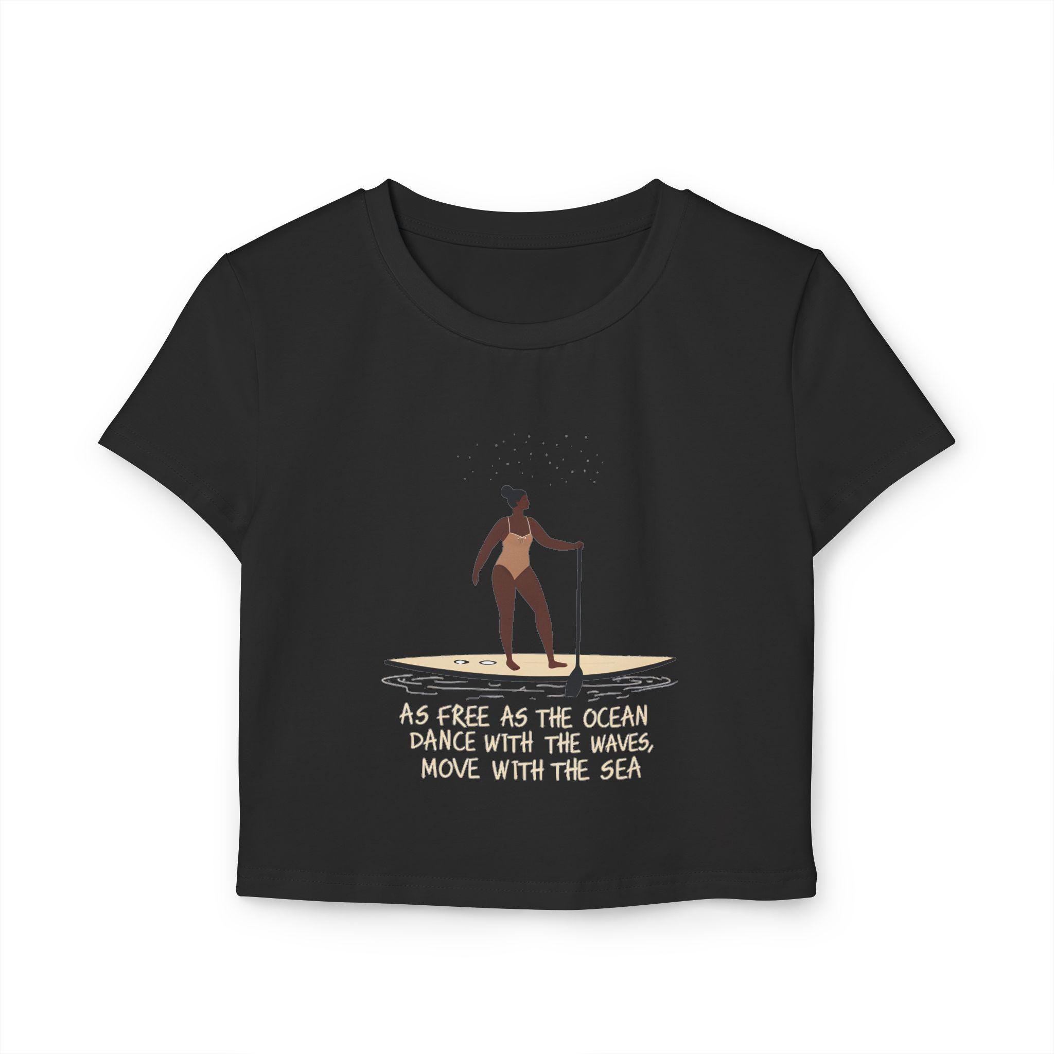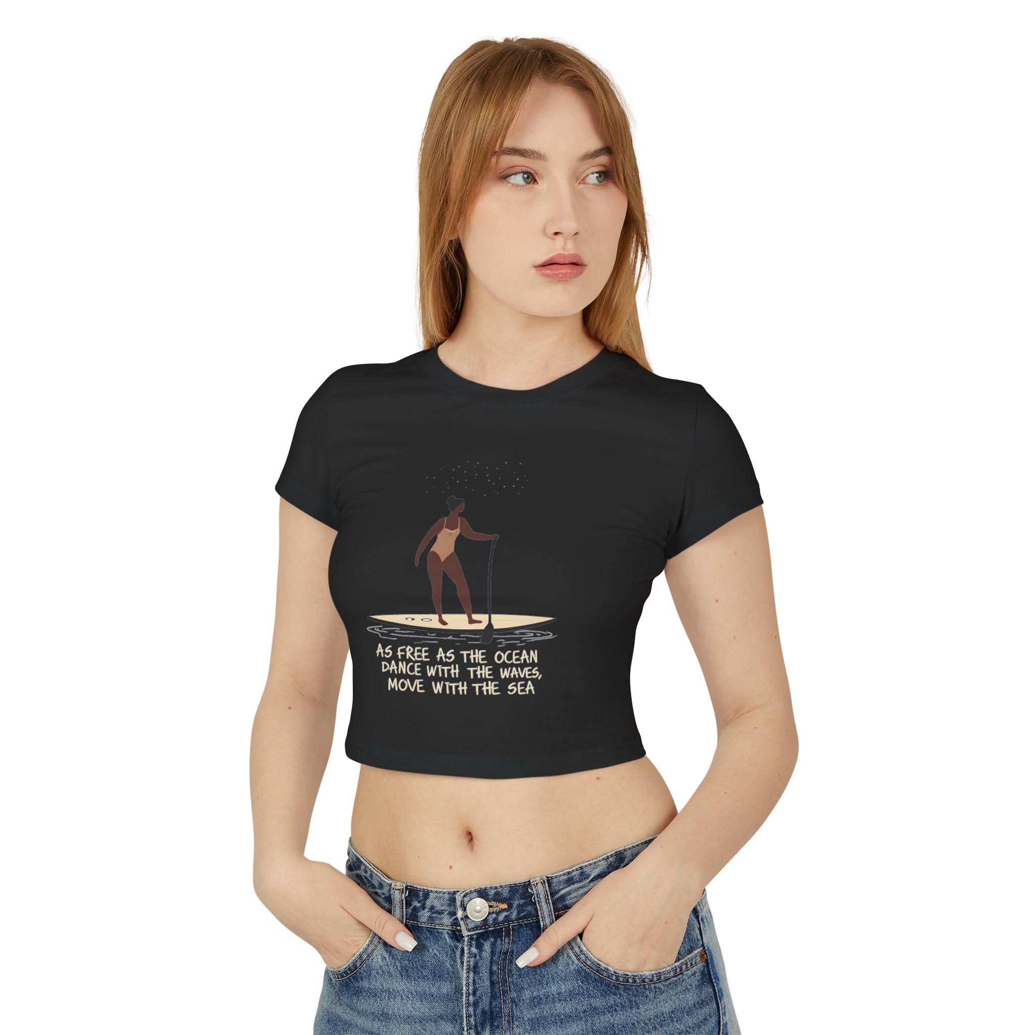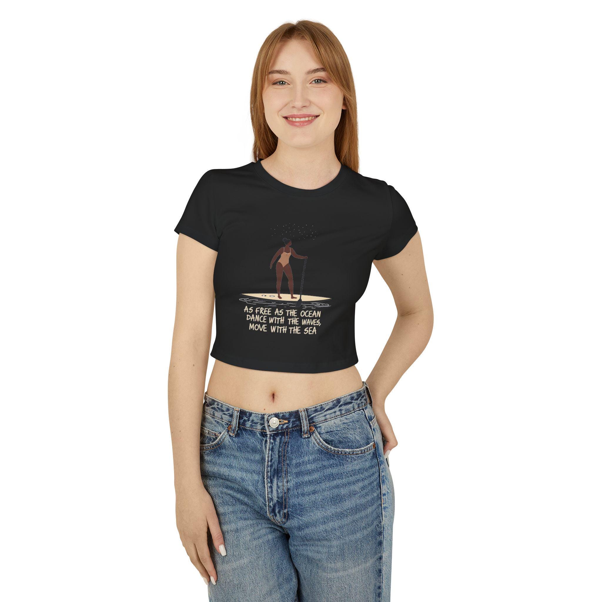 Feel free and adventurous with this women's baby tee featuring a woman on a paddleboard with the quote 'as free as the ocean, dance with the waves, move with the sea'. Perfect for the beach-loving, nature-inspired individual. Ideal for summer outfits or beach outings, this tee is a great addition to a casual wardrobe. Suitable for ocean lovers, paddleboarding enthusiasts, and those who embrace a carefree lifestyle. Perfect for beach vacations, summer holidays, and outdoor activities.