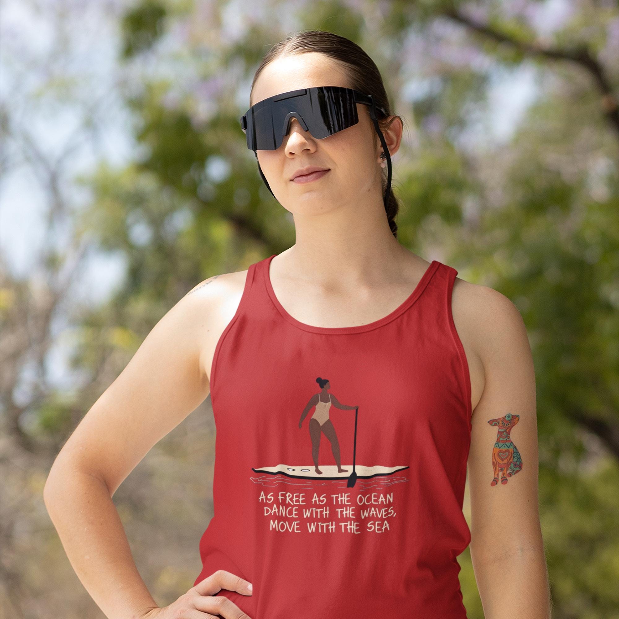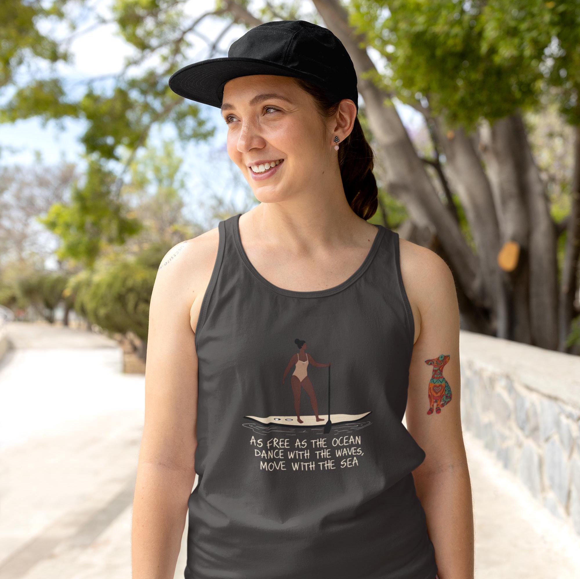 This Tank features a design of a woman on a paddleboard with a paddle, accompanied by the quote 'As free as the ocean dance with the waves, move with the sea'. It exudes a sense of freedom and adventure, perfect for those who love being on the water. Ideal for beach lovers, surfers, and water sports enthusiasts. Suitable for summer wear, beach vacations, and coastal getaways.