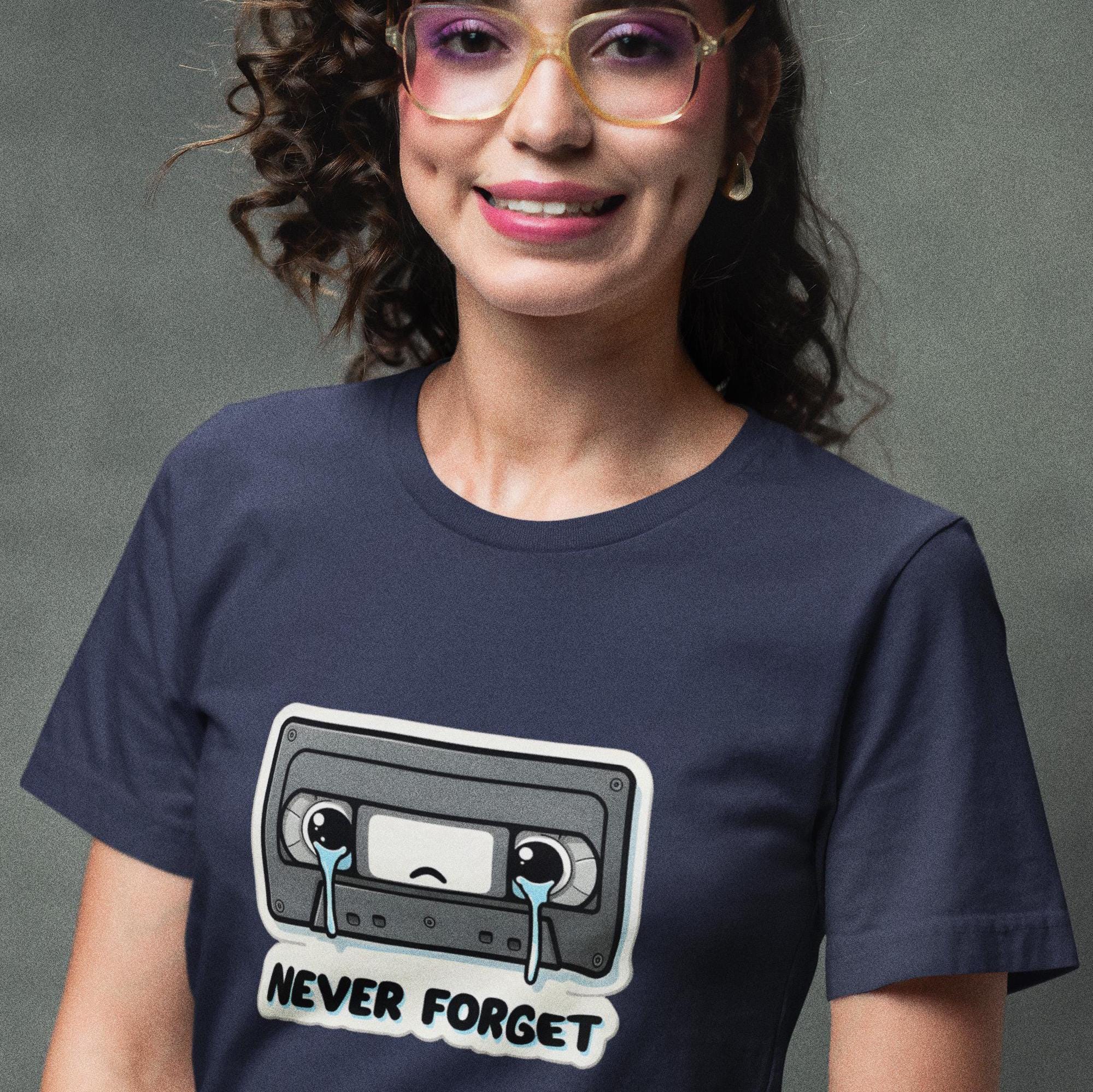 Navy blue t-shirt featuring a crying cassette tape graphic with "Never Forget" text.