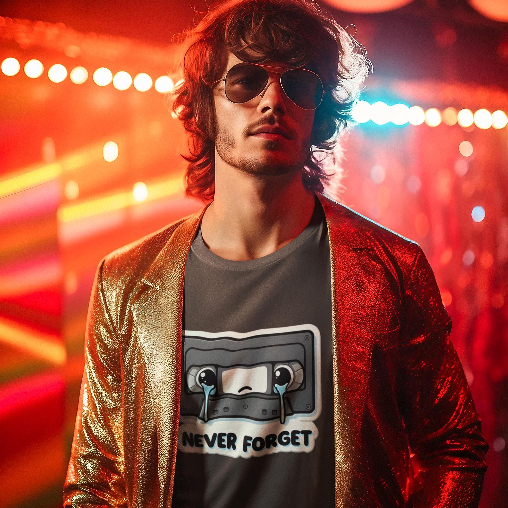 This Retro Cassette Tape Shirt is perfect for vintage 80s and 90s music lovers. Showcasing a nostalgic mixtape graphic tee with the poignant "Never Forget" text, this shirt embodies melancholic pop culture nostalgia, appealing to music lovers with a taste for retro and vintage styles.