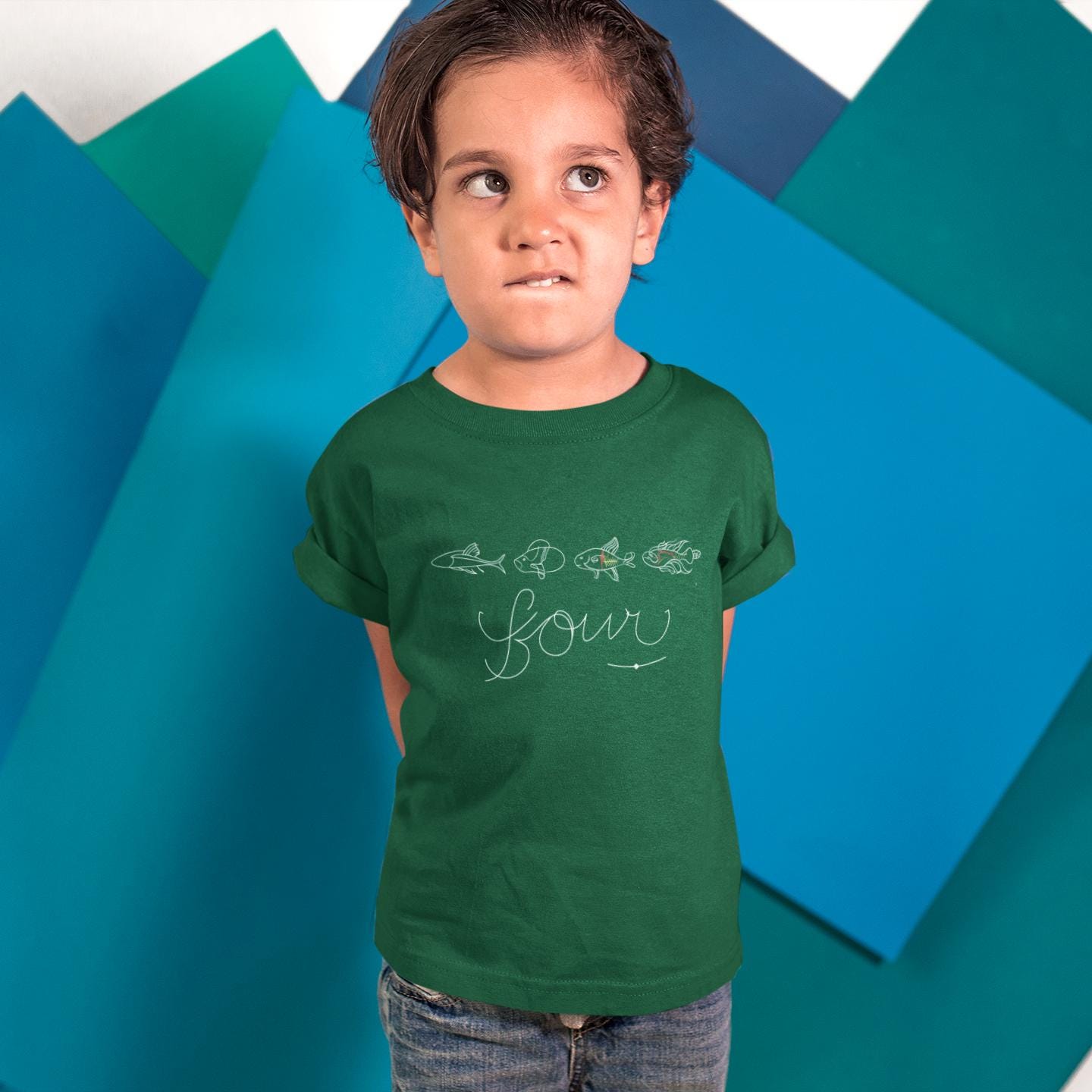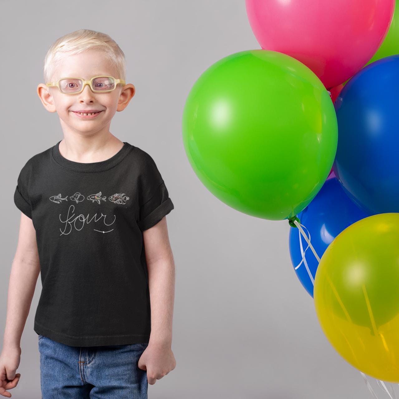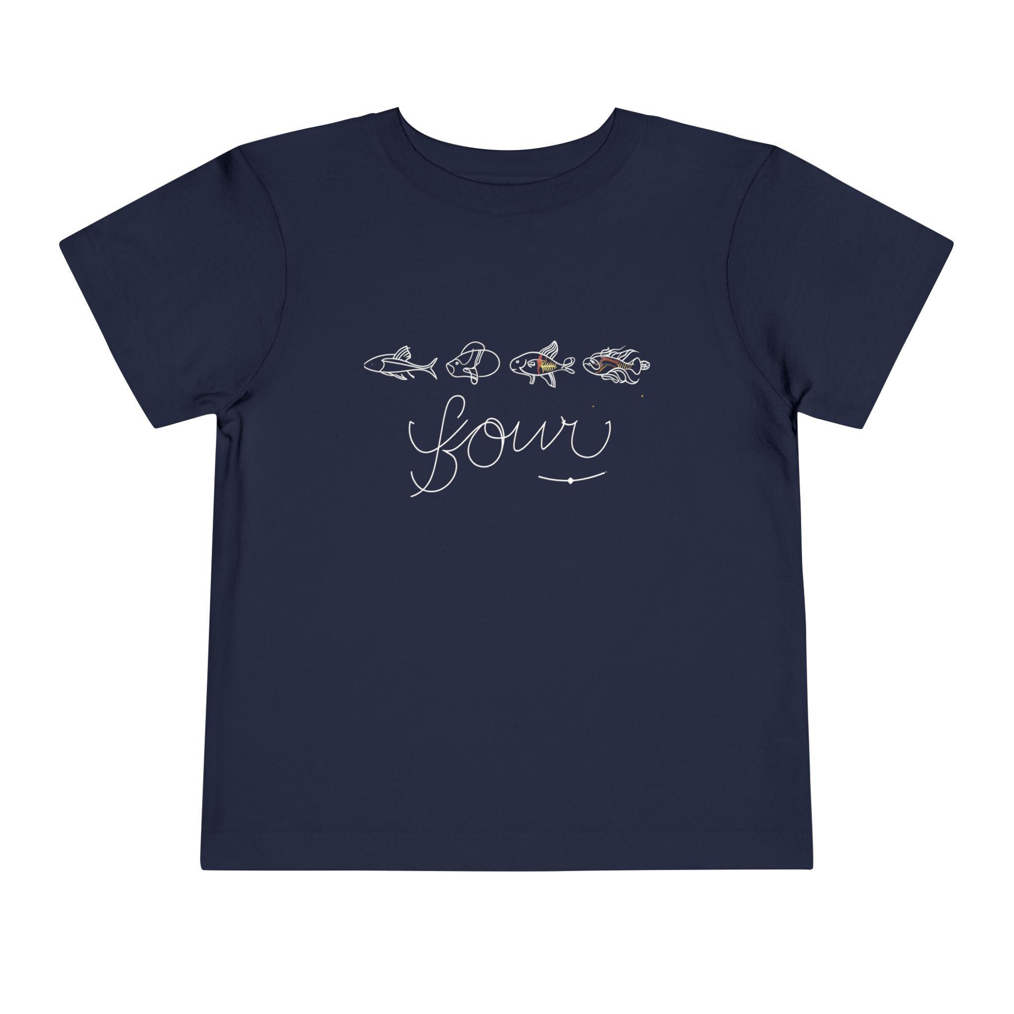This delightful toddler t-shirt showcases the number 'four' surrounded by four playful fish, making it a perfect garment for celebrating a fourth birthday or just for fun. Crafted from gentle, high-quality cotton, this shirt promises comfort for active little ones. Its unique design is great for both daily adventures and special occasions, appealing to kids who love aquatic themes.