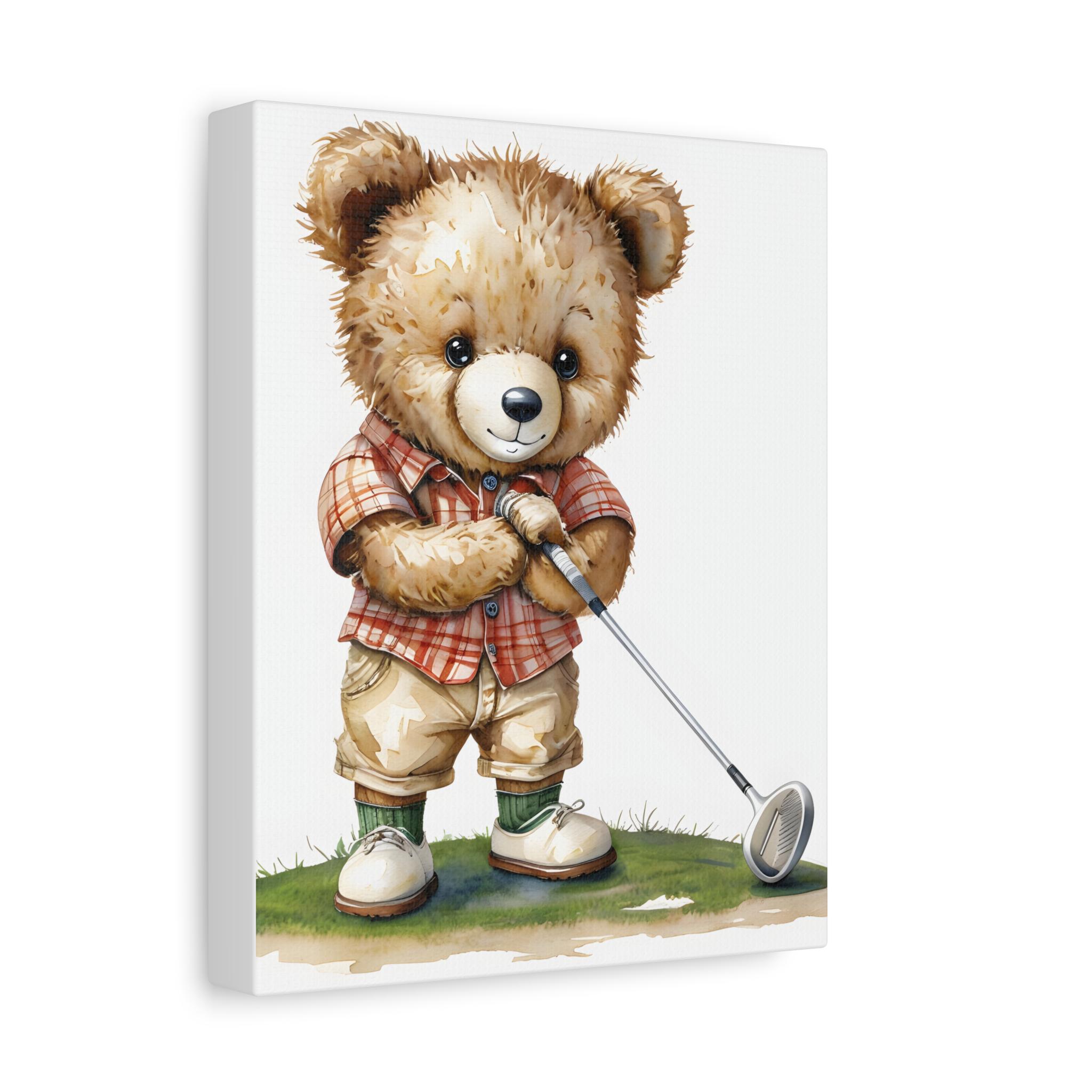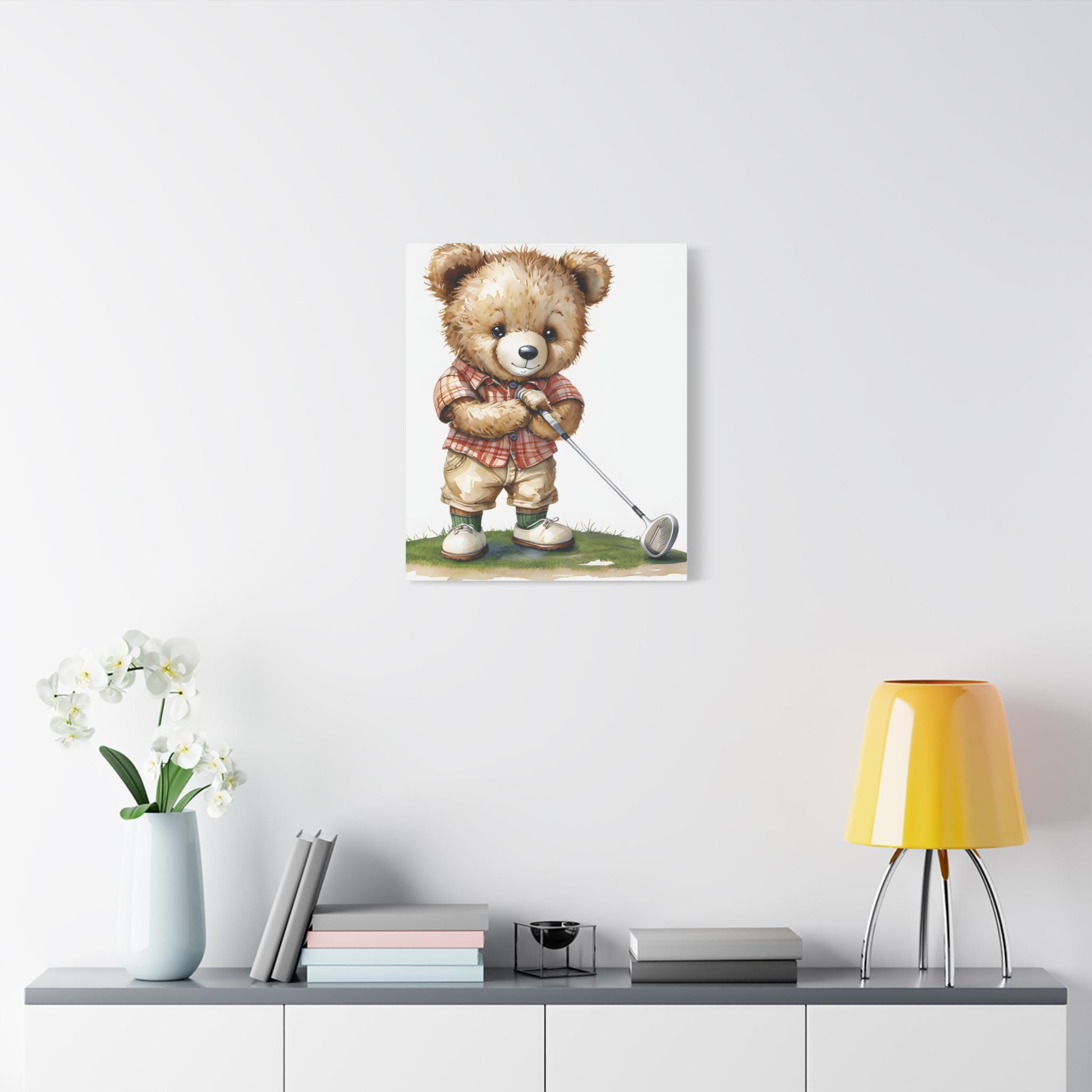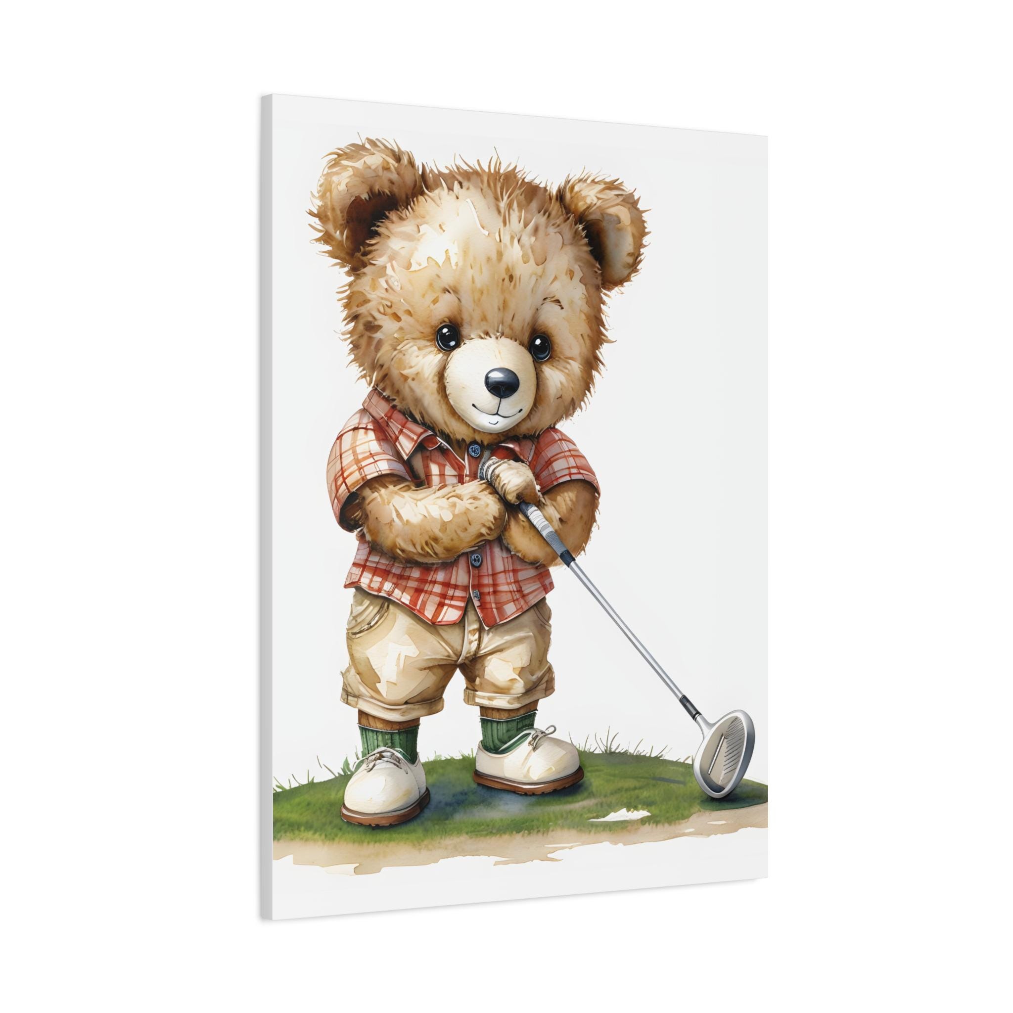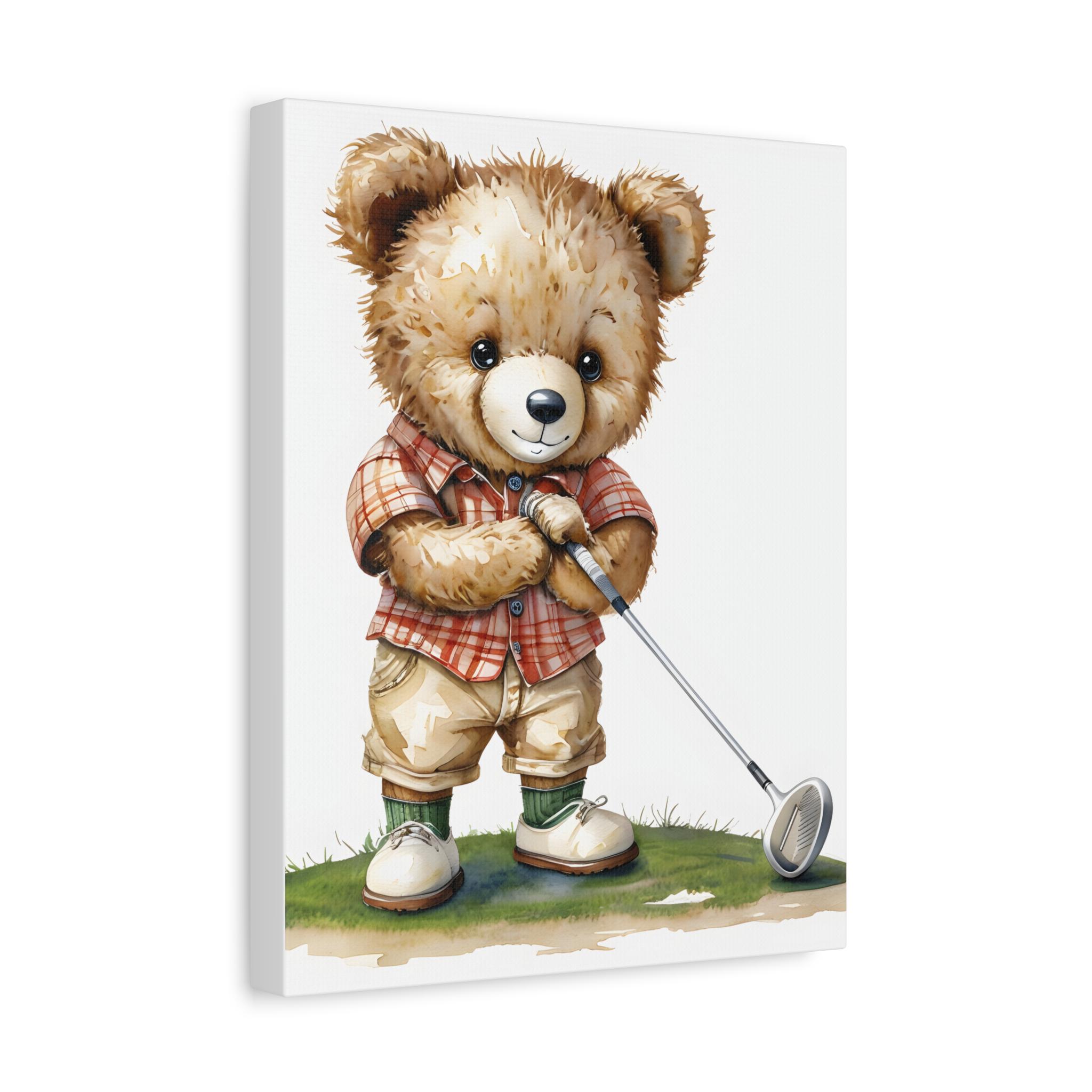 This charming canvas print showcases a little bear in the middle of a golf swing, bringing a smile to any room. Perfect for golf lovers or those who appreciate cute, whimsical art, this piece adds a playful touch to nurseries, kids' rooms, or golf-themed spaces. The bear's adorable concentration and golf attire make this canvas a delightful addition that celebrates the joy of sports in a light-hearted way. A great gift for any occasion or a fun decor choice for anyone who loves the blend of nature and leisure.