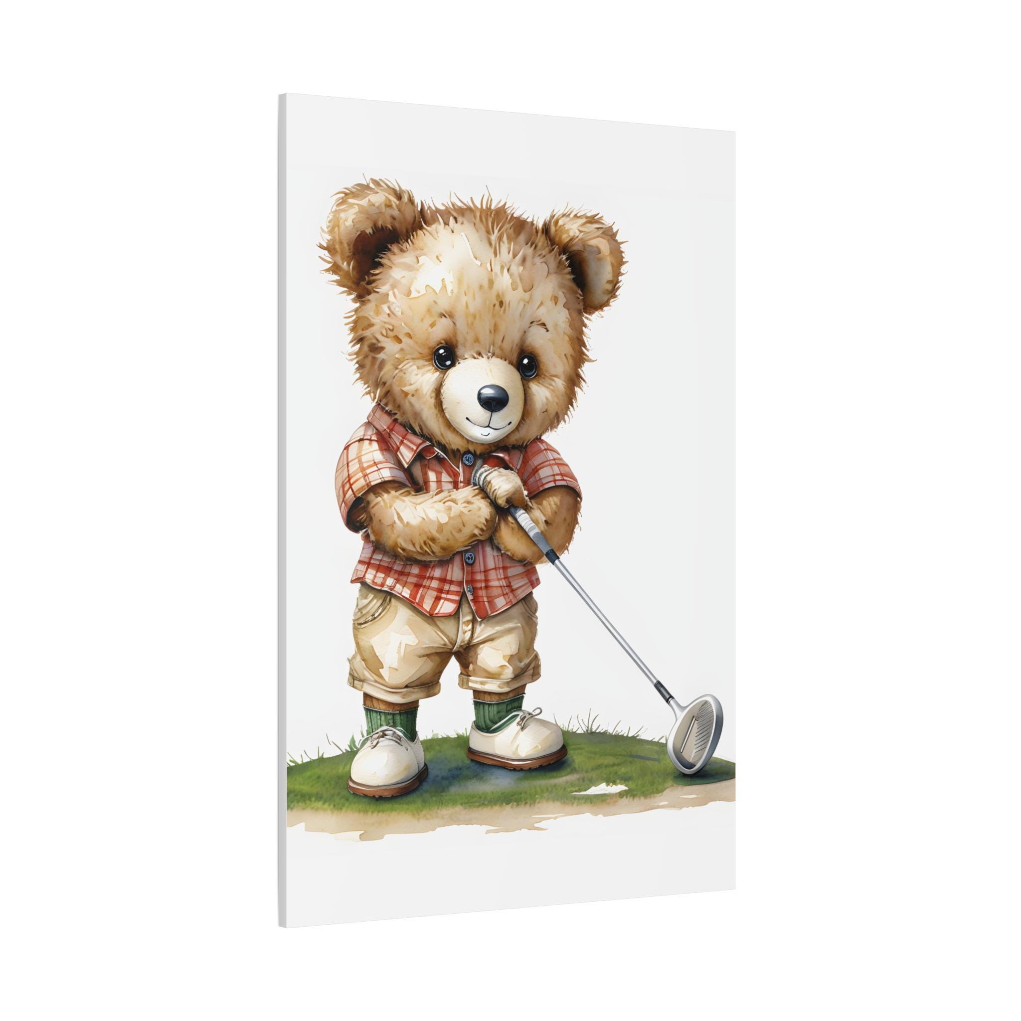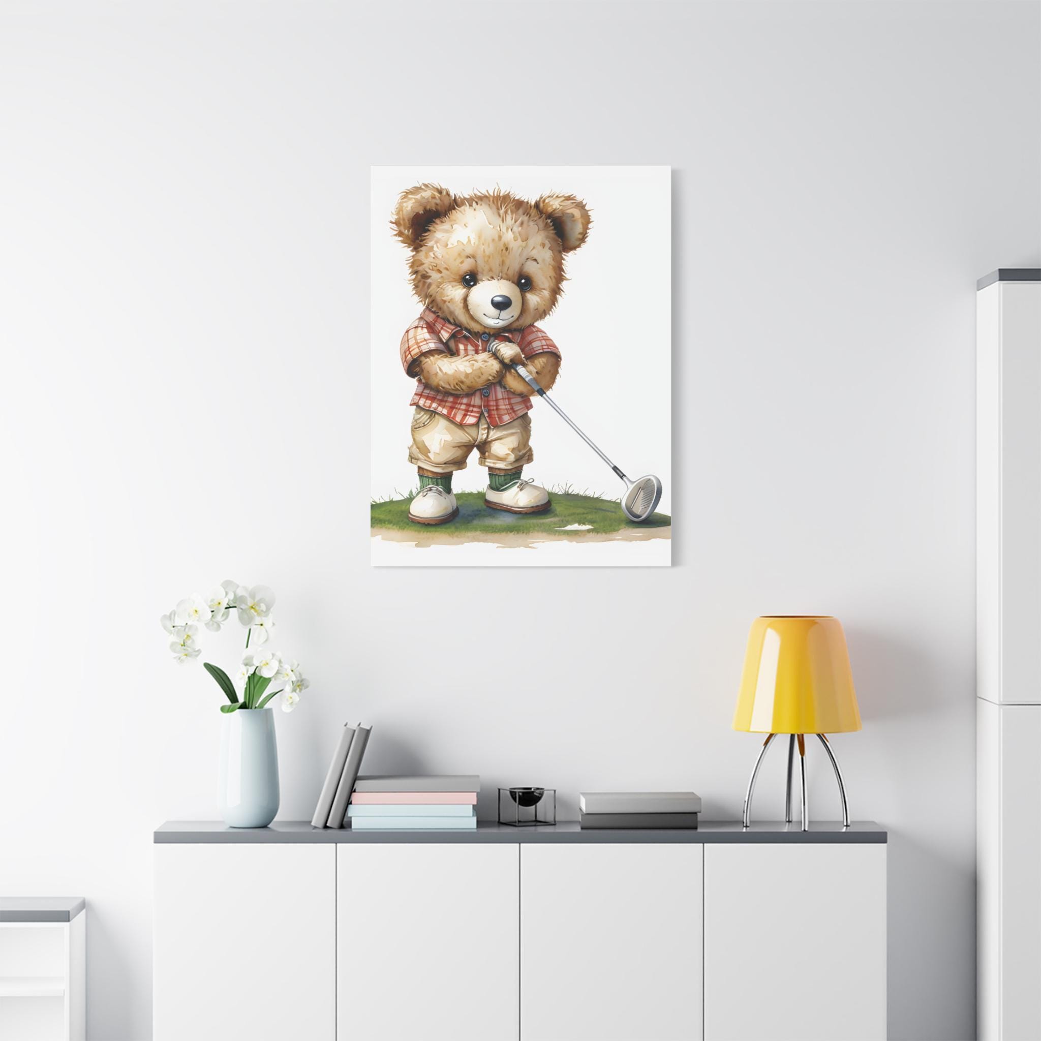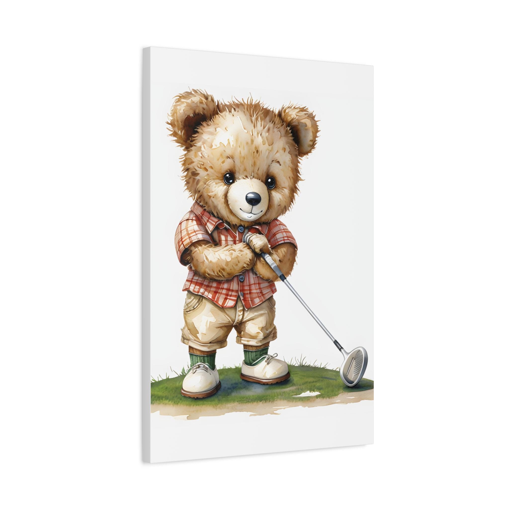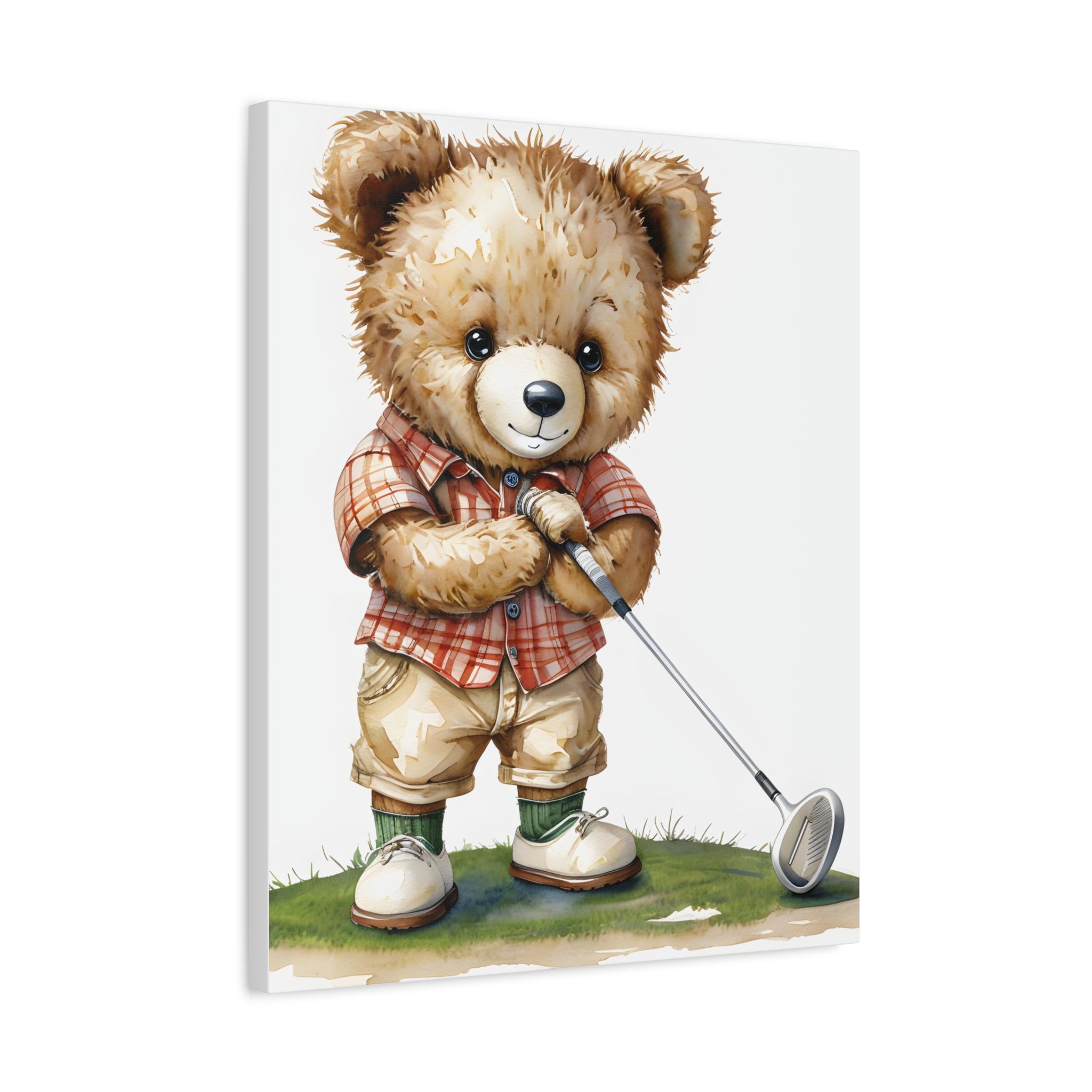 This charming canvas print showcases a little bear in the middle of a golf swing, bringing a smile to any room. Perfect for golf lovers or those who appreciate cute, whimsical art, this piece adds a playful touch to nurseries, kids' rooms, or golf-themed spaces. The bear's adorable concentration and golf attire make this canvas a delightful addition that celebrates the joy of sports in a light-hearted way. A great gift for any occasion or a fun decor choice for anyone who loves the blend of nature and leisure.