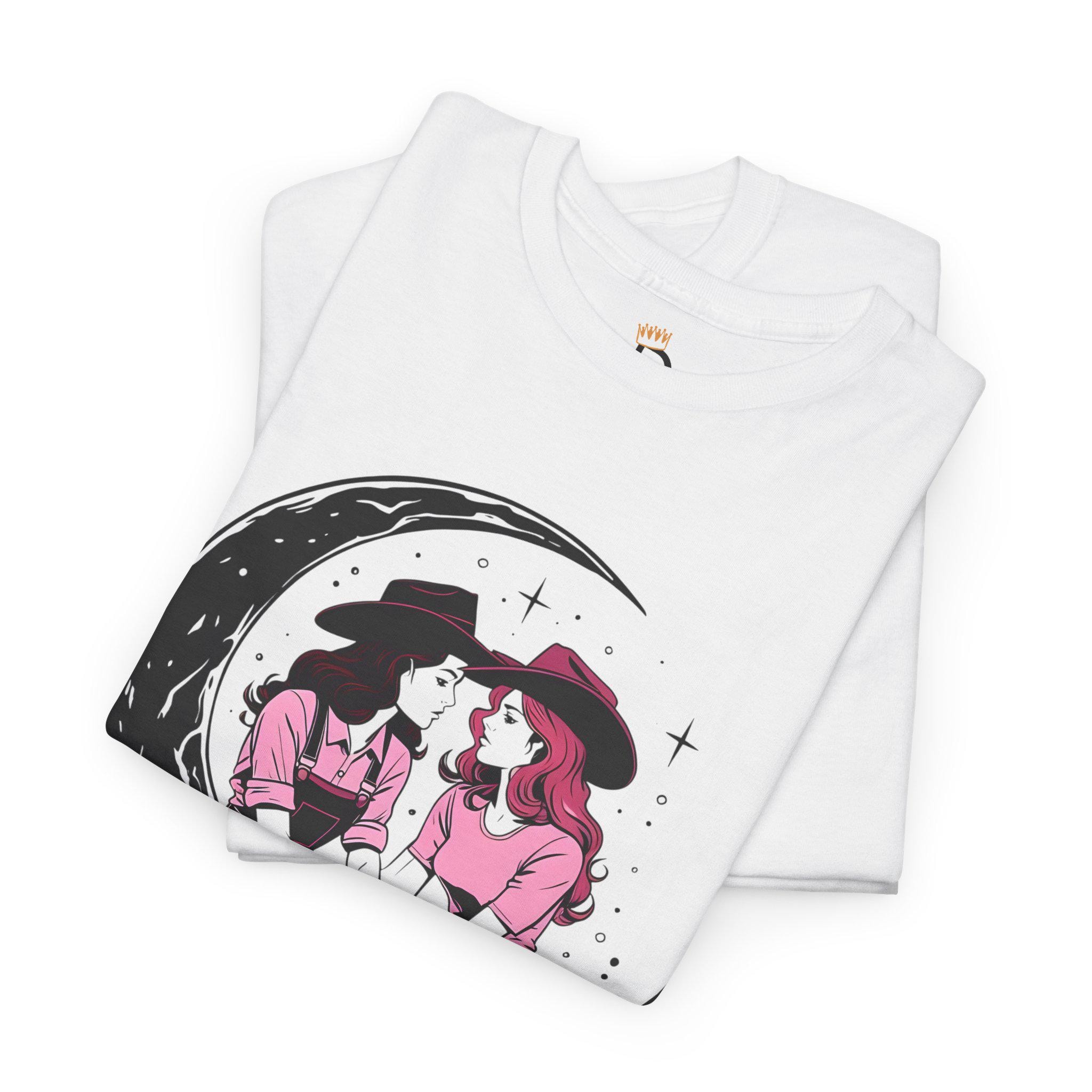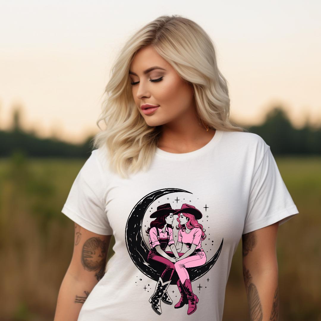 Fun, eye-catching graphic of two cowgirls on a crescent moon