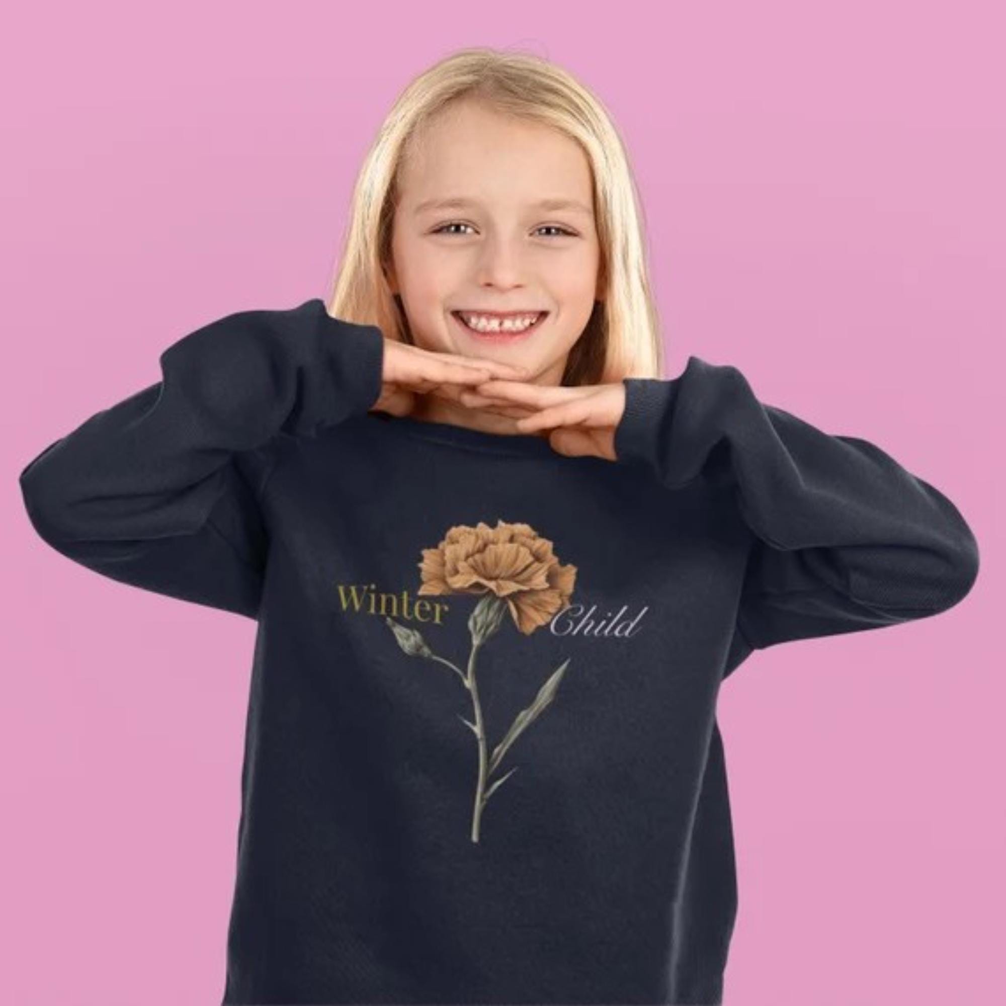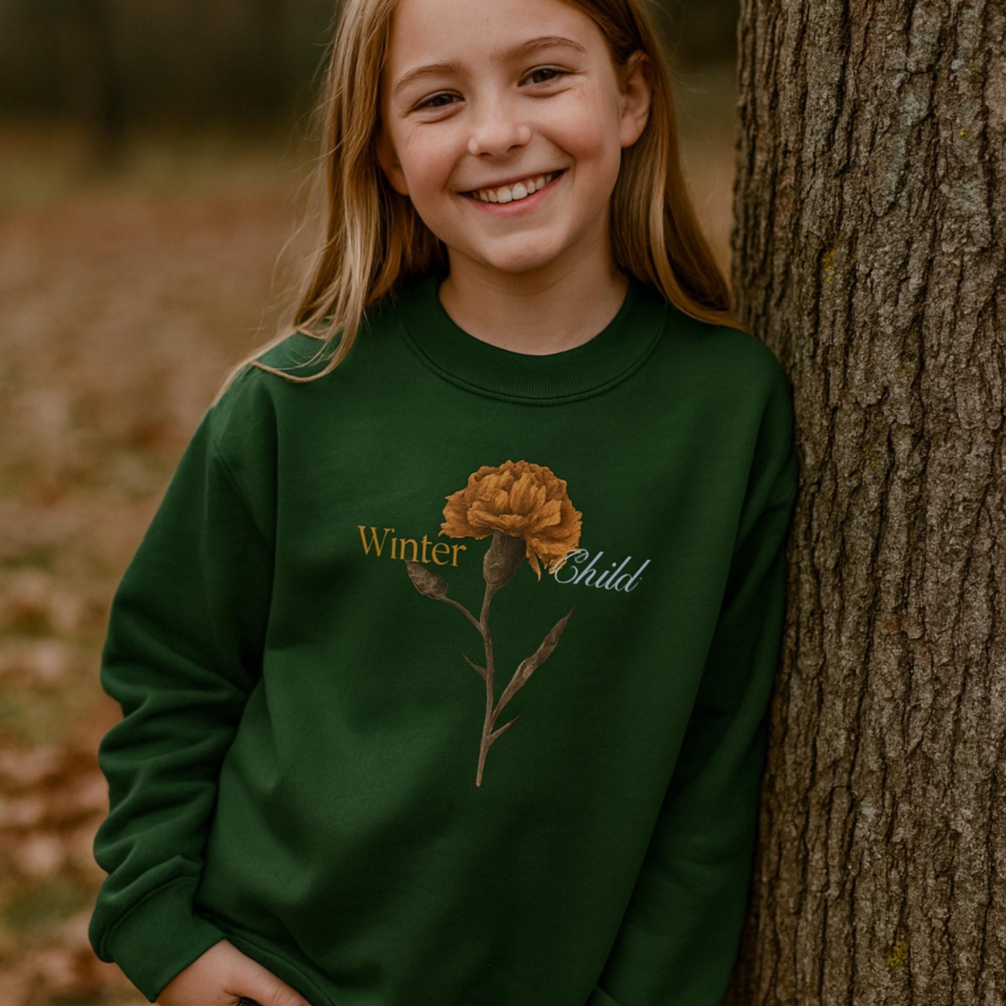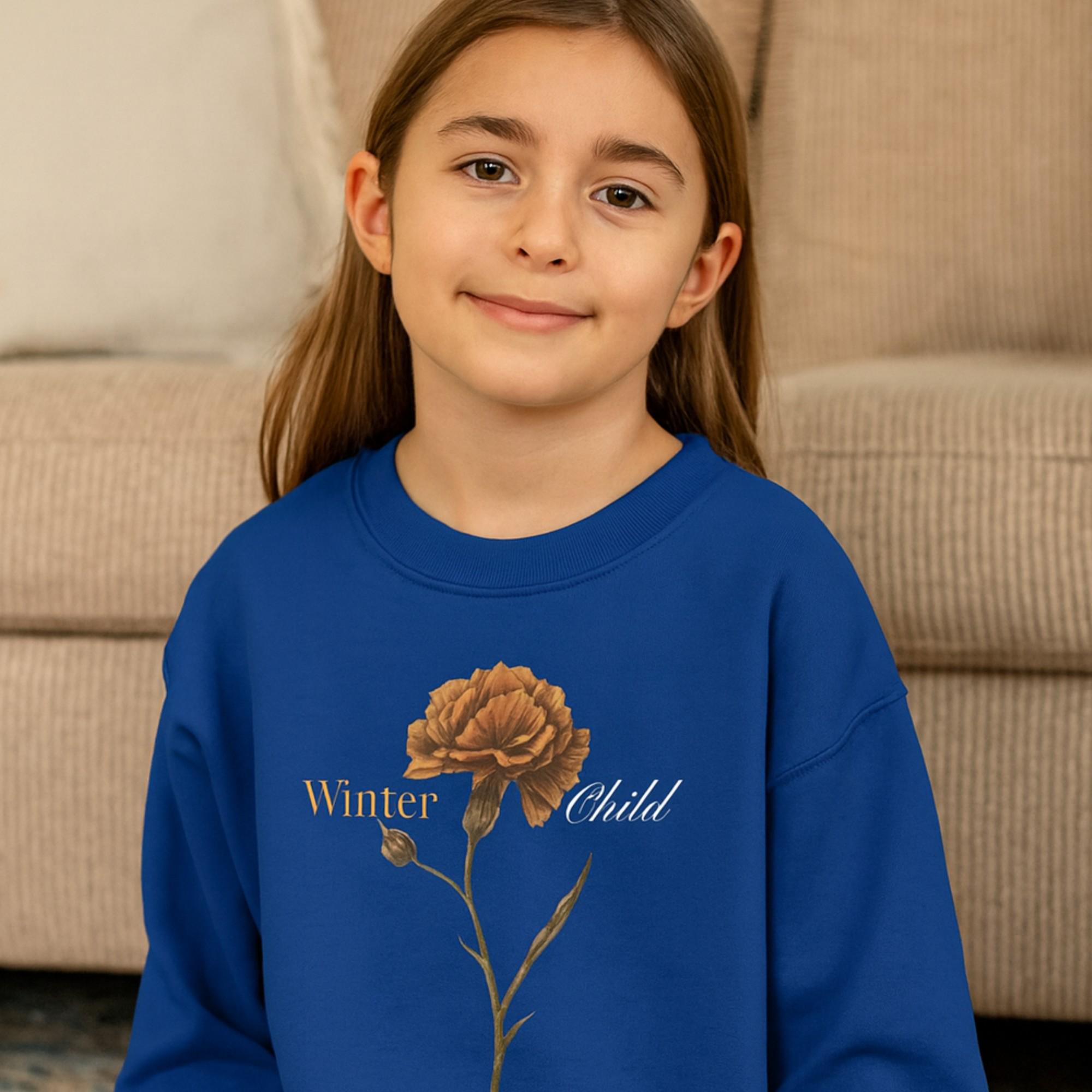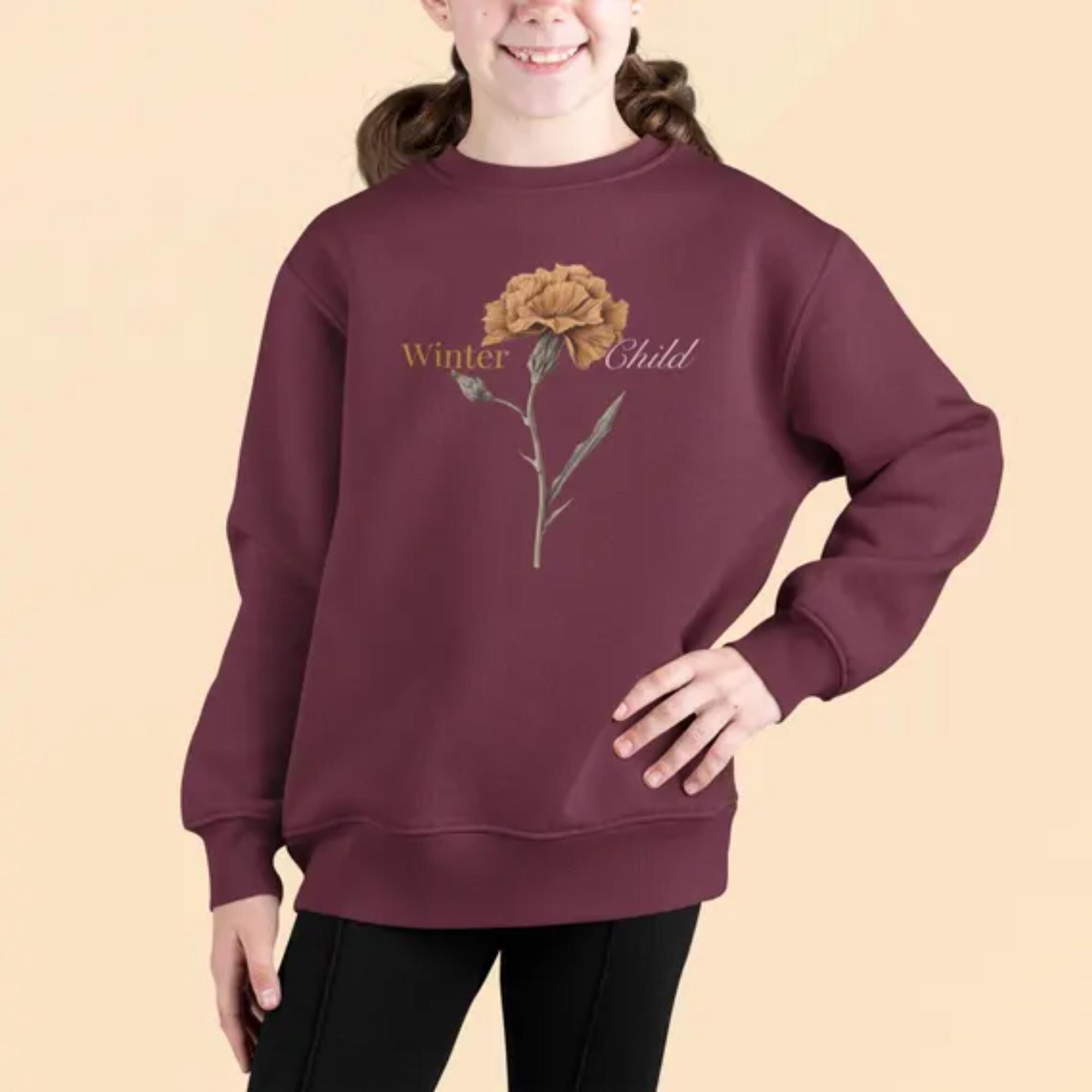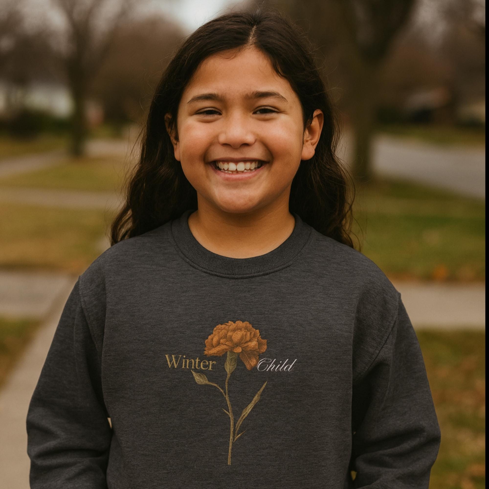 Celebrate a January birthday in style with this Winter Child youth sweatshirt, featuring the delicate carnation birth flower. Designed for those who embrace the magic of winter, this cozy crewneck combines vintage floral charm with modern comfort. Made with soft, high-quality fabric, it's perfect for everyday wear. Whether you're gifting a January-born friend, a birthday girl, or celebrating yourself, this personalized birth month sweatshirt is a timeless piece. Available in multiple colors and sizes. A must-have for winter babies!