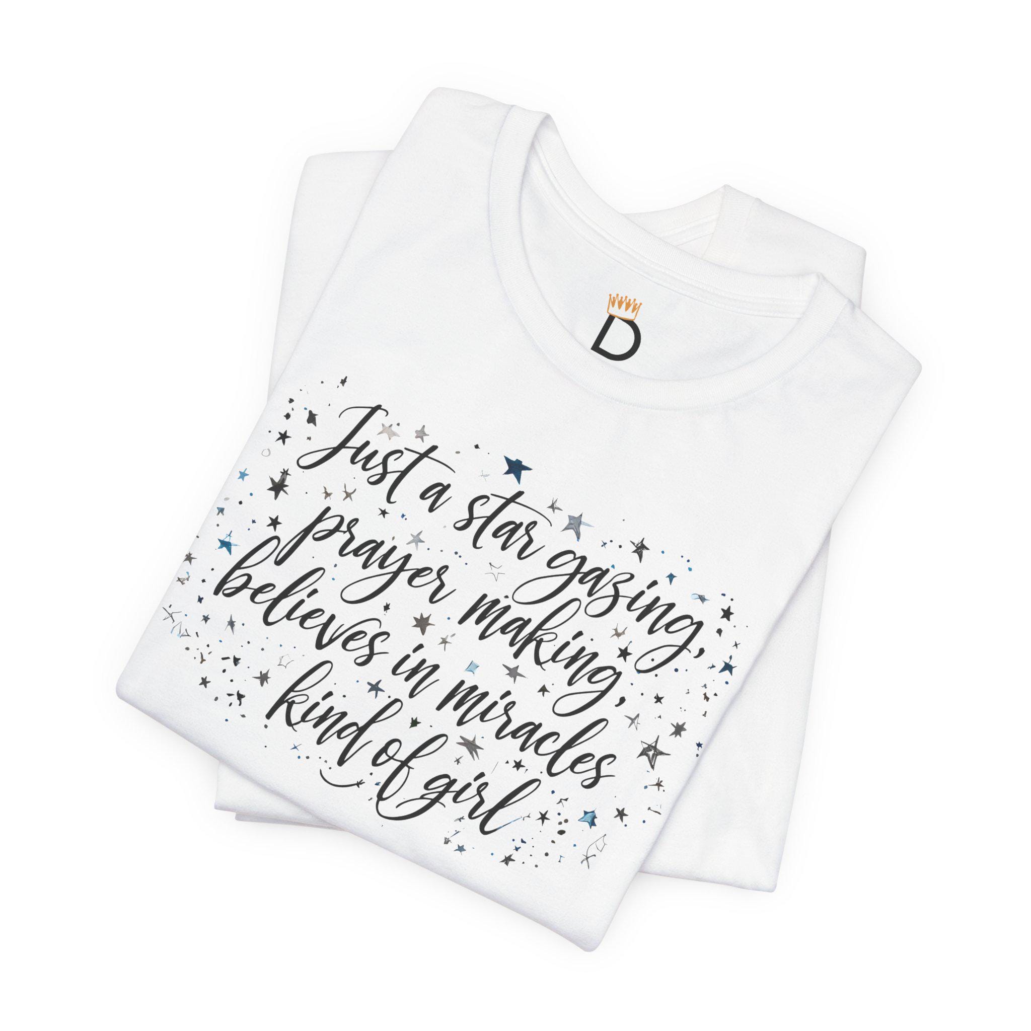 For the dreamers, believers, and those who find hope in the stars, this Just a Star Gazing, Prayer Making, Believes in Miracles Kind of Girl T-shirt is the perfect way to express your faith, wonder, and celestial spirit. Made with the super-soft Bella + Canvas 3001 fabric, this lightweight and breathable tee is perfect for stargazing nights, quiet moments of prayer, or simply sharing your belief in miracles. Whether you're a spiritual soul, a night sky lover, or someone who carries hope wherever you go, this inspirational T-shirt is a must-have.