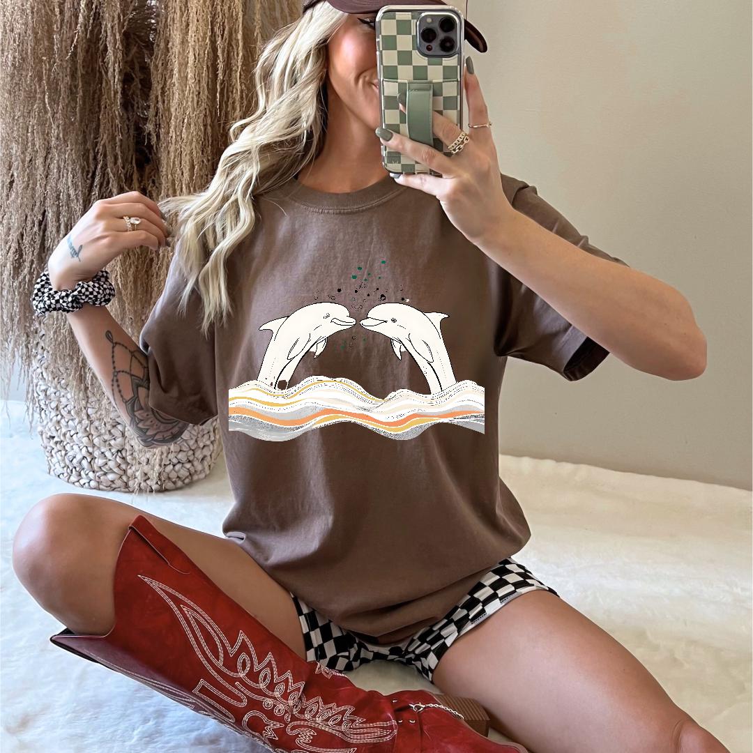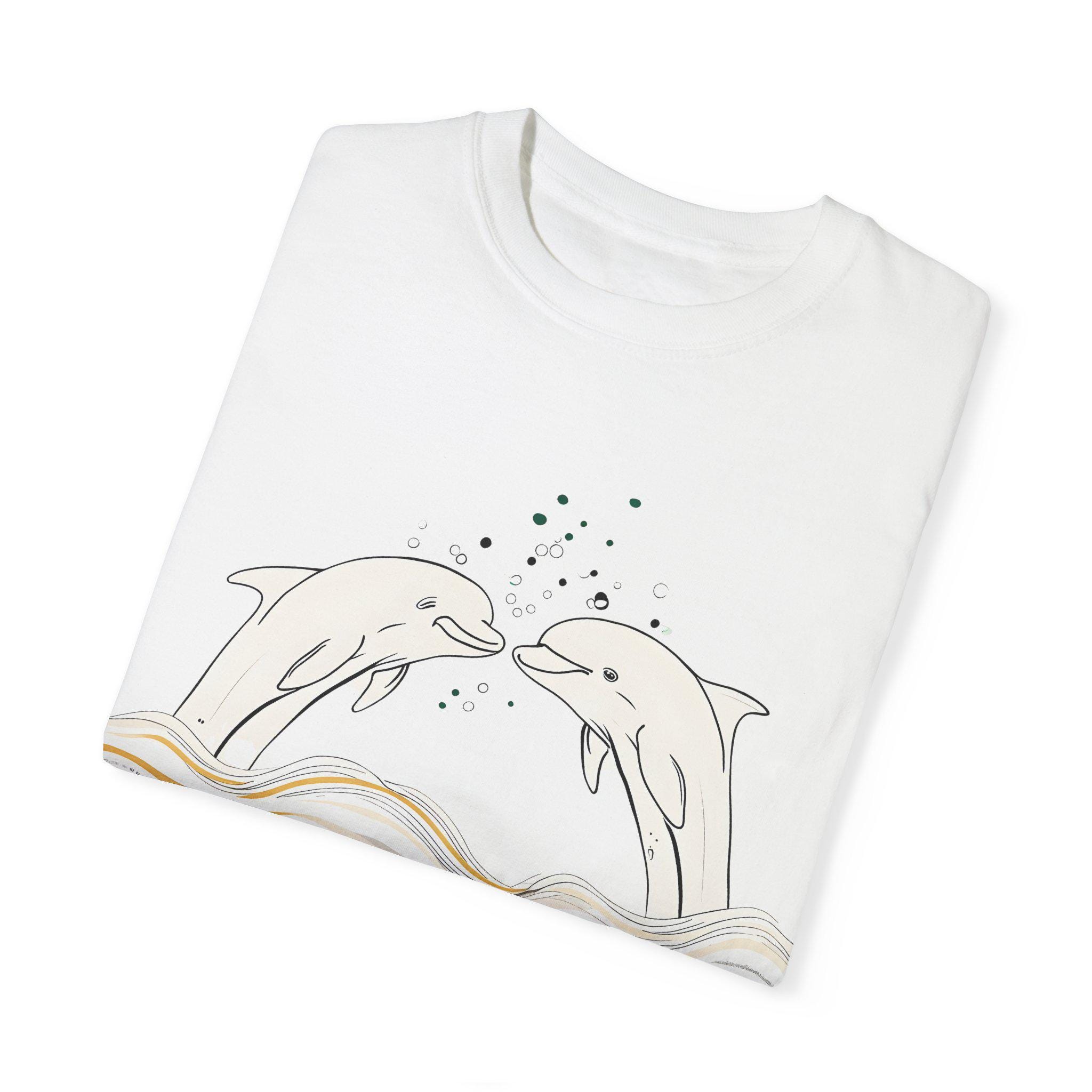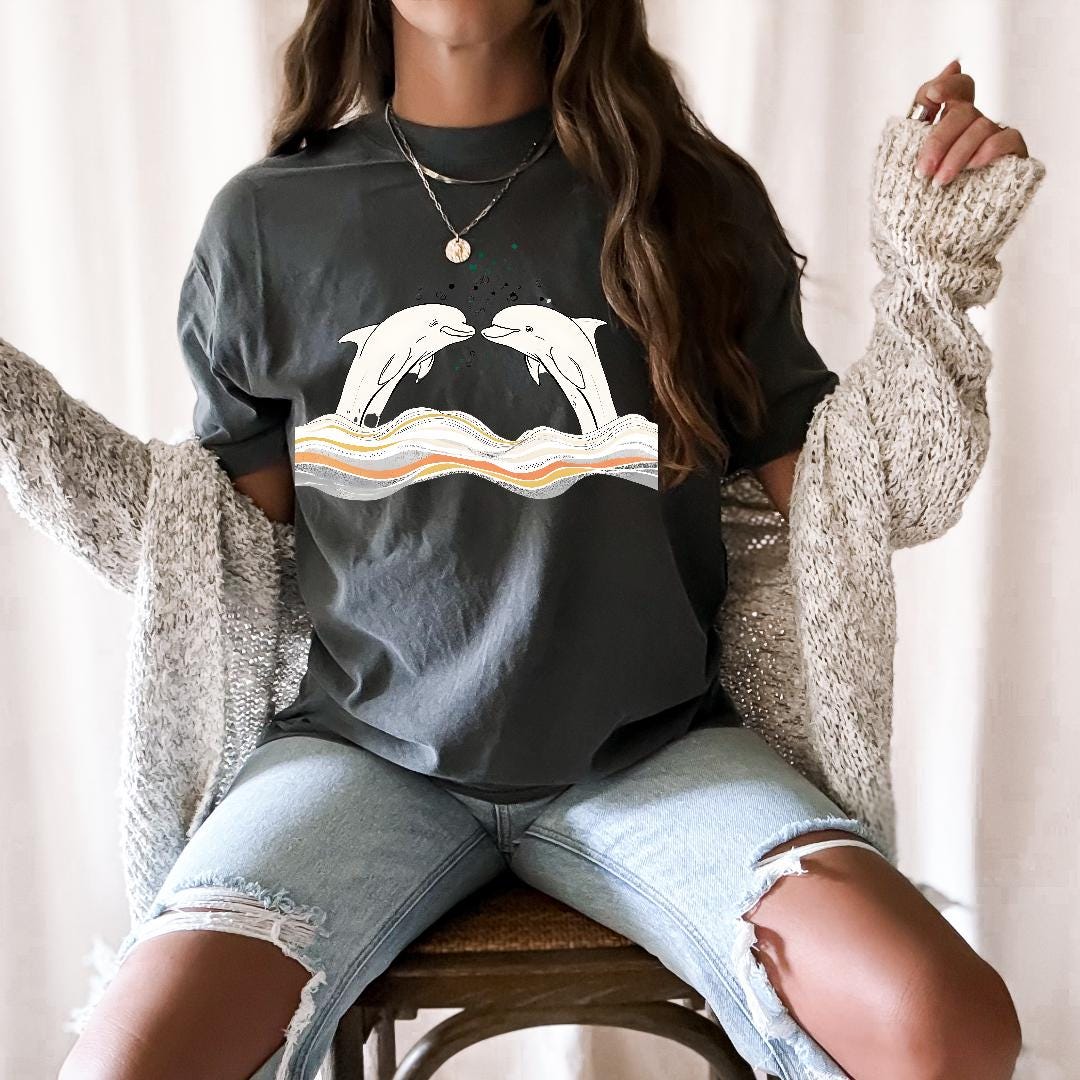 Features a captivating design of two dolphins kissing amidst stylized waves, printed on a super-soft, charcoal gray Comfort Colors tee.