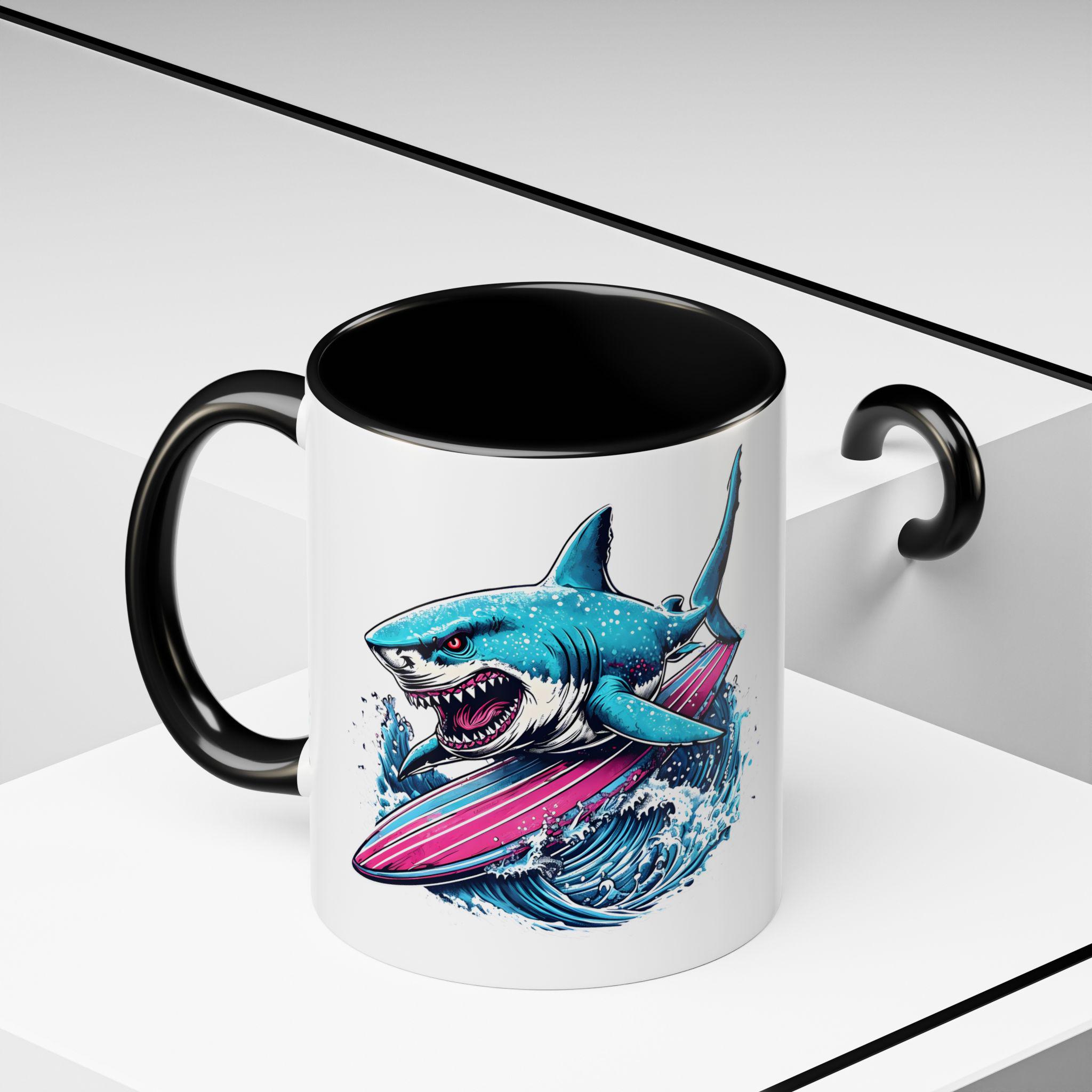 Shark Mug, Coffee Cup with Shark Riding a Surfboard, Surfer Lover Gift, Coastal Vibes, Beach Lover Coffee Mug, Fun Shark Enthusiast Gift