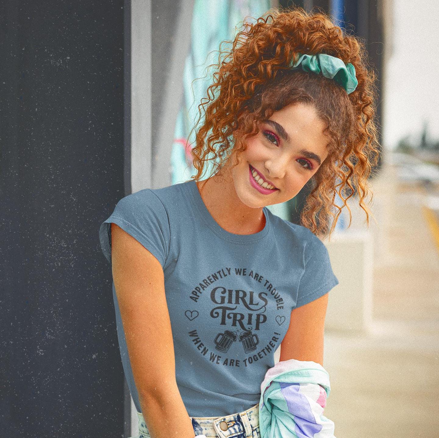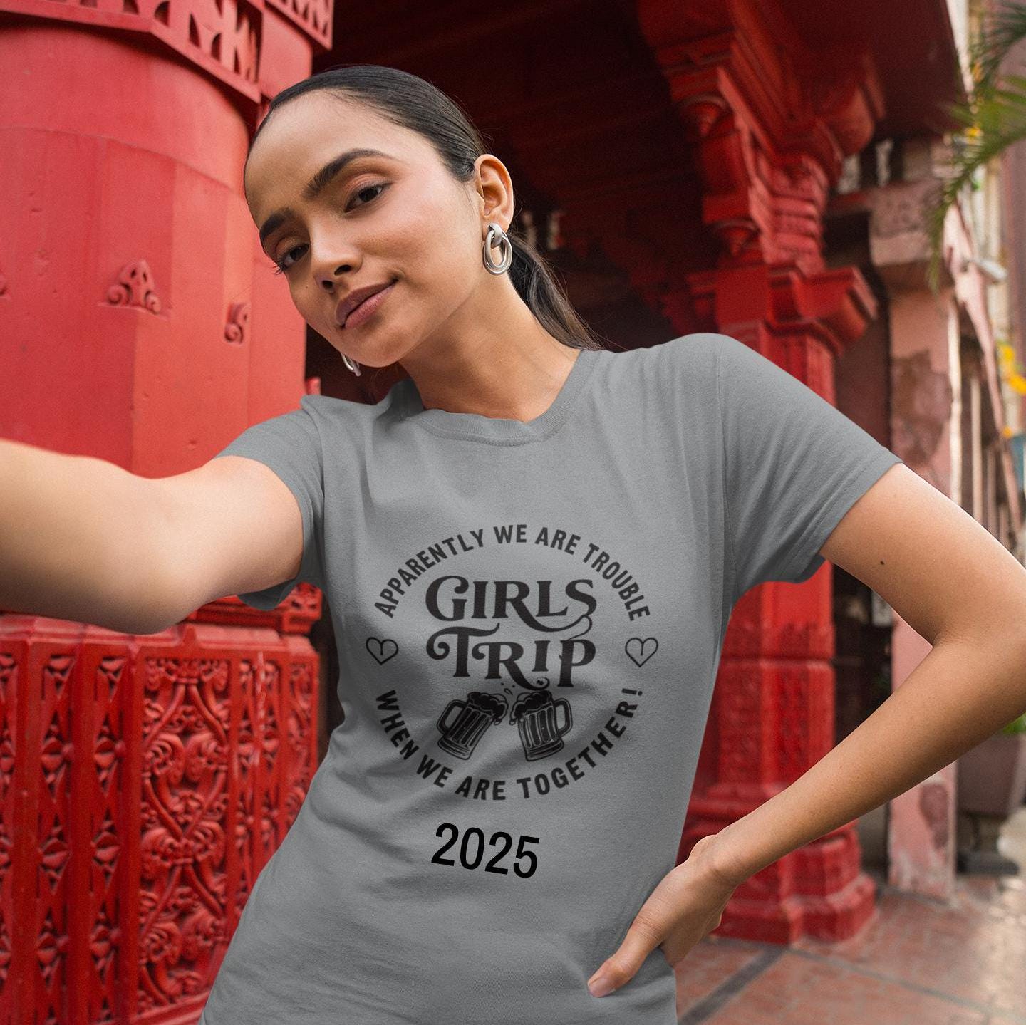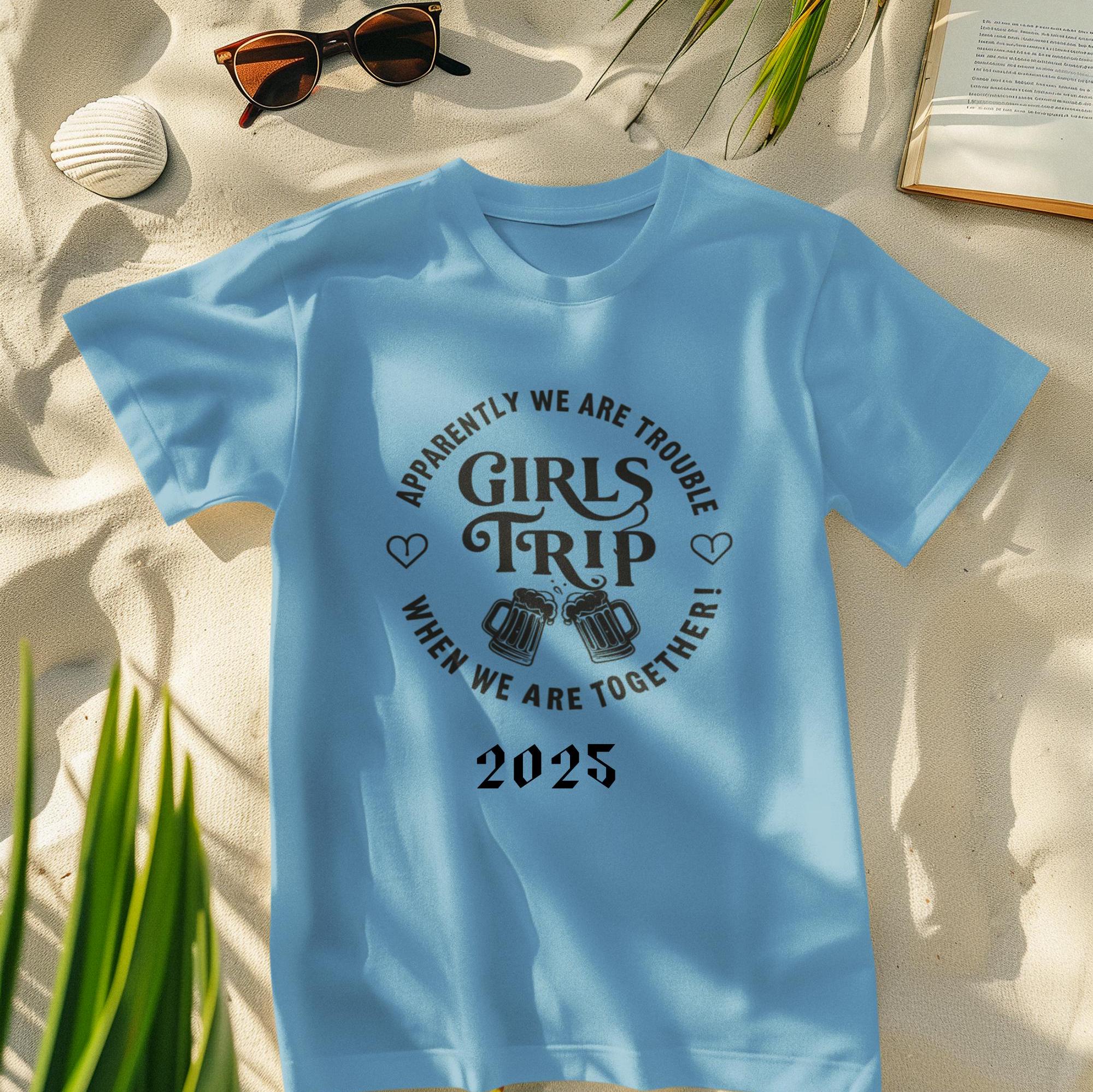 Celebrate your unforgettable girls' trip with this customizable T-shirt! Featuring the playful phrase, "Apparently We’re Trouble When We’re Together," and two cheerful beer mugs, this tee is perfect for bachelorette parties, weekend getaways, or group adventures. Personalize it with your choice of year or location for a unique keepsake. Made from soft, high-quality fabric, it’s as fun to wear as it is to customize. Available in various sizes and colors to suit your crew’s style.