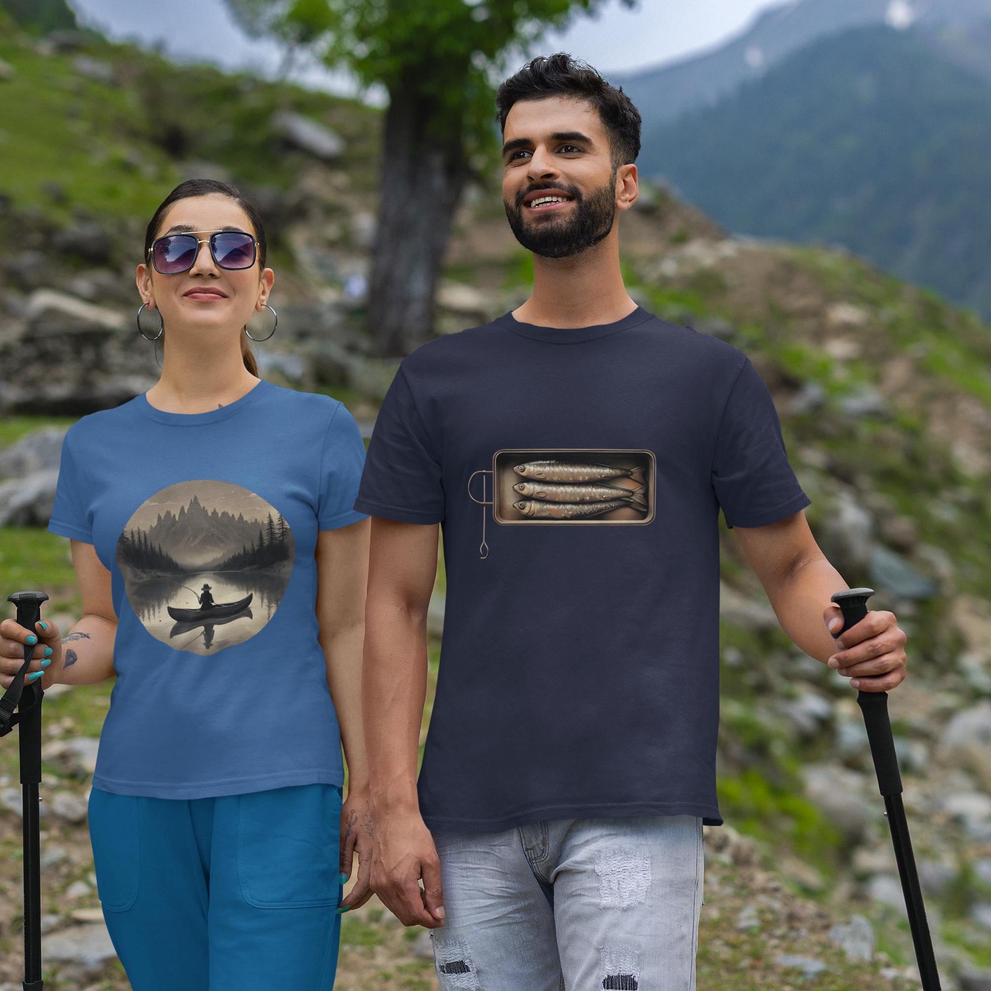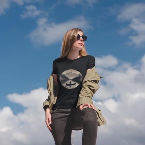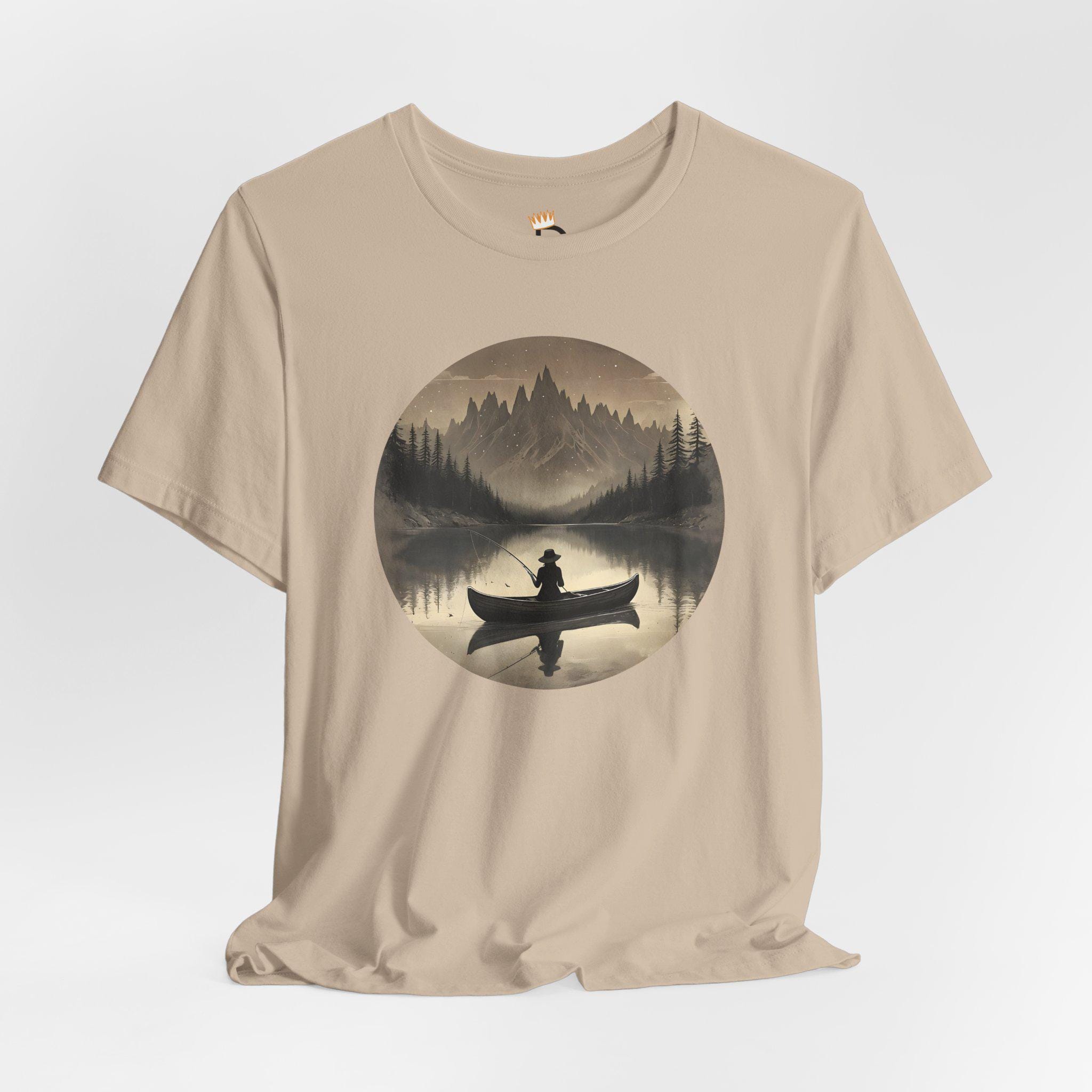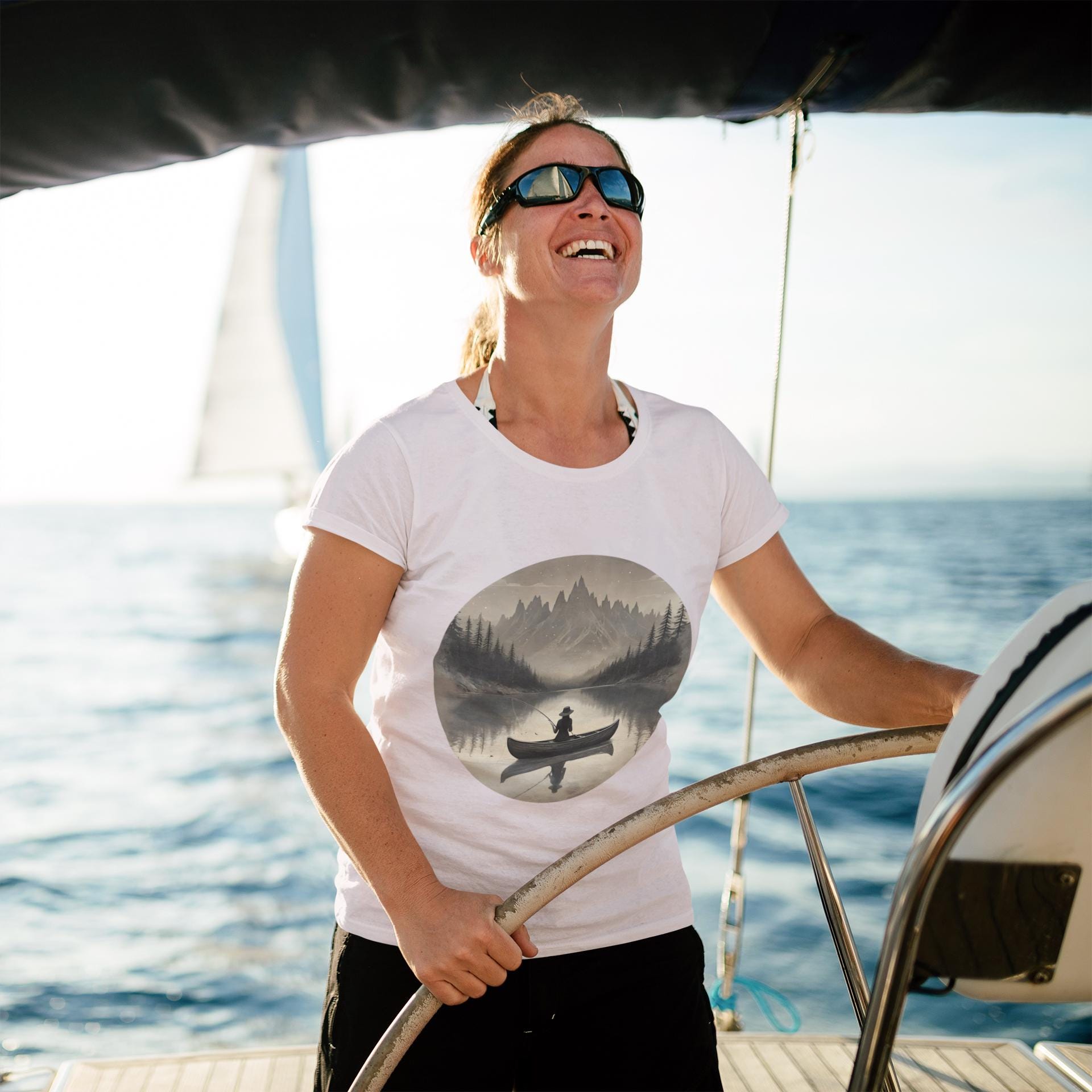 A tranquil and serene scene of a woman fishing in a canoe on a lake surrounded by mountains, perfect for nature lovers and outdoor enthusiasts. This T-Shirt is made with soft and breathable 100% Airlume combed and ring-spun cotton, ideal for layering and active wear. The retail fit and classic crew neckline make it versatile for casual and semi-formal settings, while the tear-away label minimizes skin irritations.
