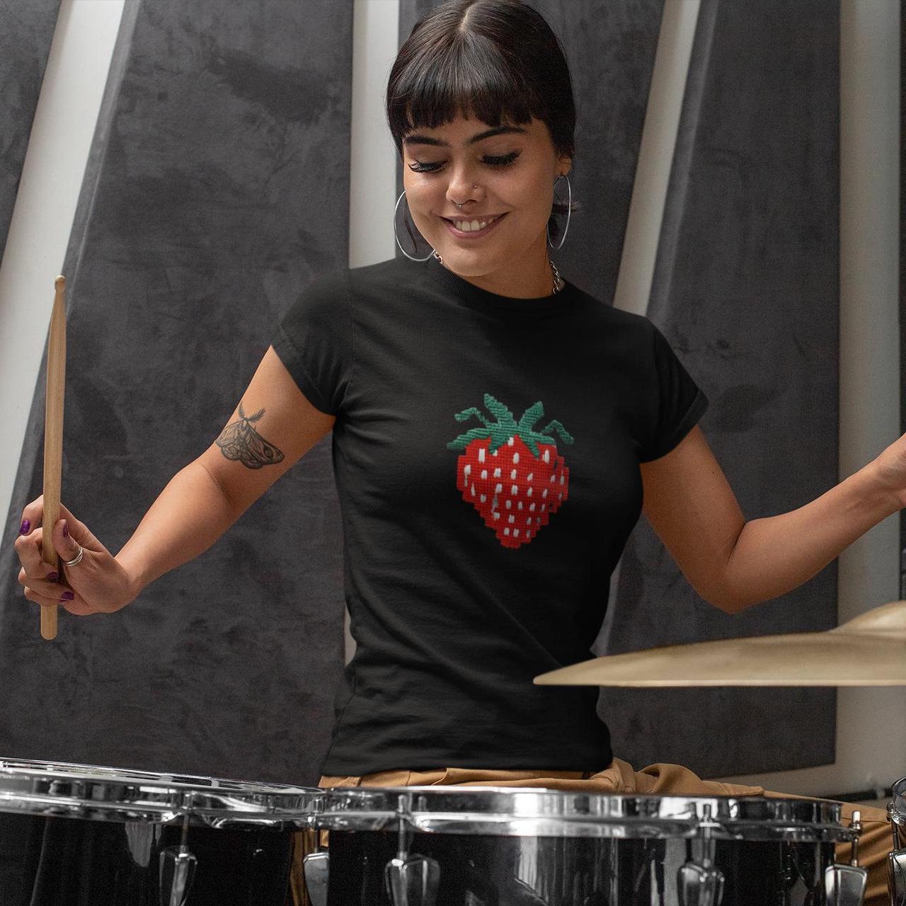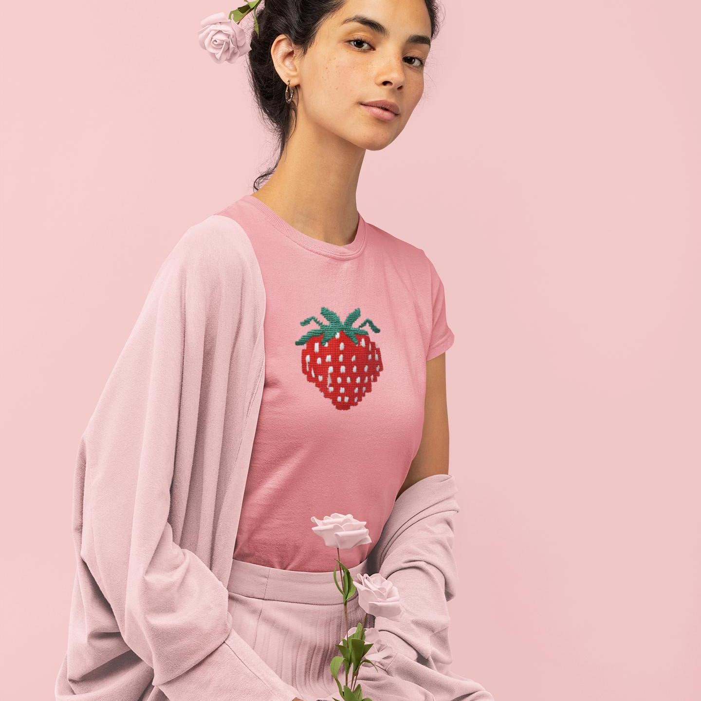 Unique pixel art strawberry design with a knitted look, adding a touch of vintage charm
