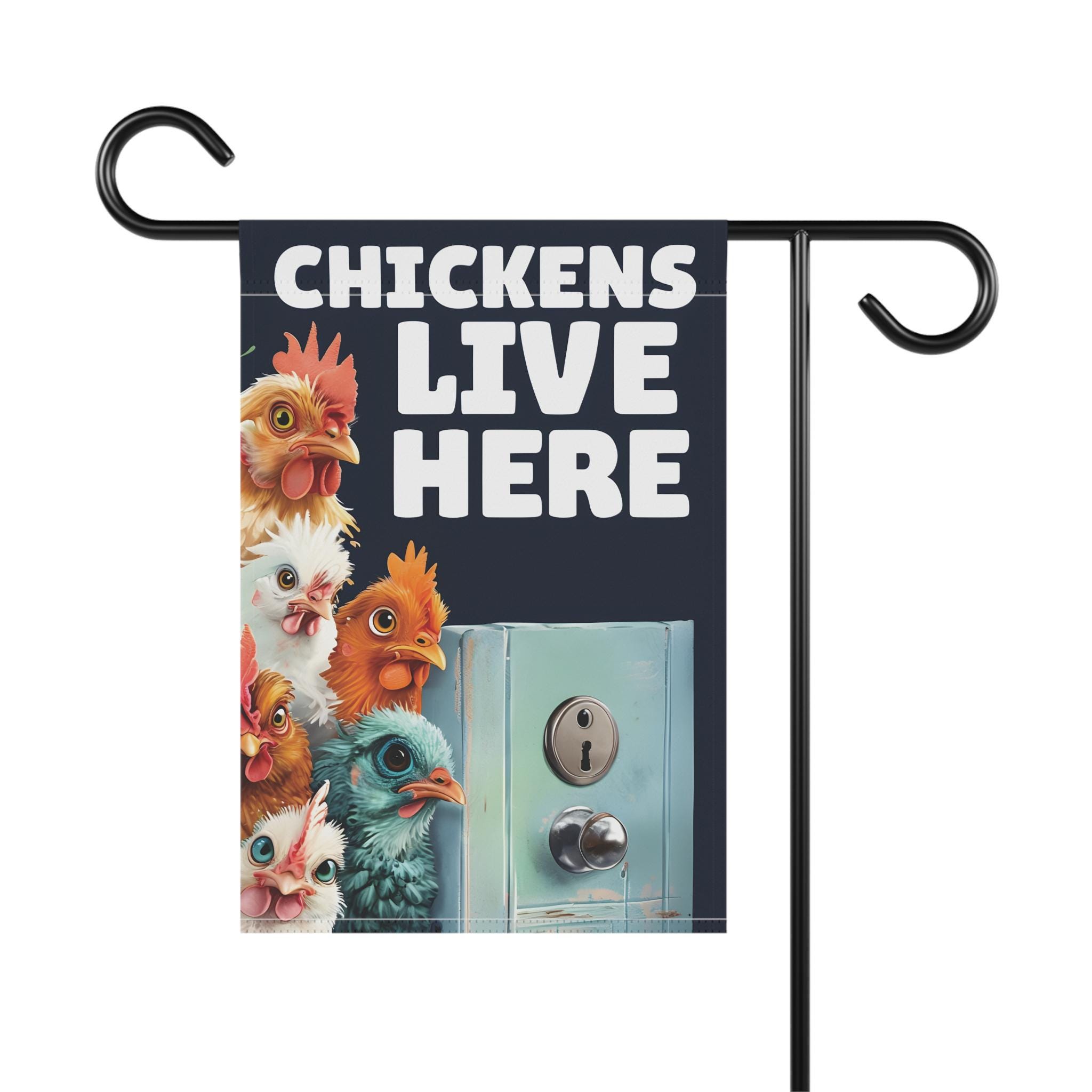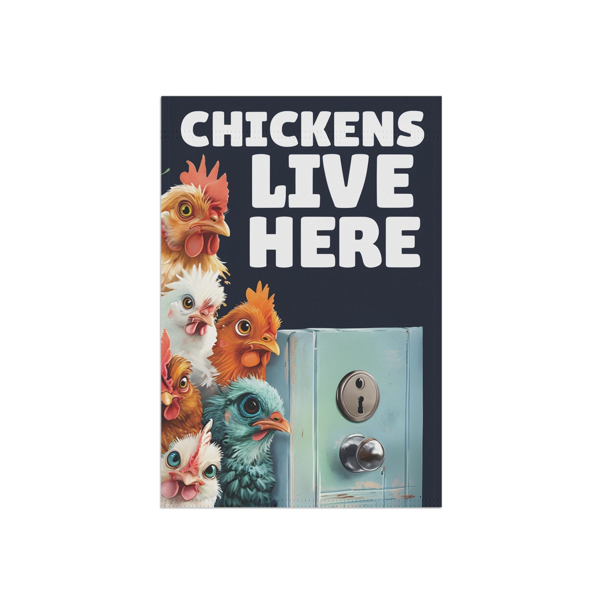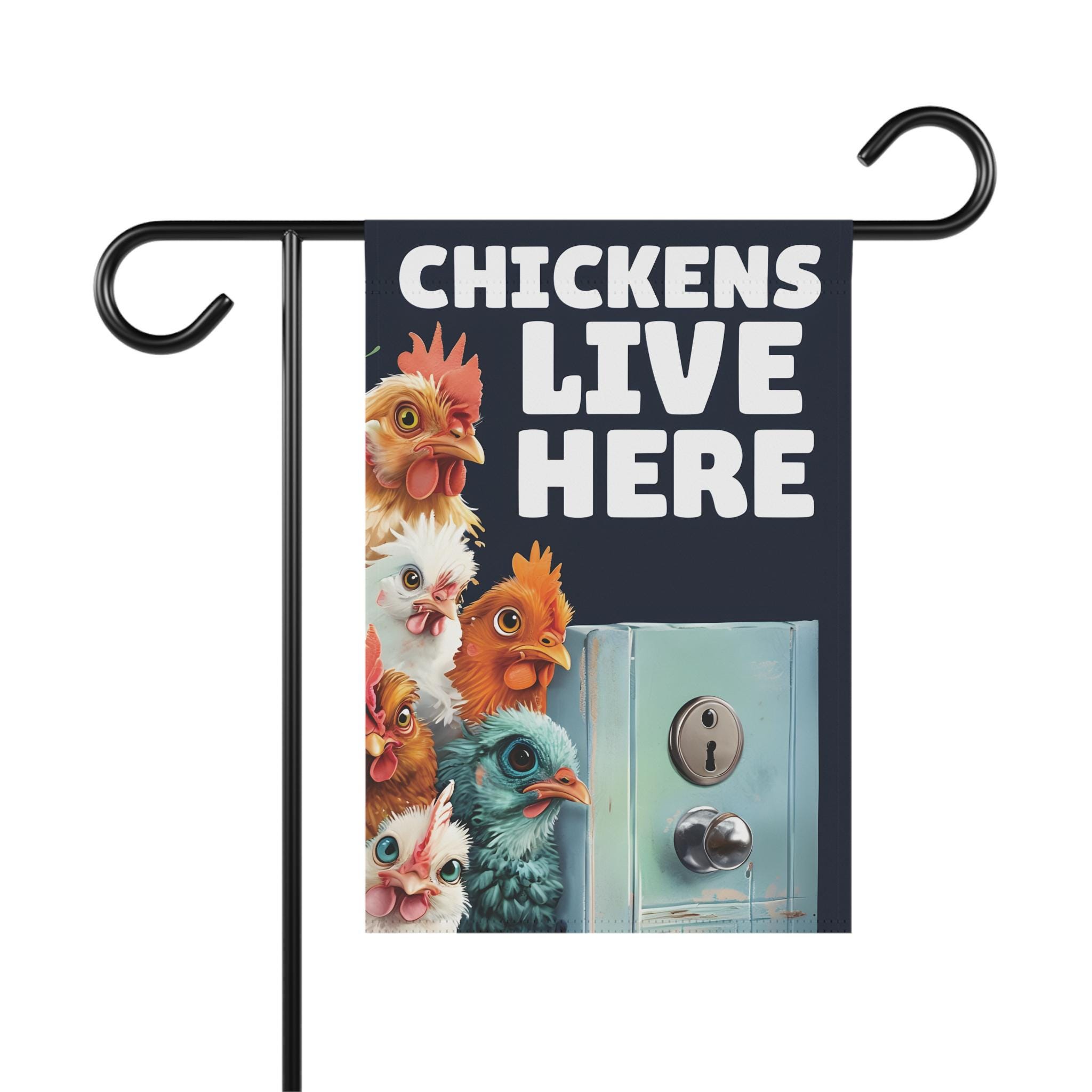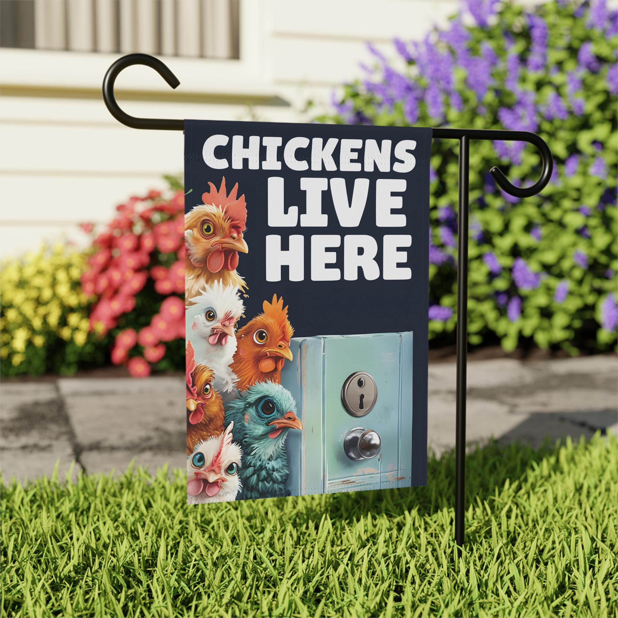 House Banner, Chickens Live here with chickens looking around a door, Garden Flag, Outdoor Yard Sign, Home Decor, Farmhouse Decor, Spring