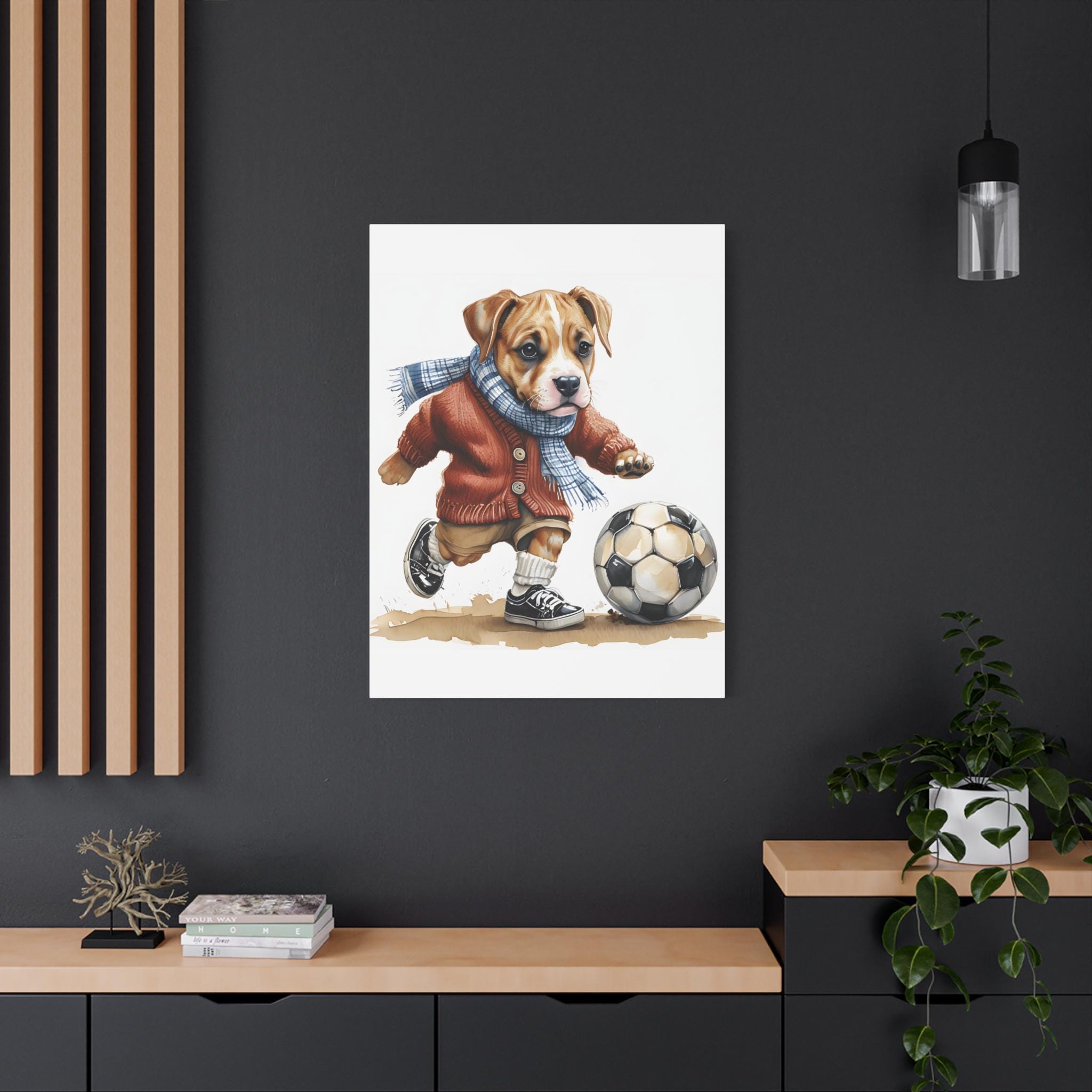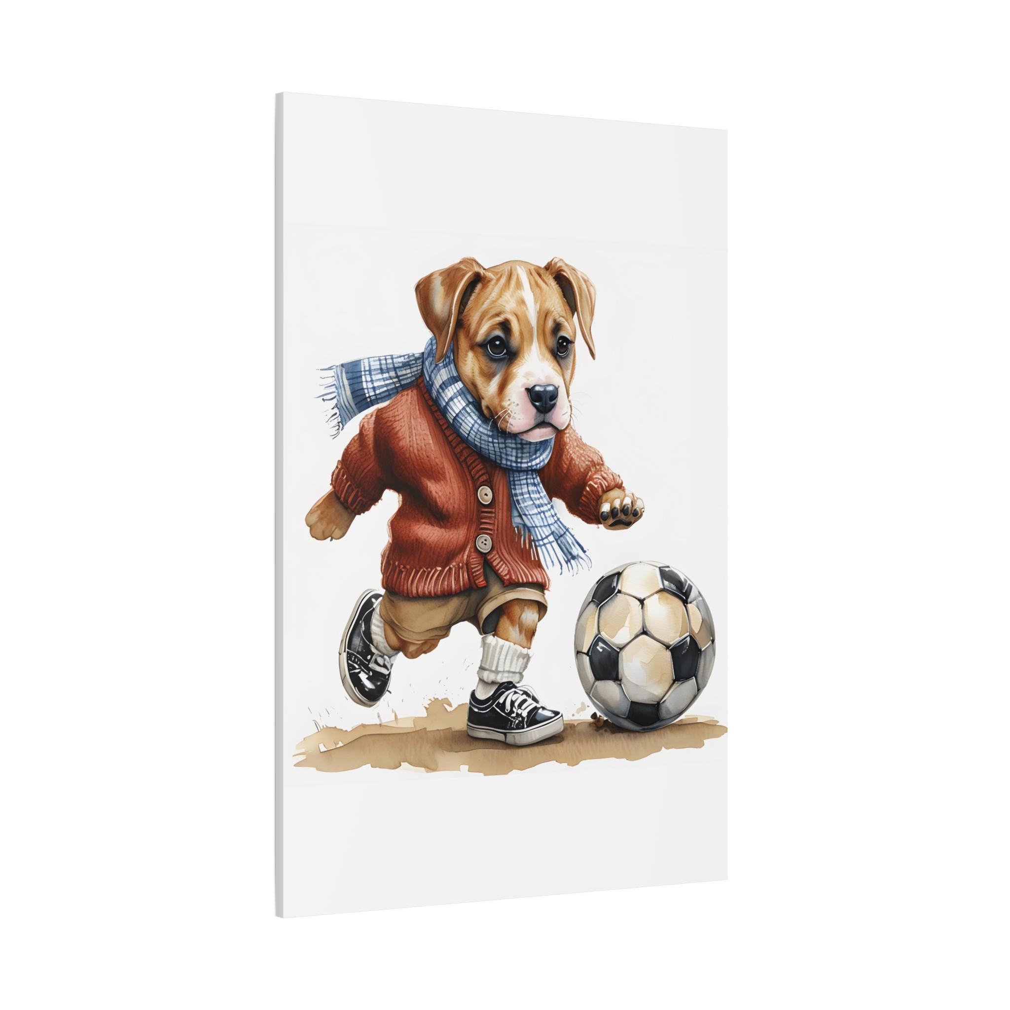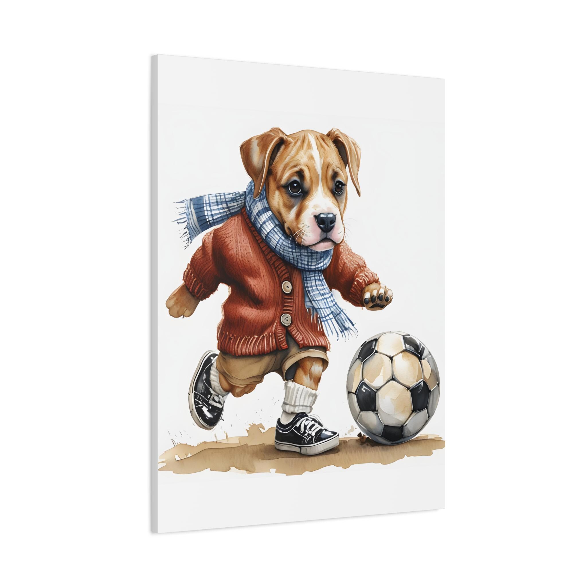 Warm up any space with this adorable canvas print of a dog dressed in a cute sweater and scarf, mid-kick with a soccer ball. This piece is perfect for dog lovers, soccer fans, or anyone who appreciates whimsical, heartwarming art. It's a fantastic addition to homes, nurseries, or sports-themed rooms, bringing a blend of coziness and playfulness. Ideal for those looking for unique decor that celebrates both the love of pets and the spirit of the game, this canvas will surely score in charm and cheer.