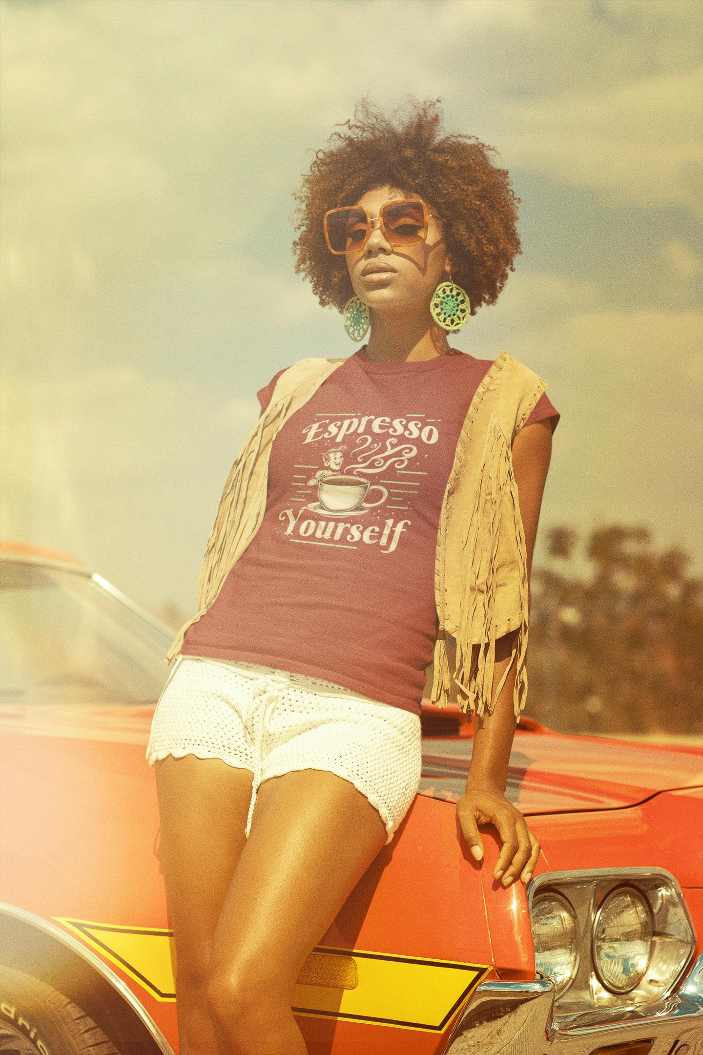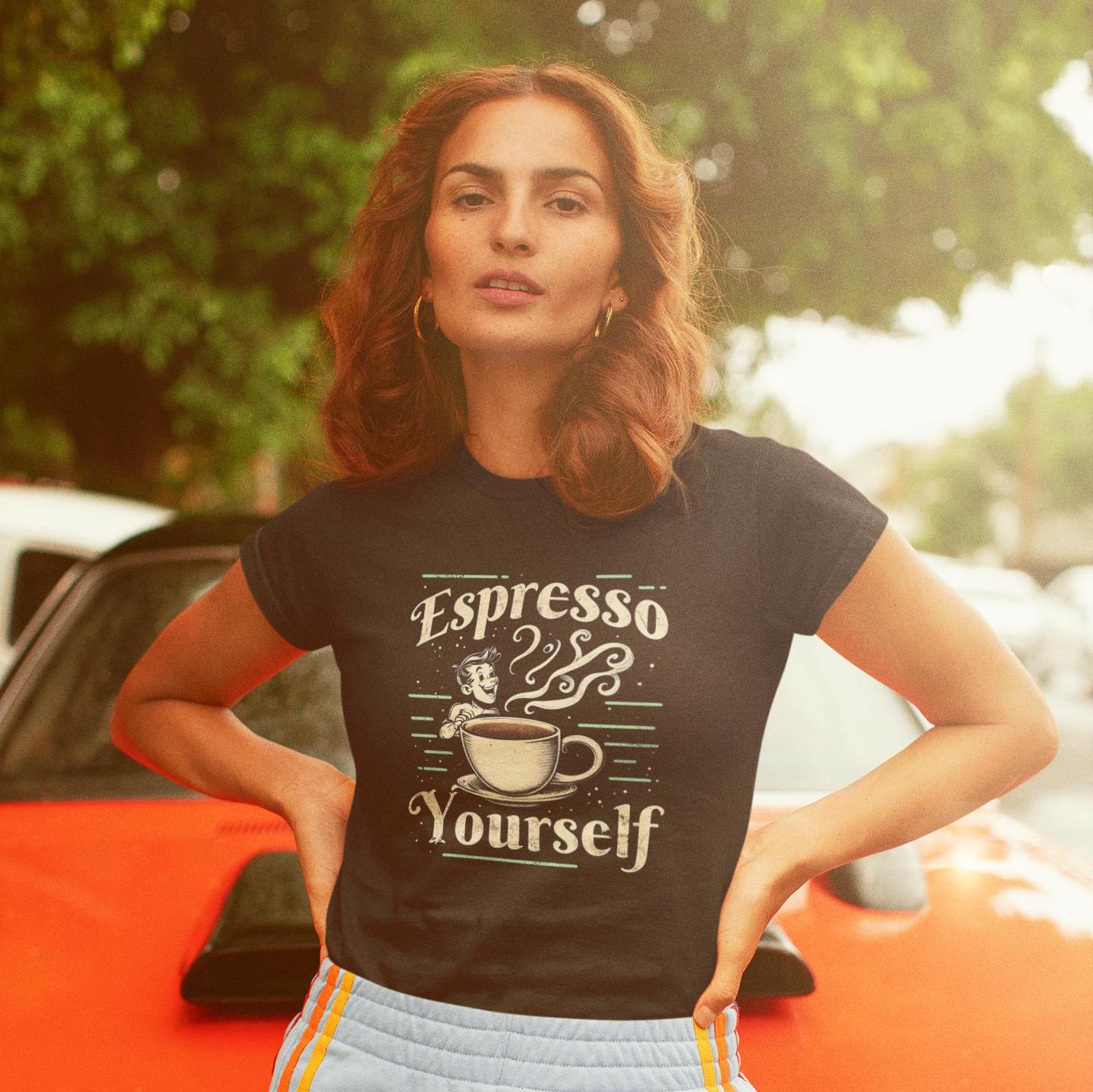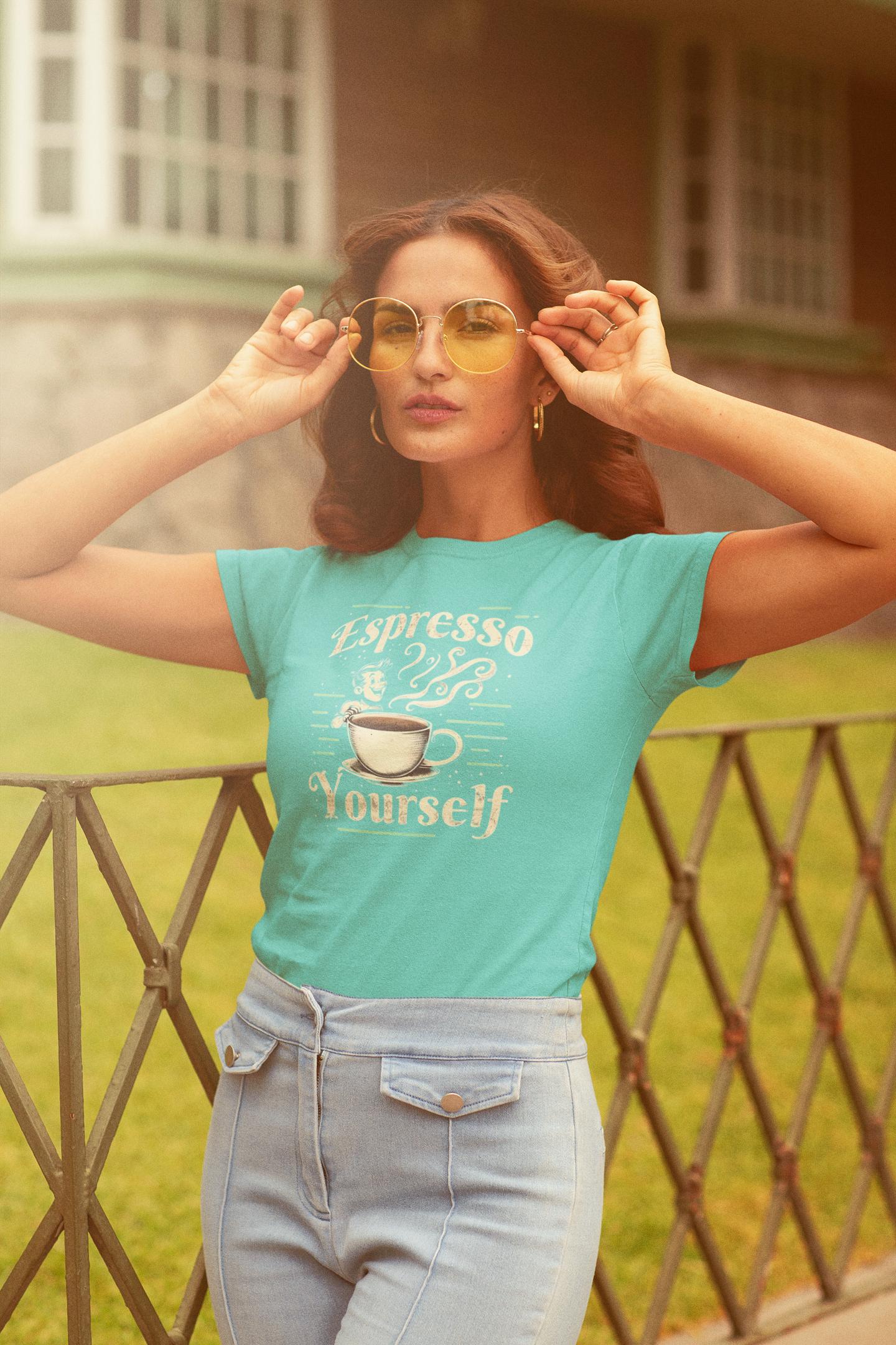 Celebrate your love for vintage coffee culture with this Espresso Yourself Women's Tee, featuring a charming retro coffee cup graphic that speaks directly to caffeine lovers and baristas alike. Crafted with a nod to classic coffeehouse vibes, this fun coffee lover shirt stands out with its authentic design and comfortable fit, making it an ideal gift or daily wear for anyone passionate about their brew.