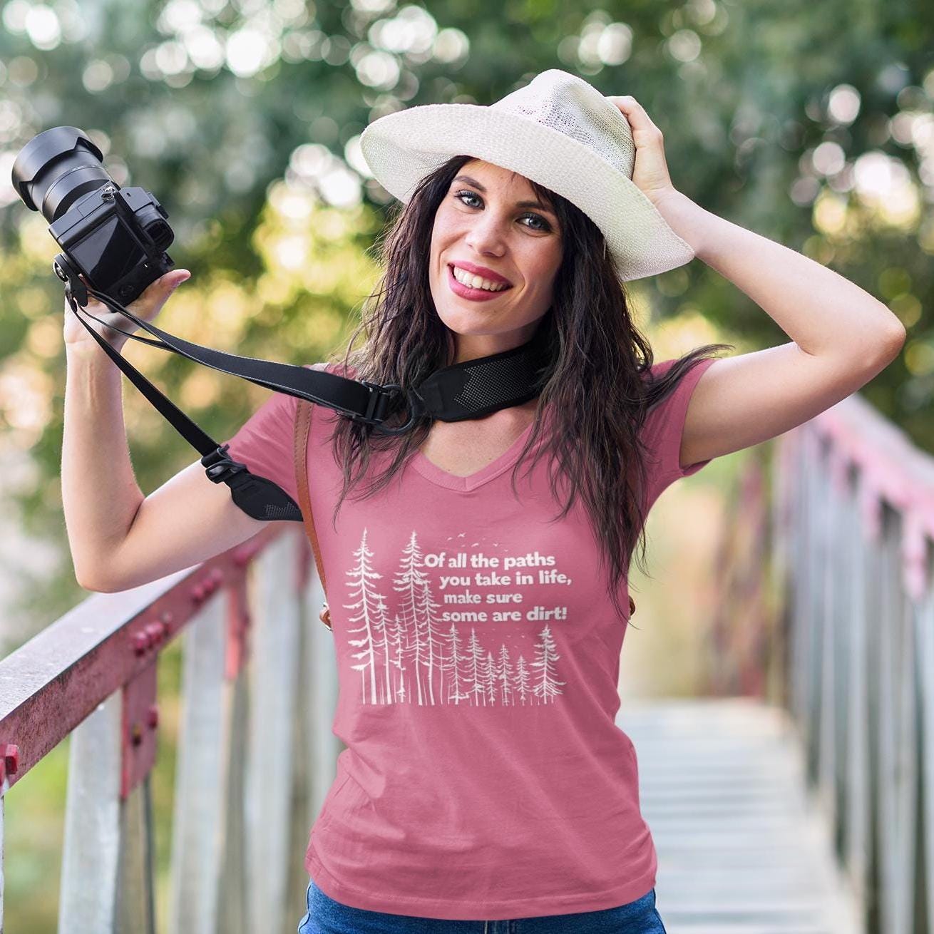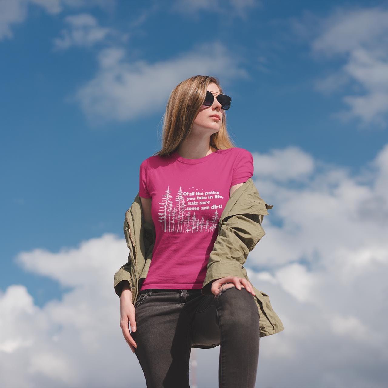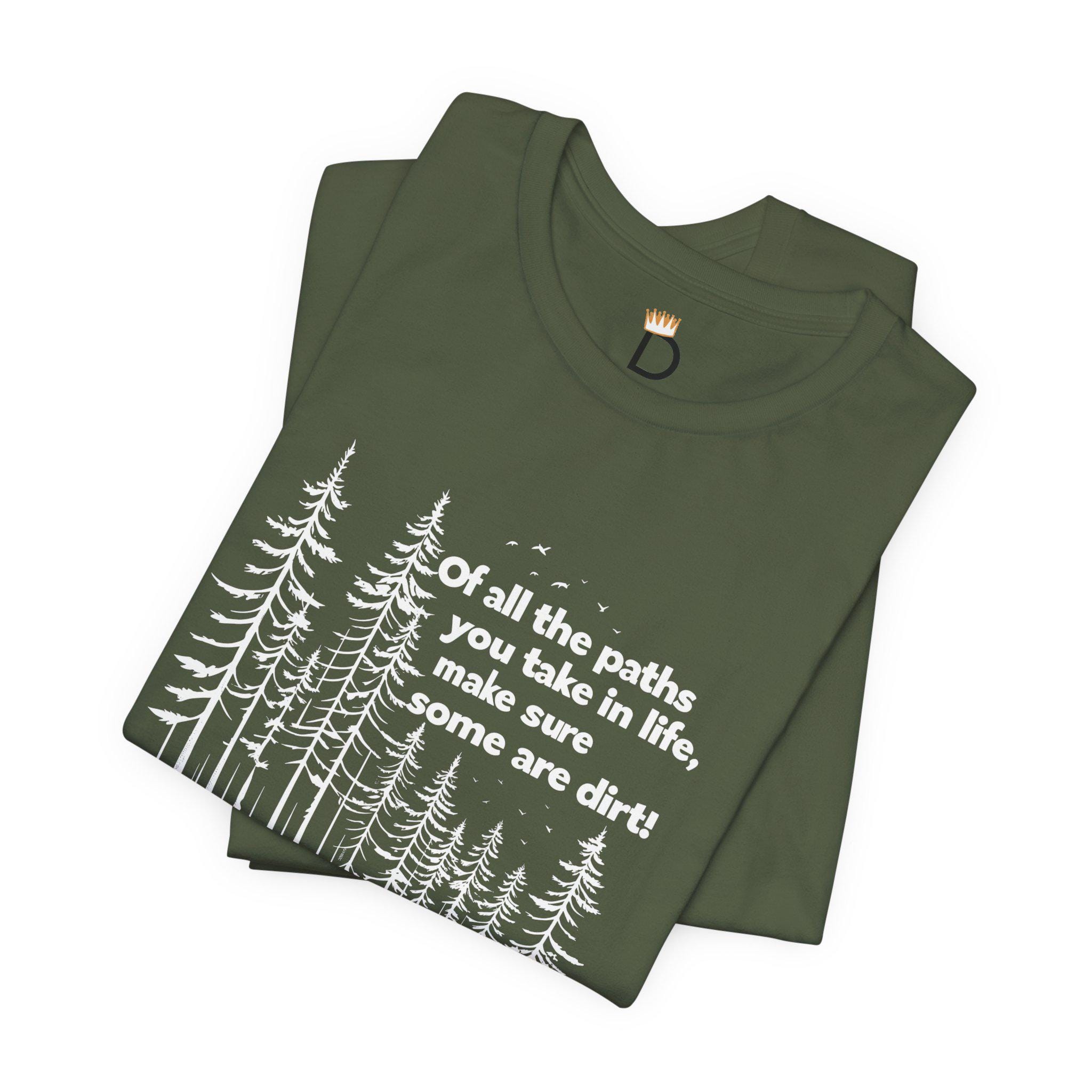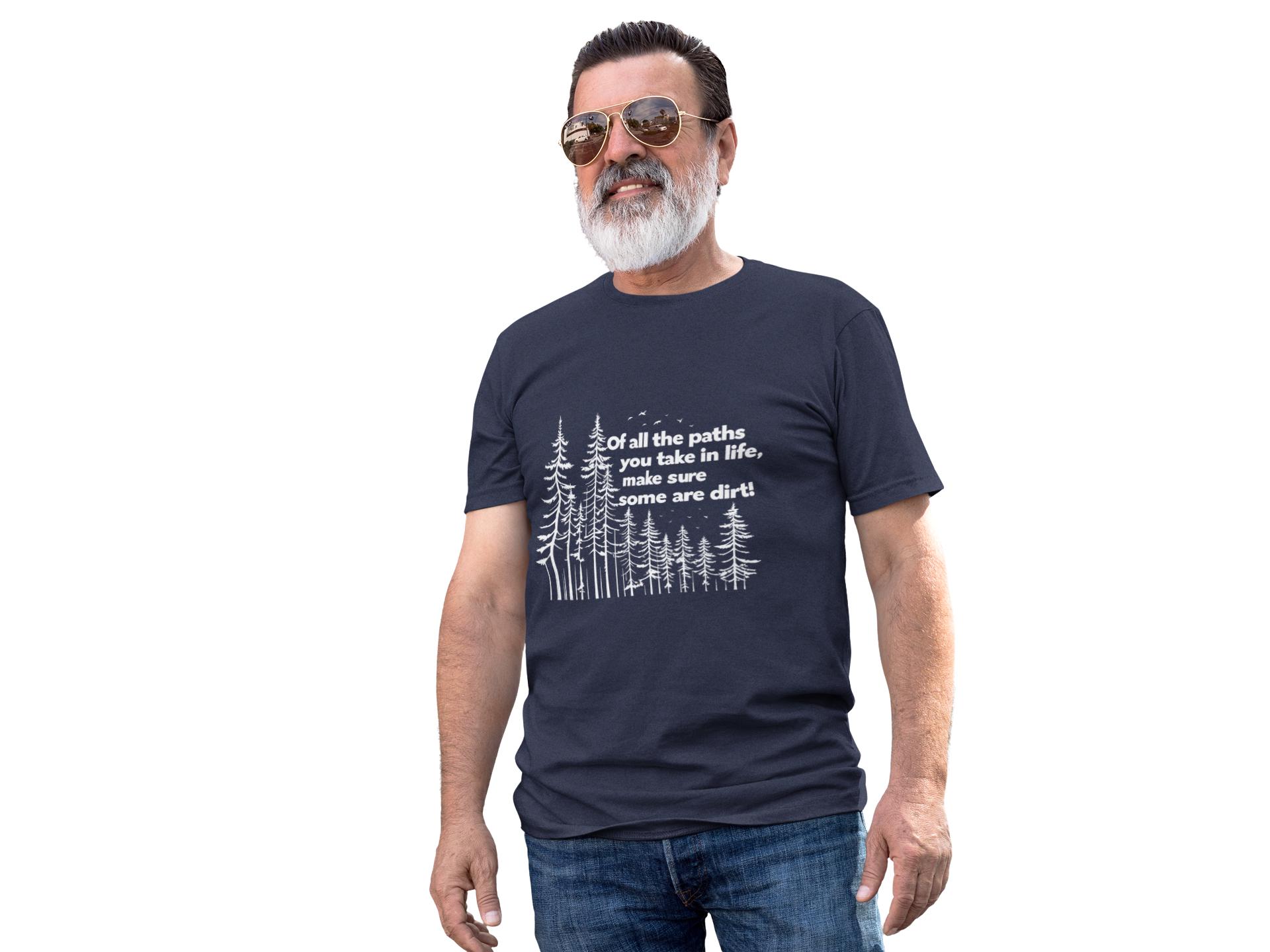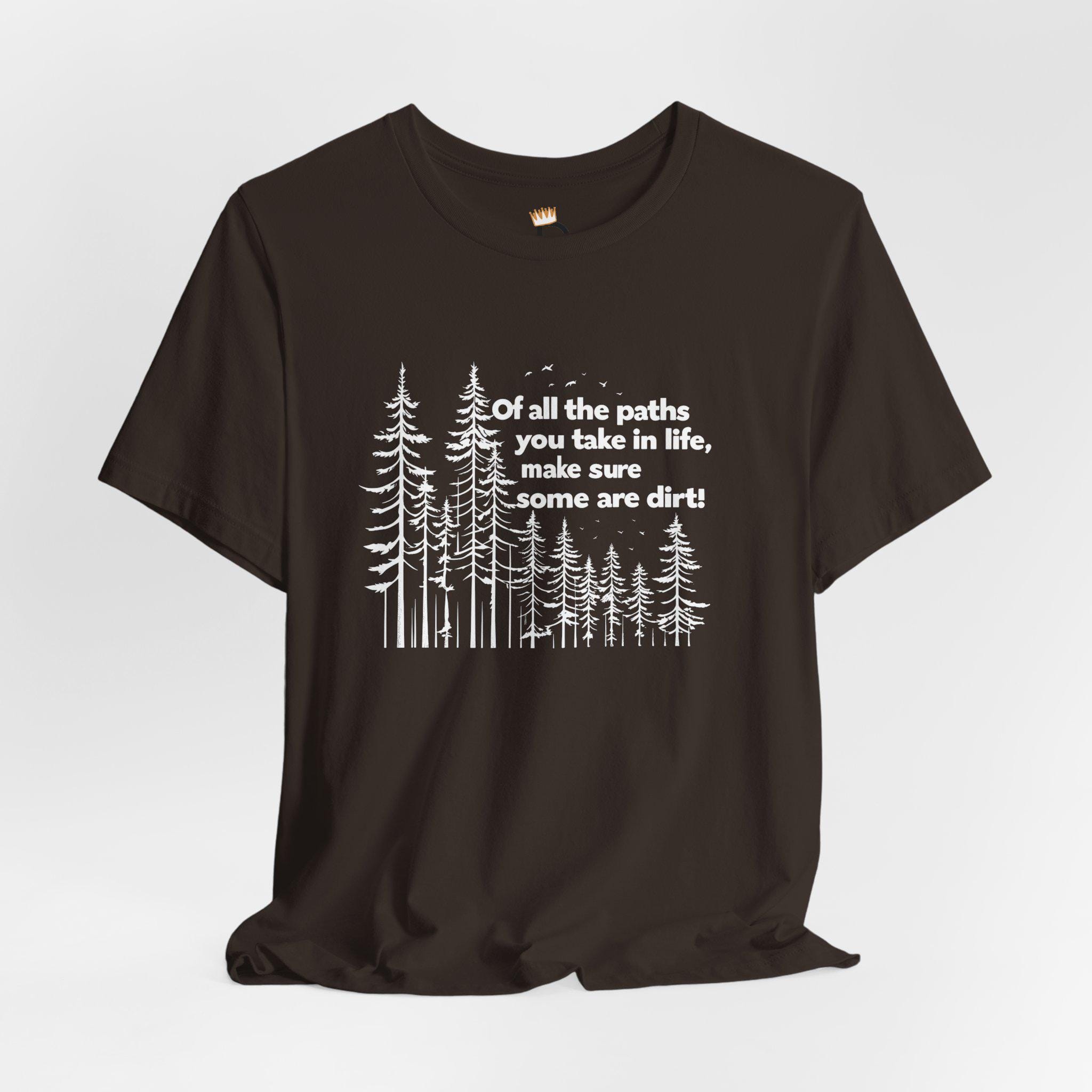 Featuring a stunning eco print of towering evergreen trees and the inspiring outdoor quote: “Of all the paths you take in life, make sure some are dirt,” this outdoor shirt is designed to motivate and celebrate your wanderlust spirit. The earthy tones of the print pop beautifully against both heather and solid tees, making it a versatile addition to your adventure wardrobe.