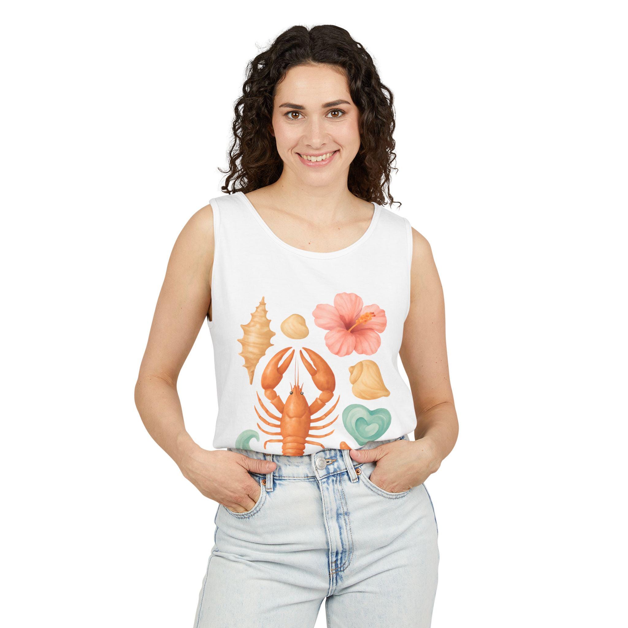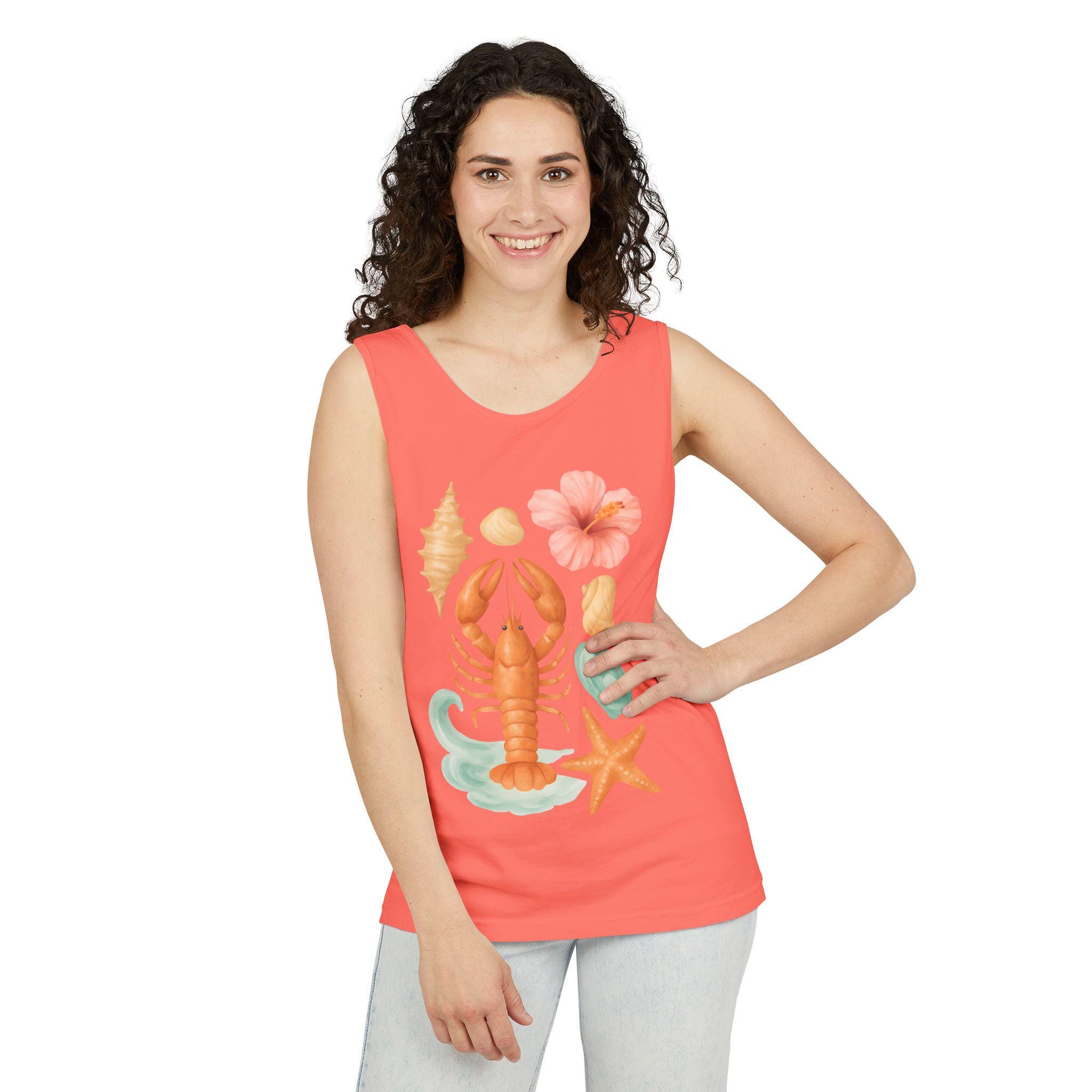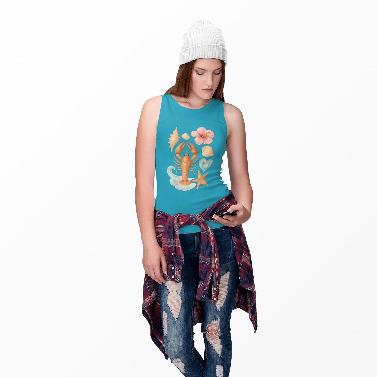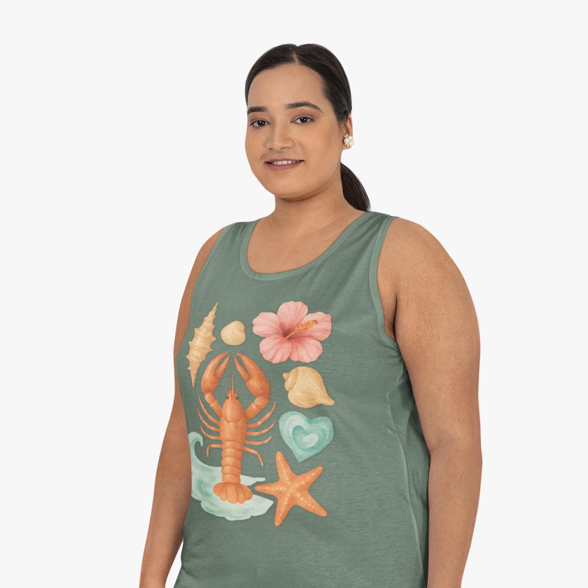 Coastal Tank Top: Seashells, Lobster & Hibiscus - Summer Ocean Vibes