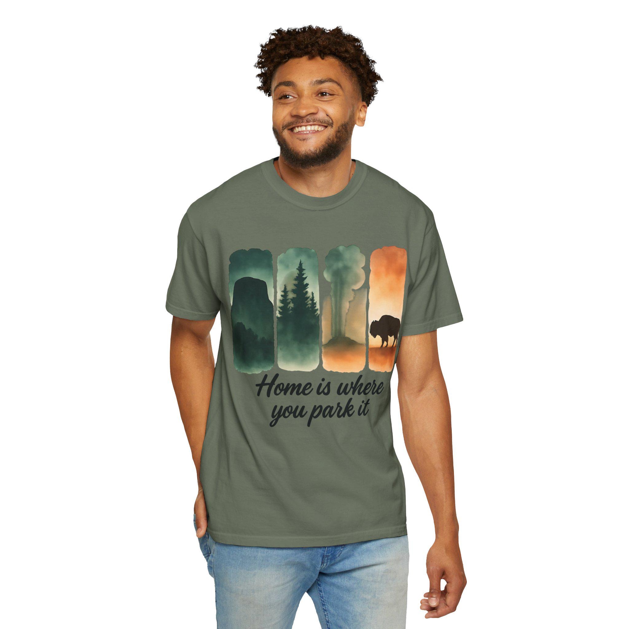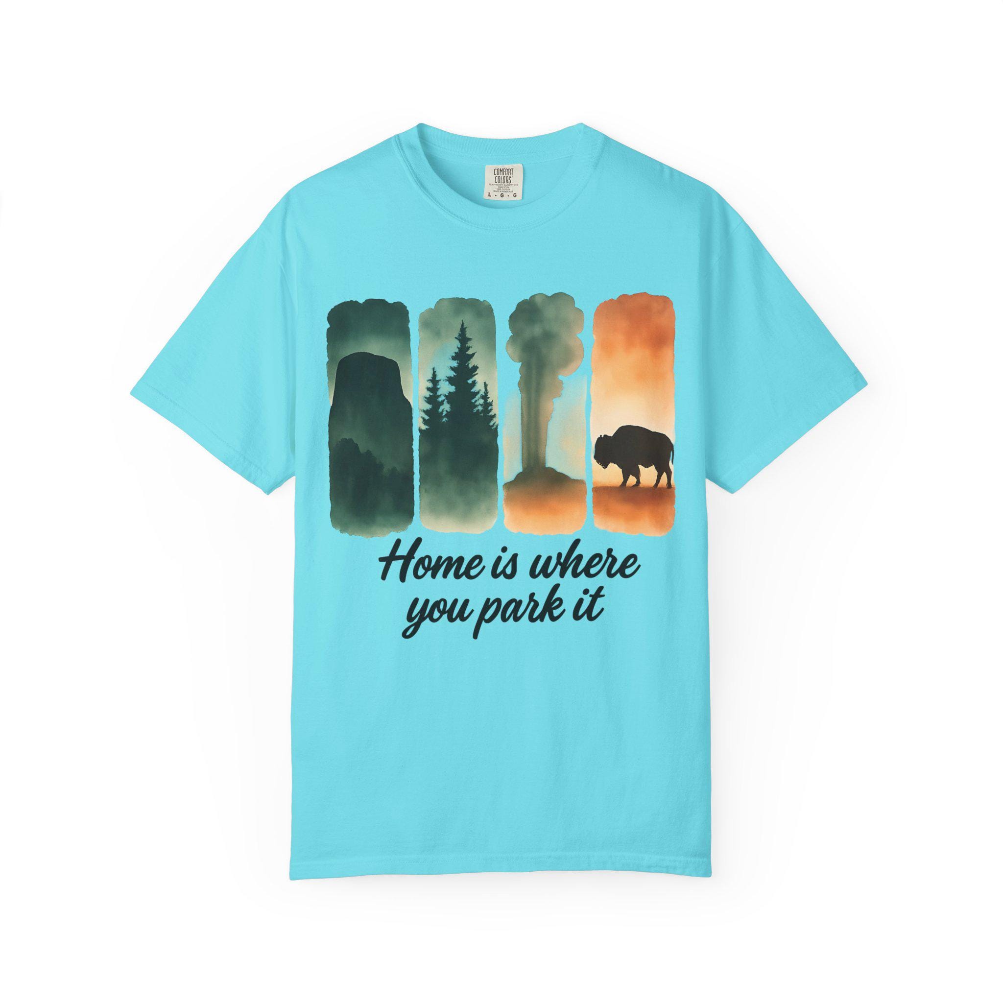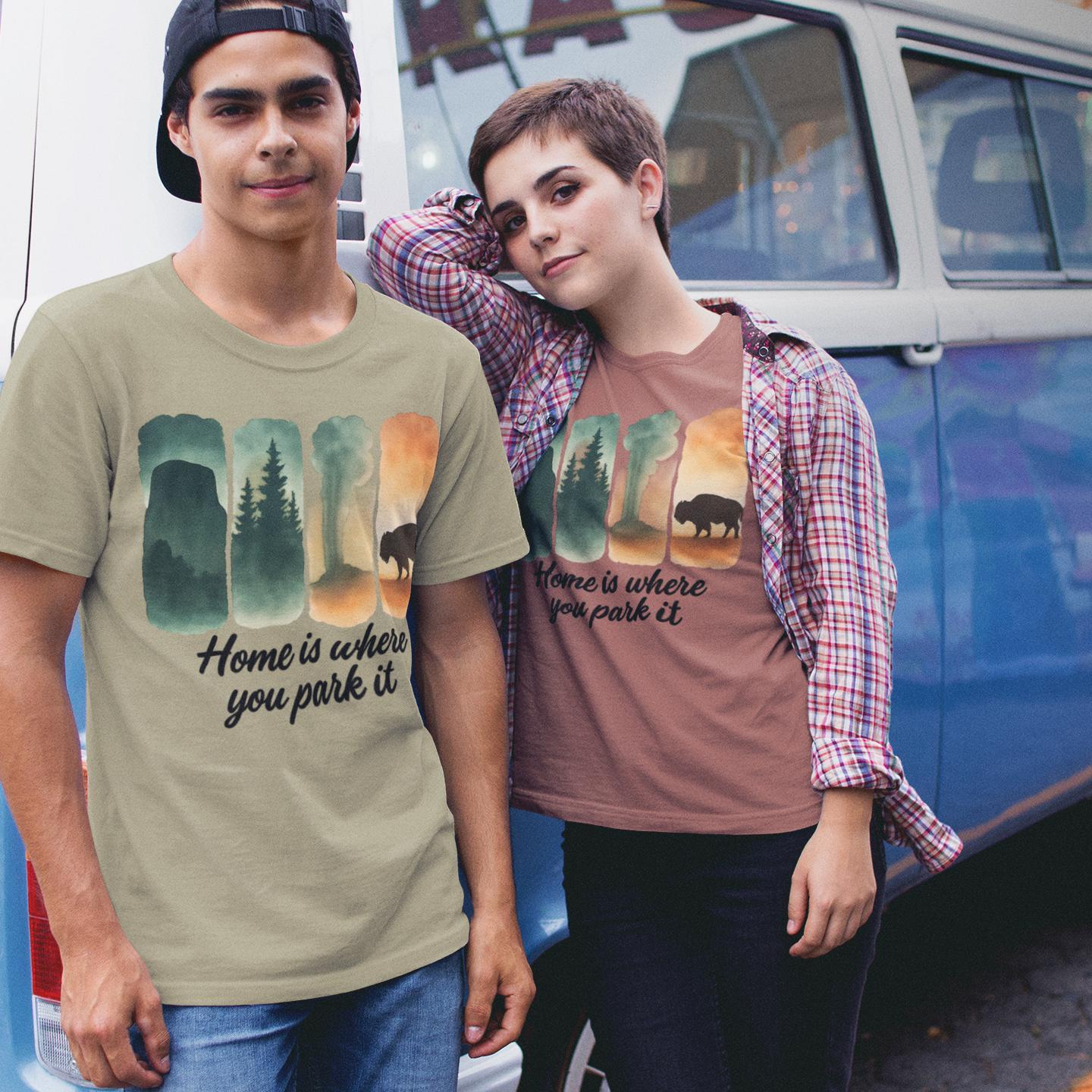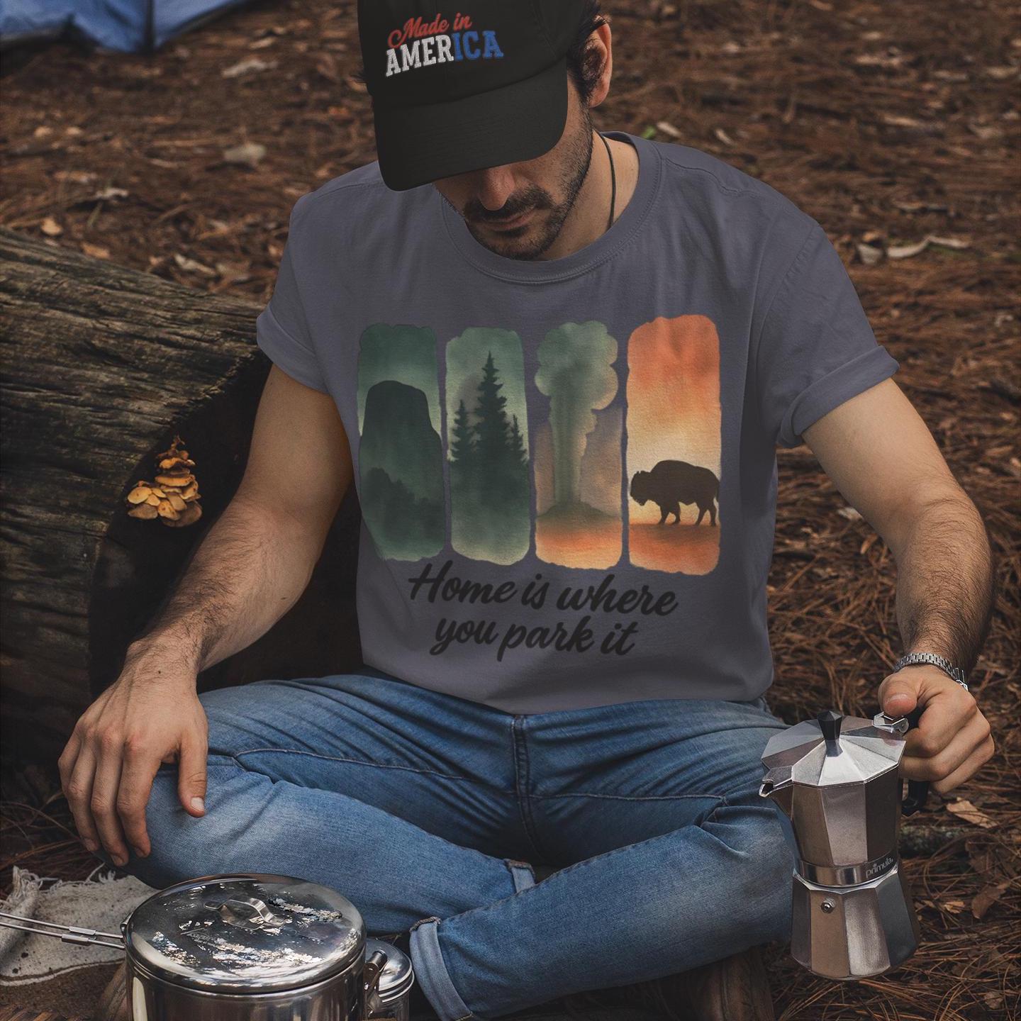 Celebrate your love for the outdoors with our "Home Is Where You Park It" T-shirt, perfectly captured in the featured vintage camper and forest silhouette. This nature-loving camping shirt stands out as a genuine expression for hikers and National Parks enthusiasts who find comfort and adventure wherever they roam.