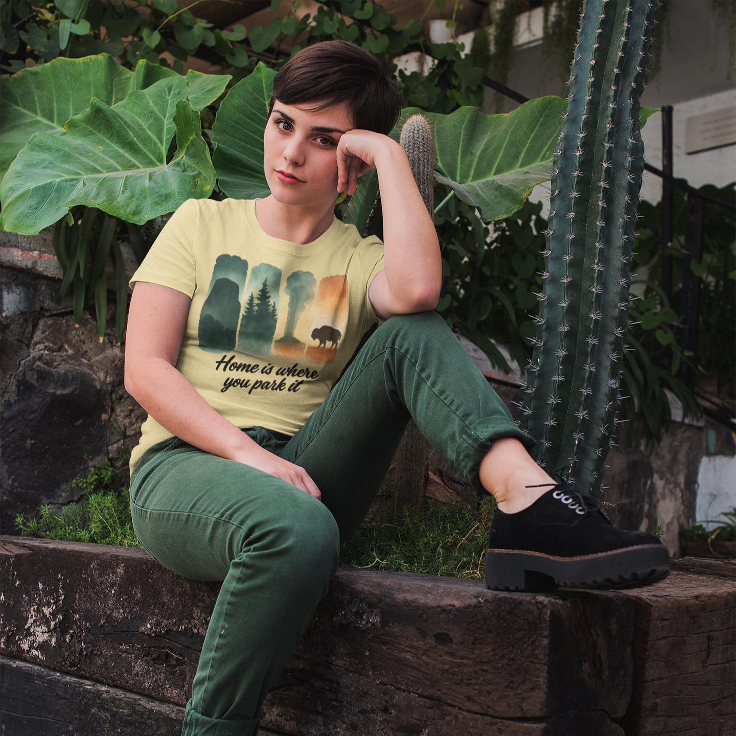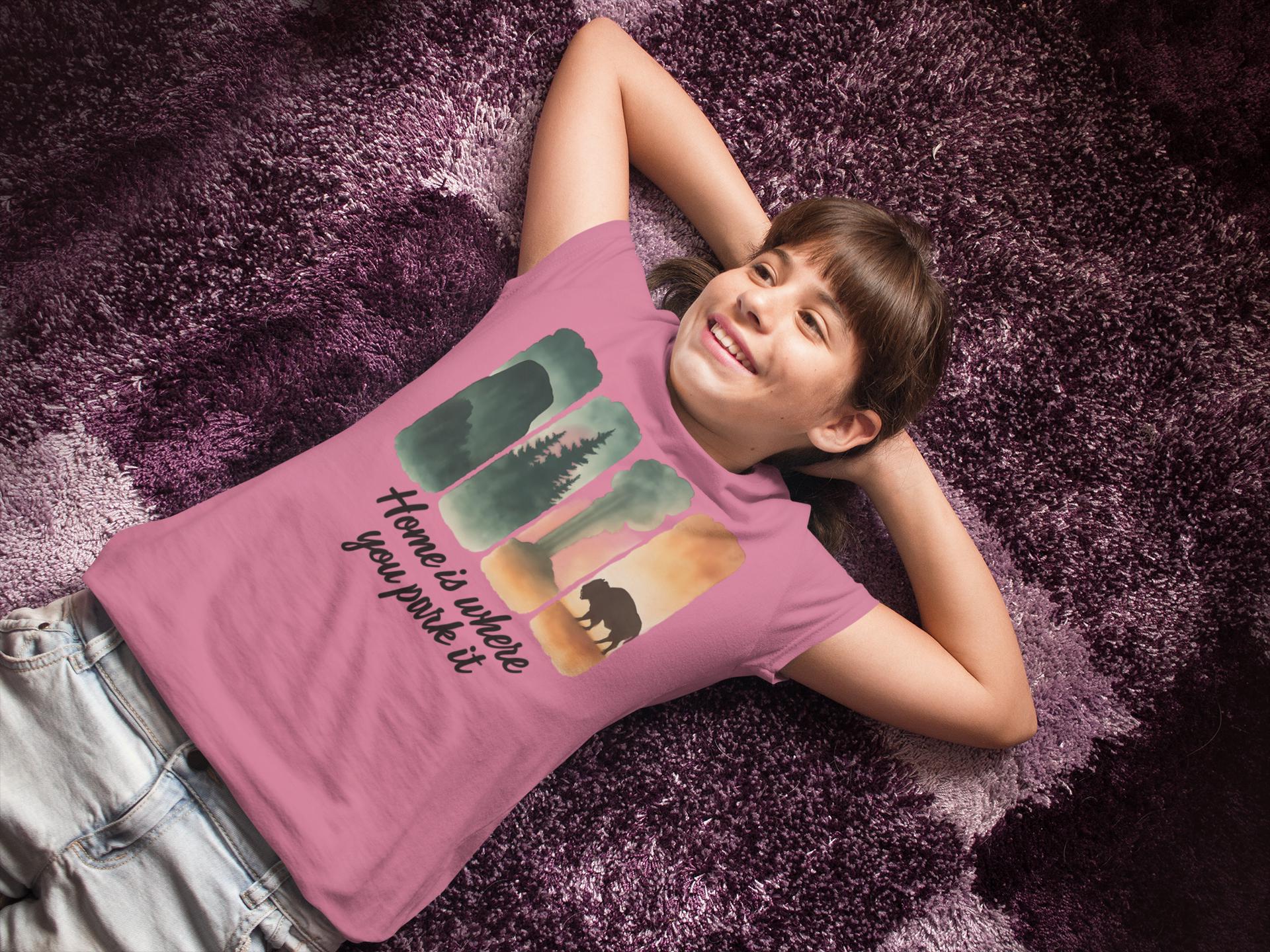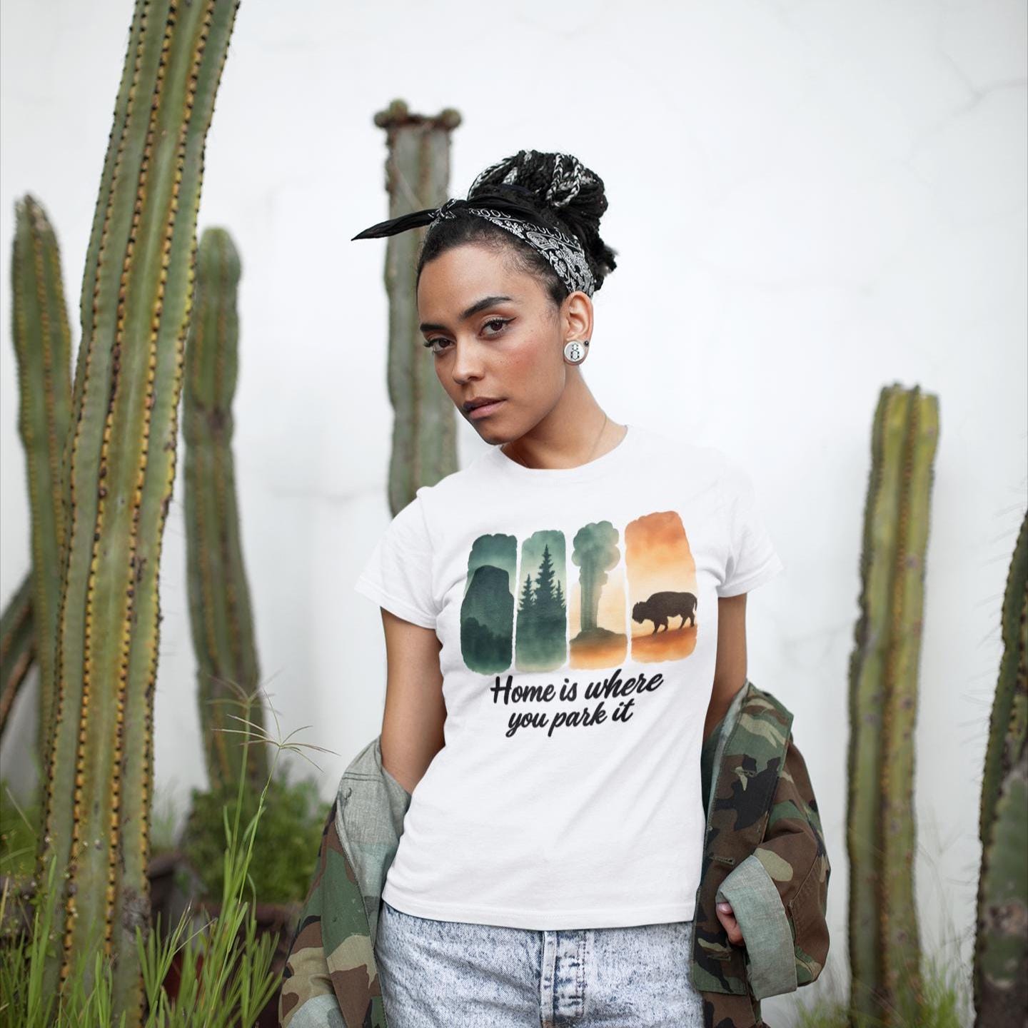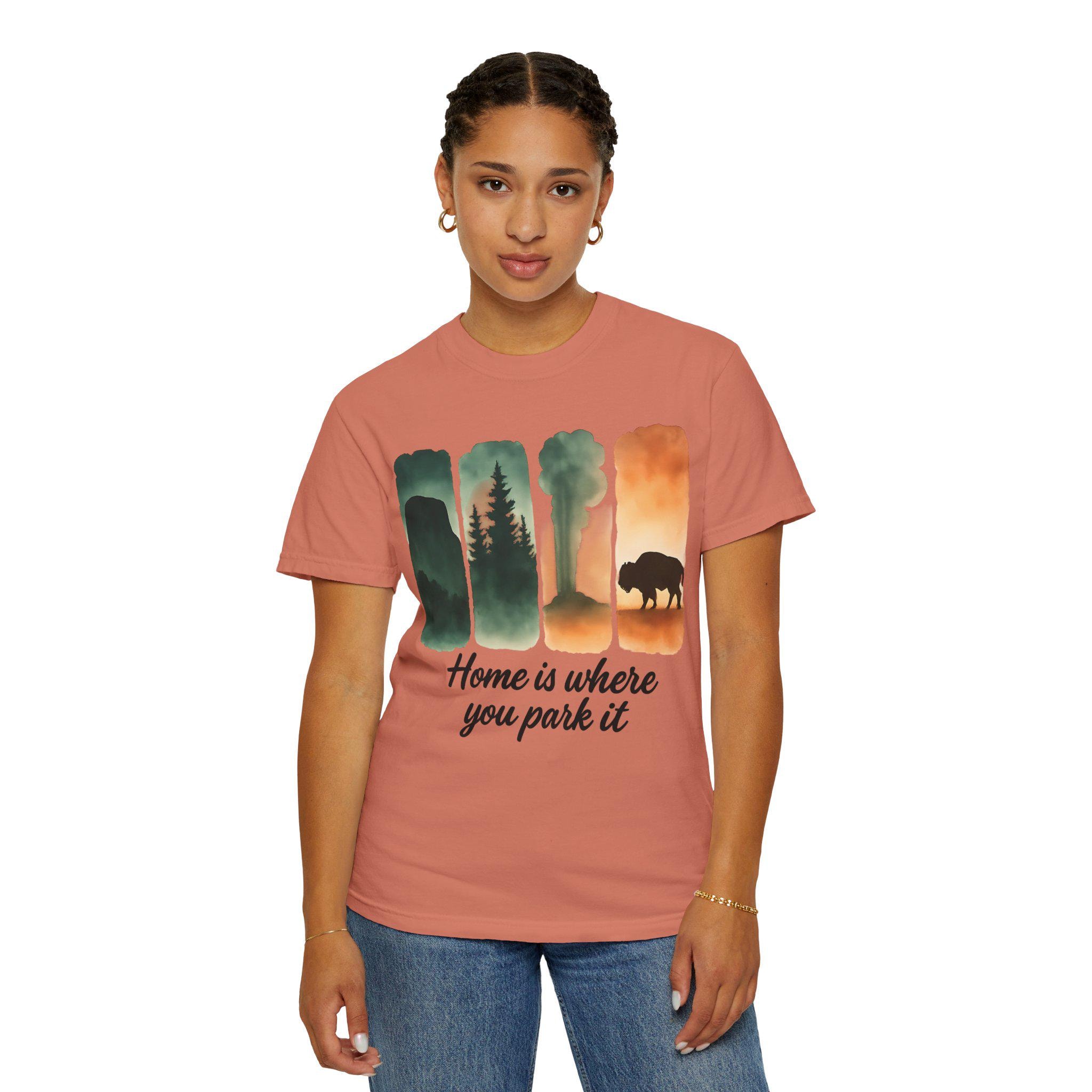 Celebrate your love for the outdoors with our "Home Is Where You Park It" T-shirt, perfectly captured in the featured vintage camper and forest silhouette. This nature-loving camping shirt stands out as a genuine expression for hikers and National Parks enthusiasts who find comfort and adventure wherever they roam.