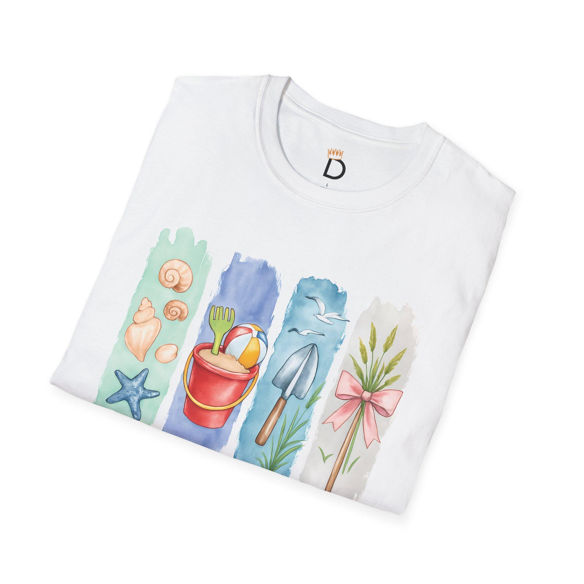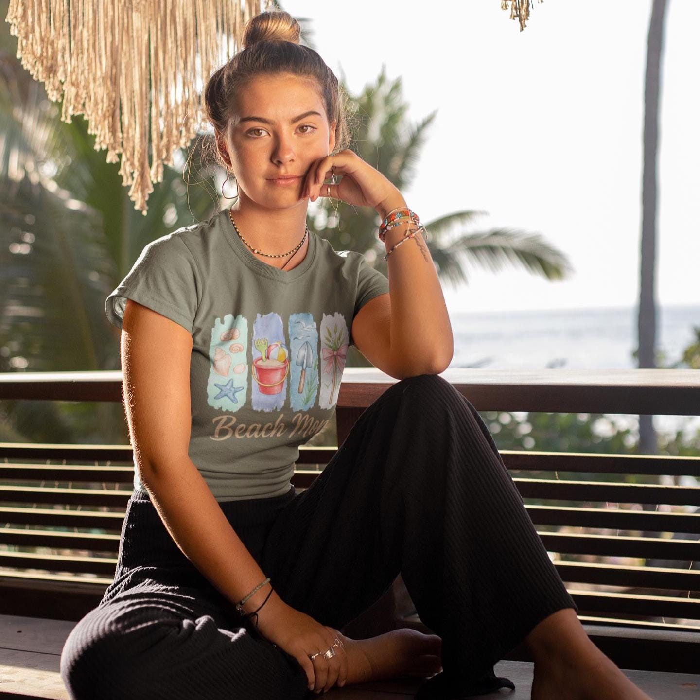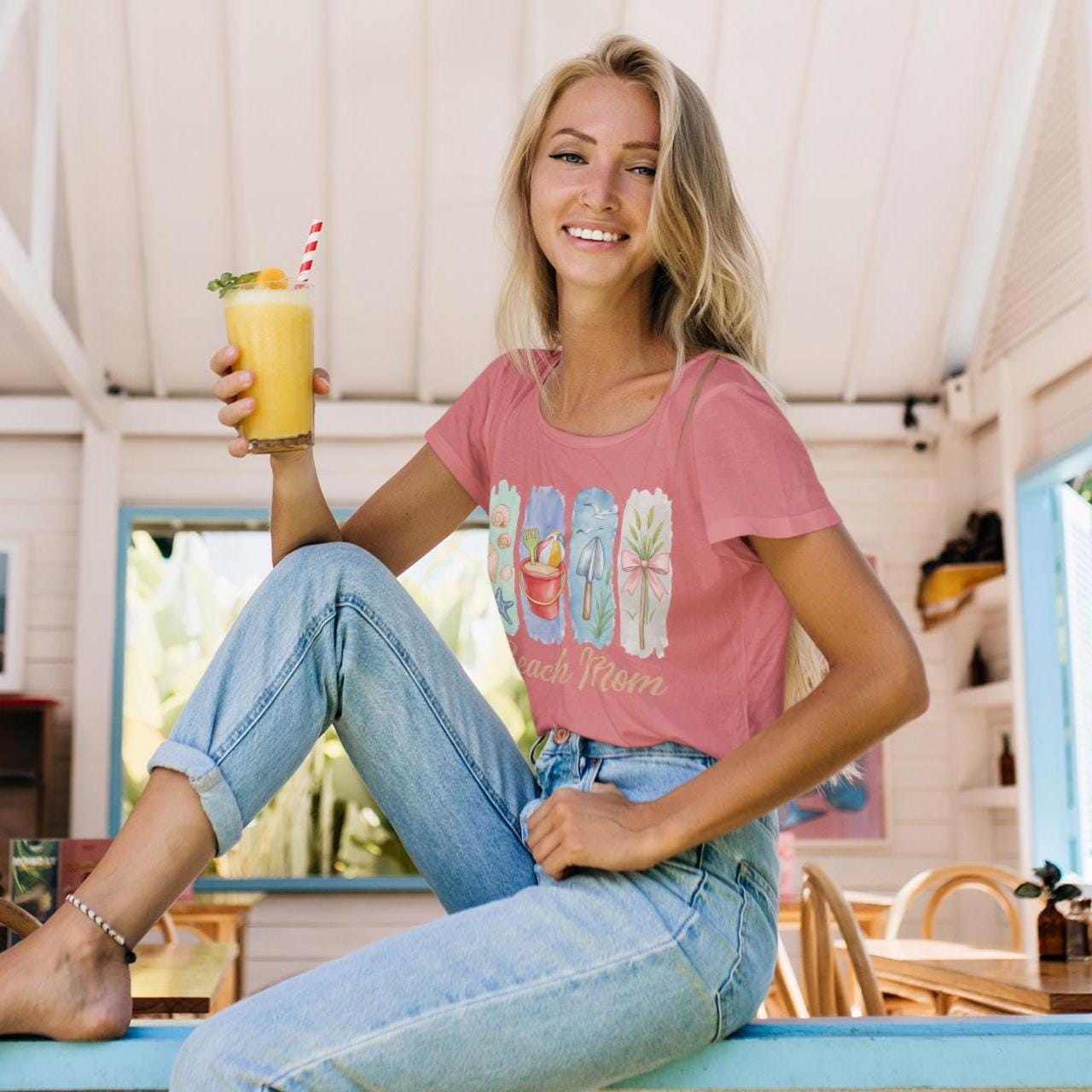 This soft, breathable tee features a beachy design with pastel shells, tools, and florals that capture that carefree summer spirit. Whether you're chasing kids on the shore or sipping iced coffee in flip-flops, this shirt says it all: Beach. Mom. Mode. On.
