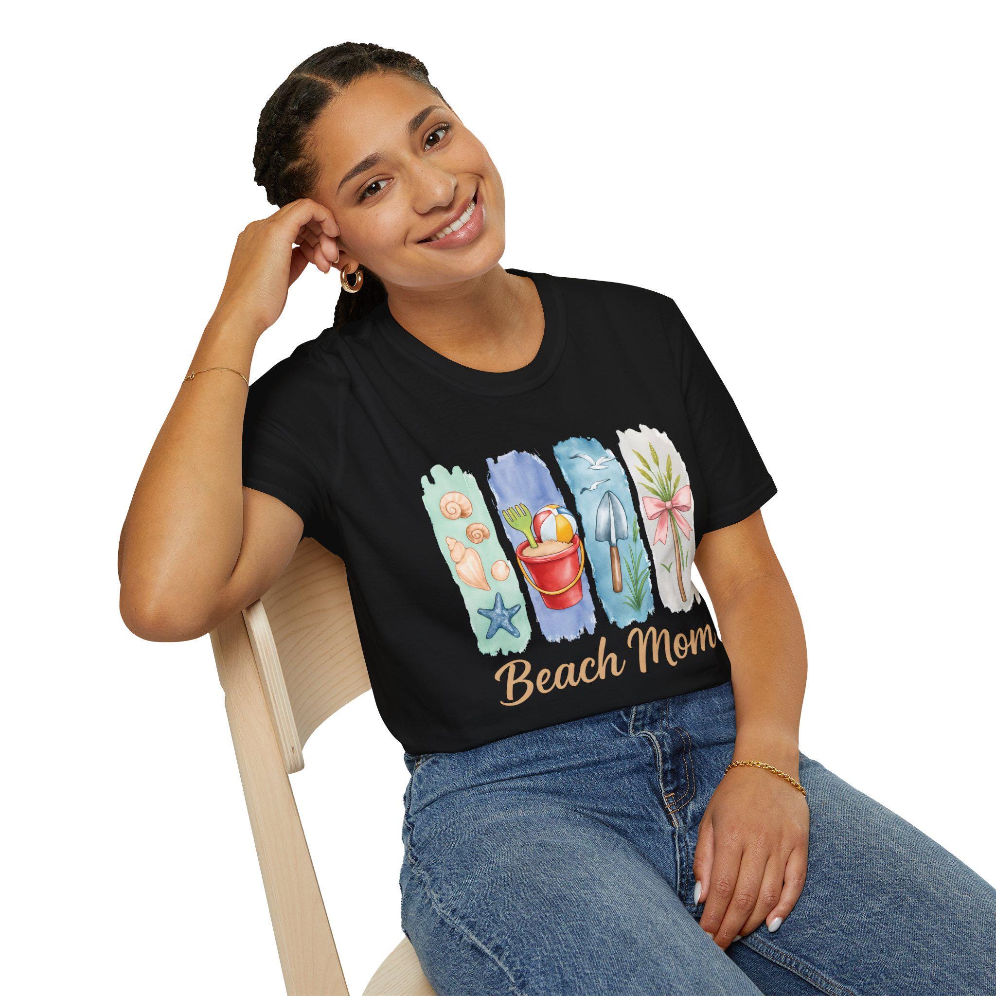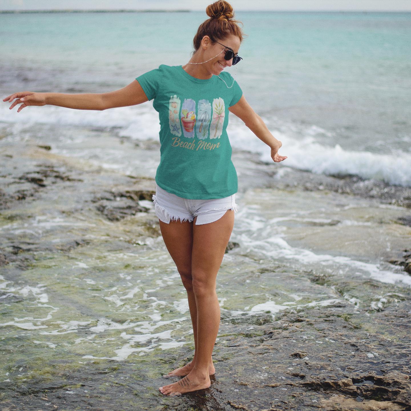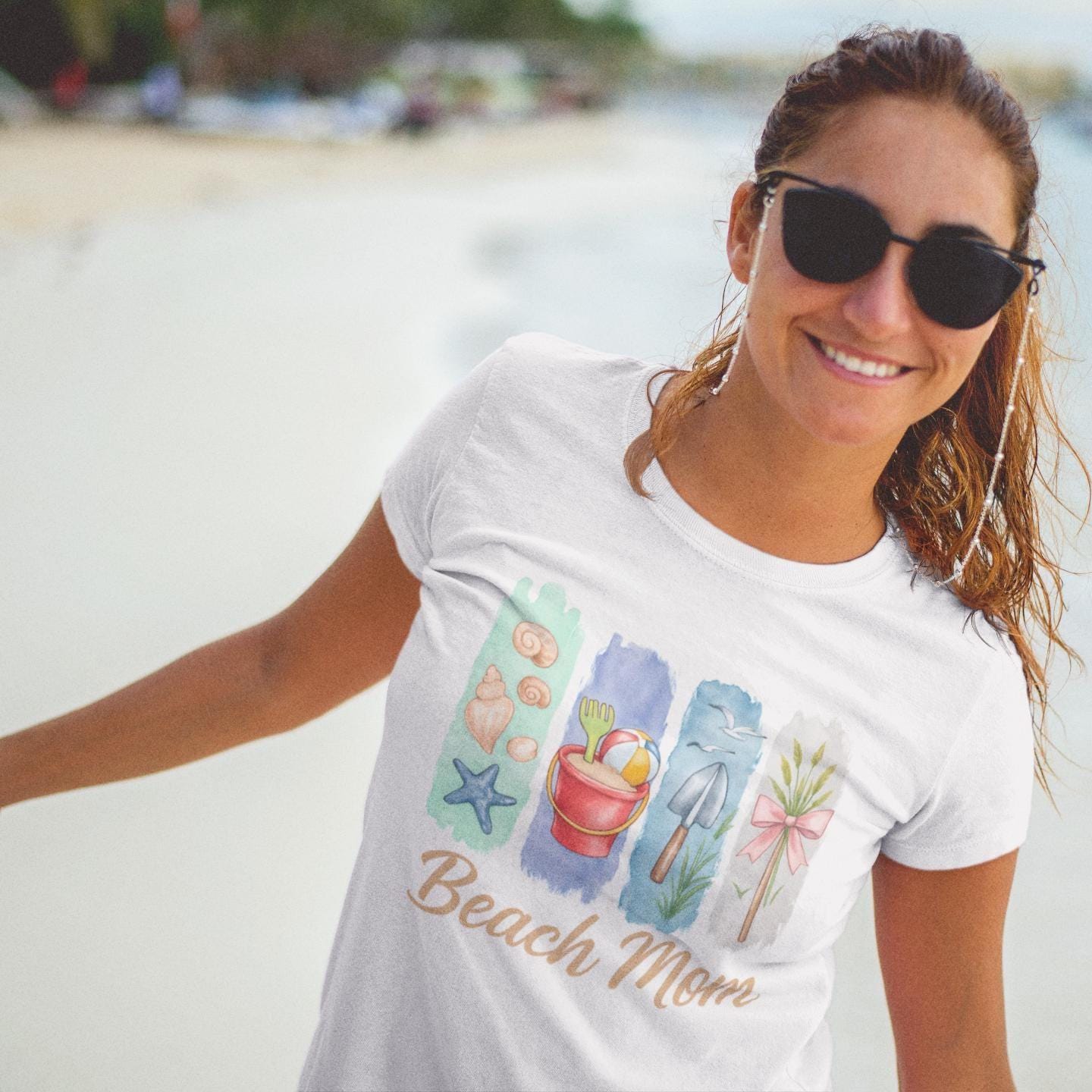 Beach Mom t-shirt with watercolor coastal vibes – perfect for seaside getaways, sandy strolls, and sunshine days!