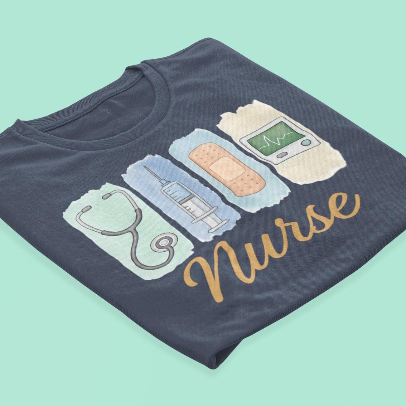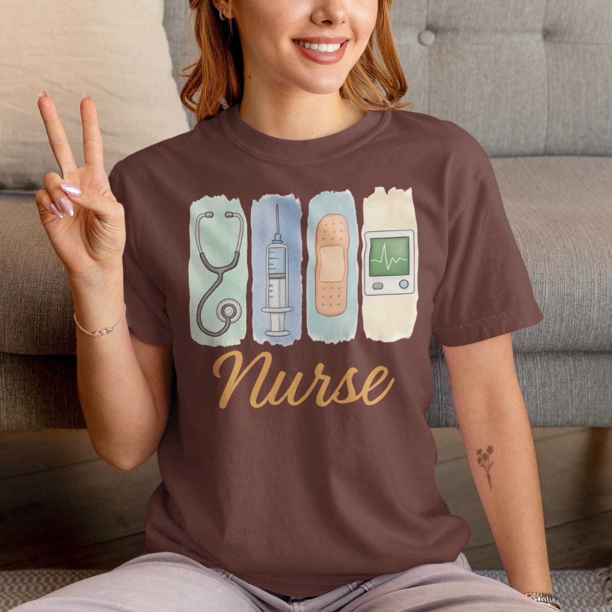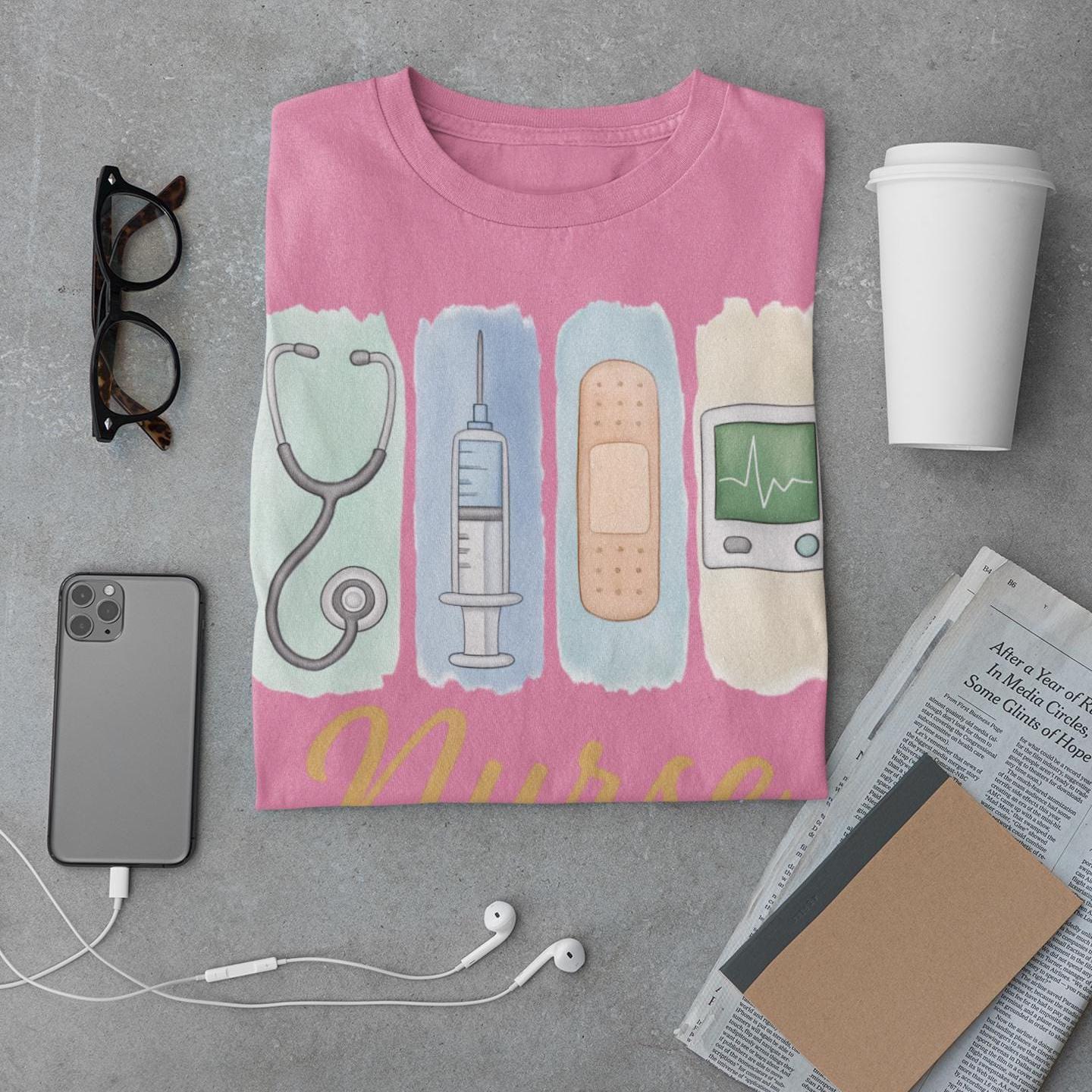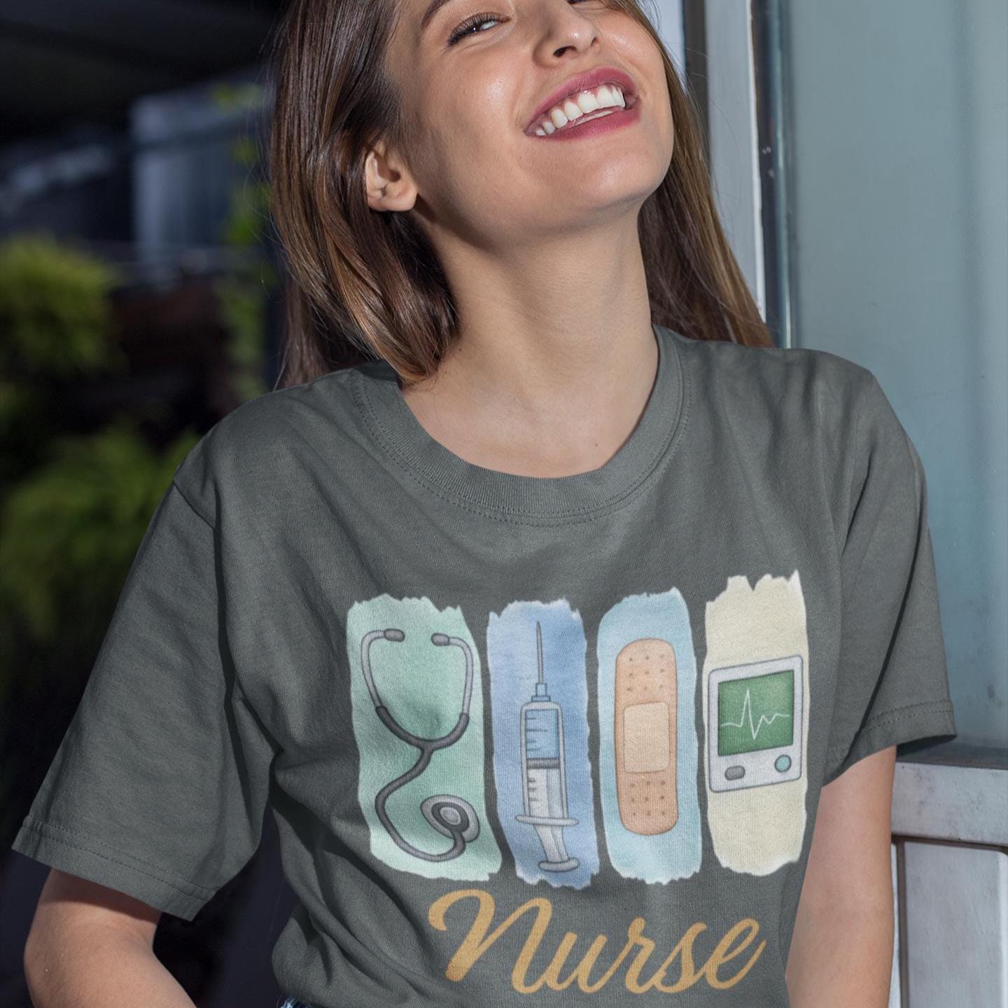 The nurse t-shirt with watercolor medical icons is the perfect gift for nurses, RNs, or nursing students who love comfy style and heart-filled care!