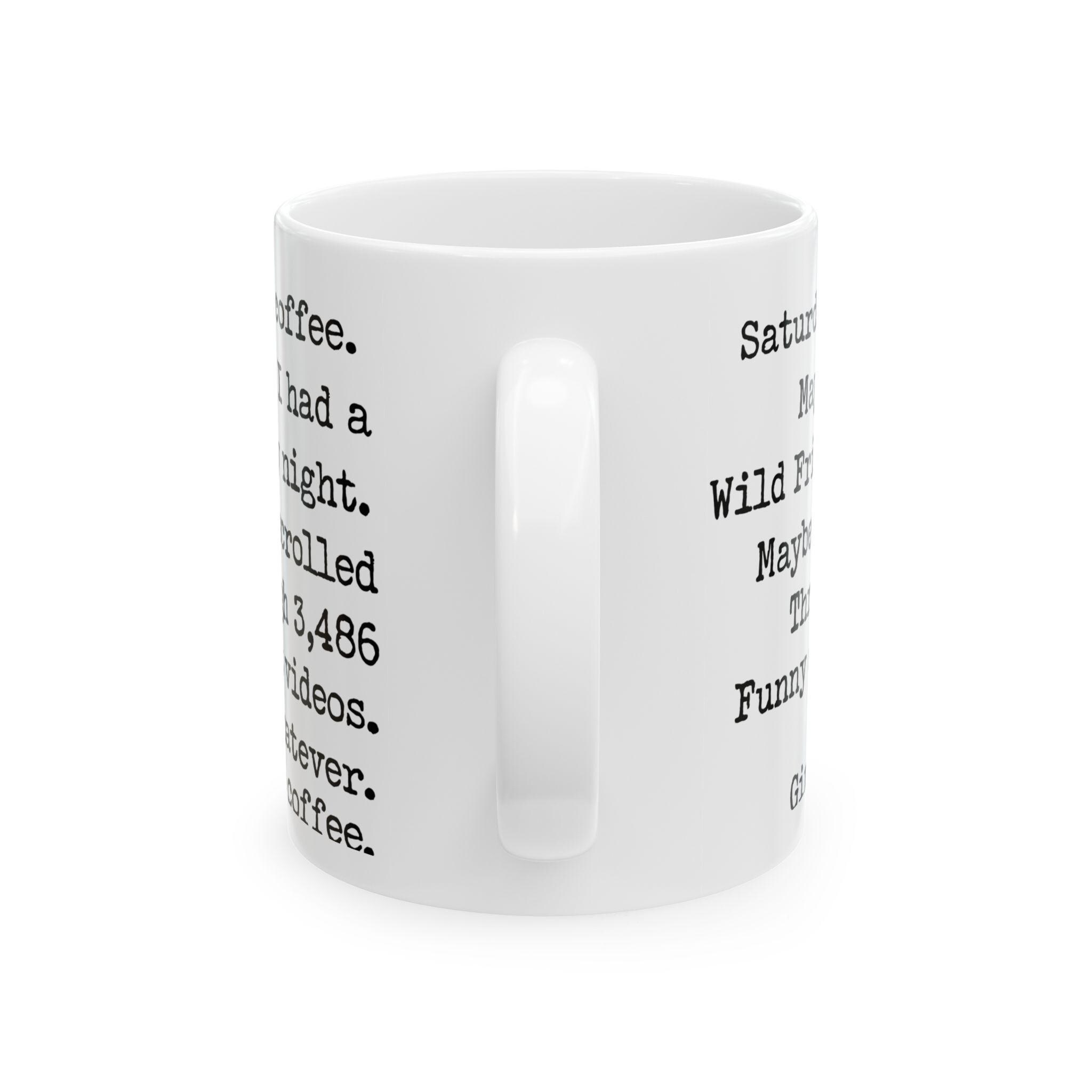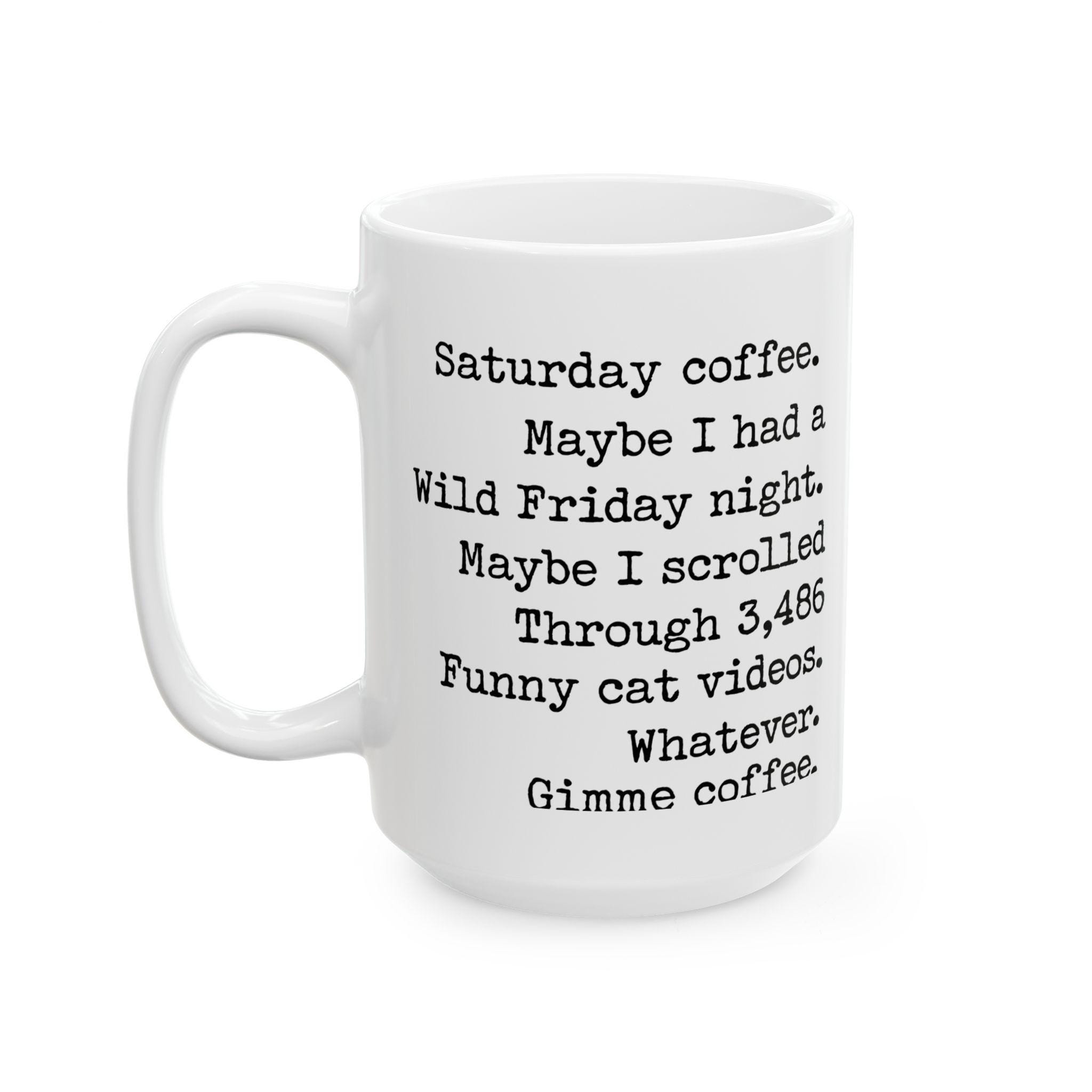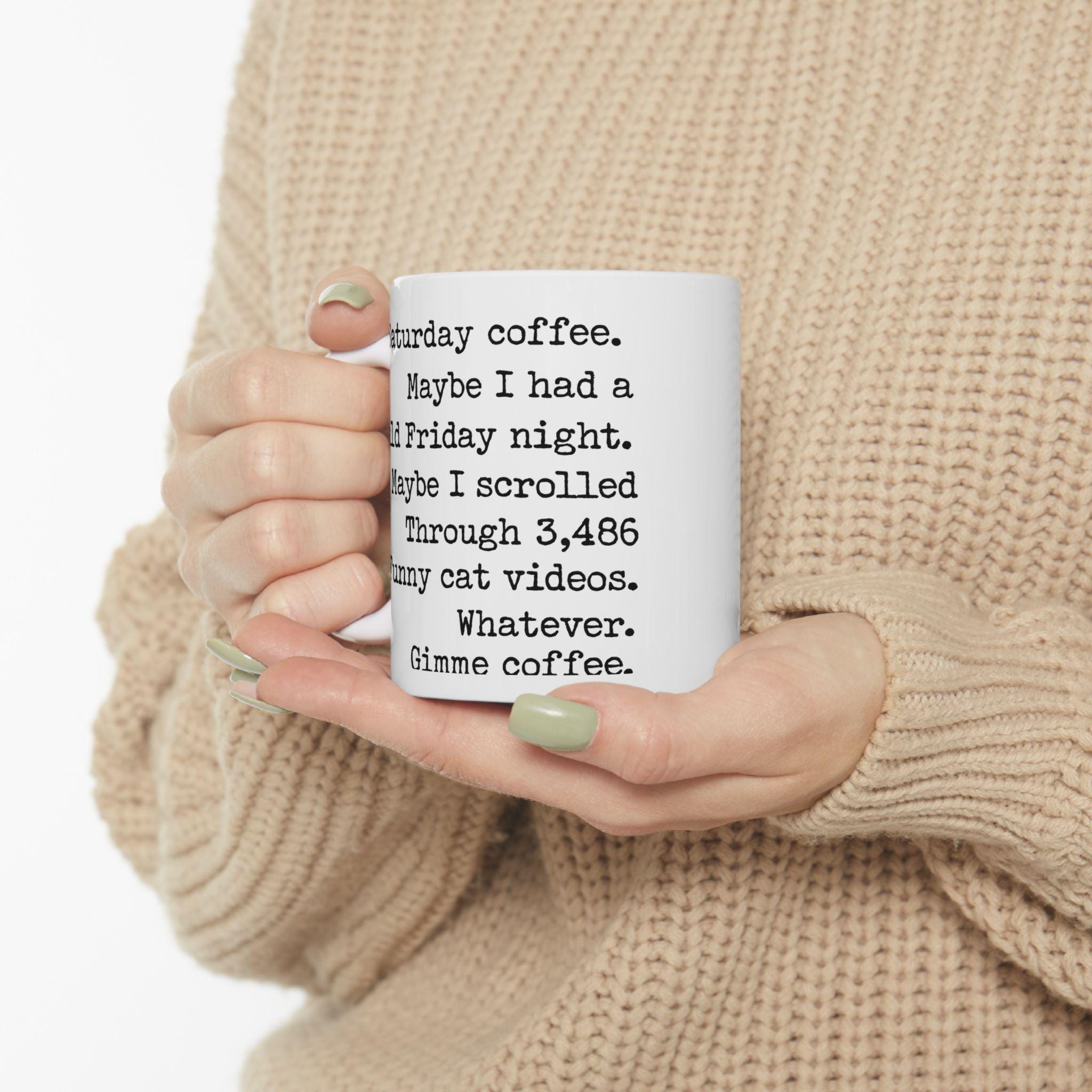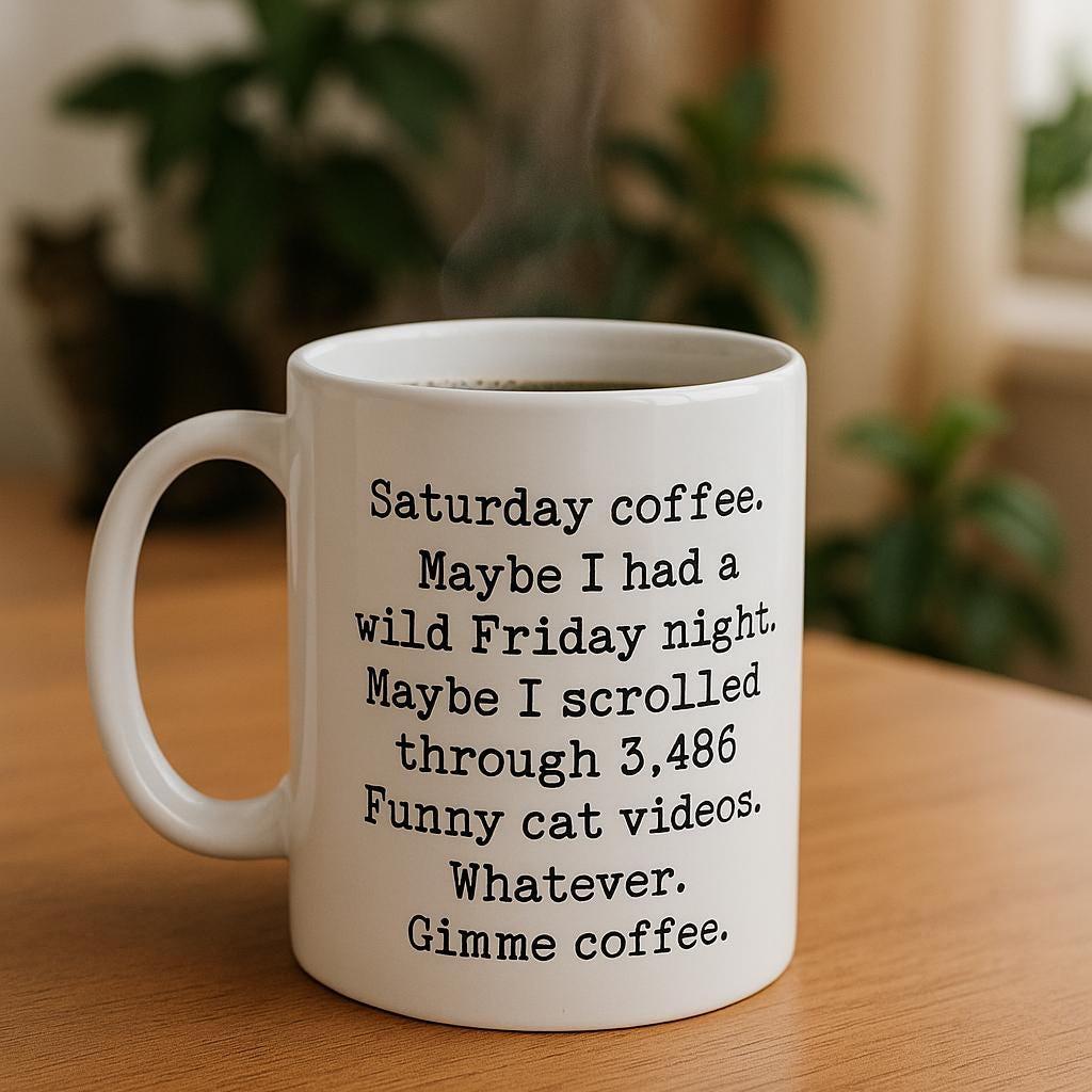 Start your Saturday mornings with a dose of humor and caffeine with this funny coffee mug! Featuring the viral quote "Saturday coffee. Maybe I had a wild Friday night. Maybe I scrolled through 3,486 funny cat videos. Whatever. Gimme coffee," this mug is perfect for anyone who loves cats, laughs, and a strong cup of coffee to kick off the weekend.