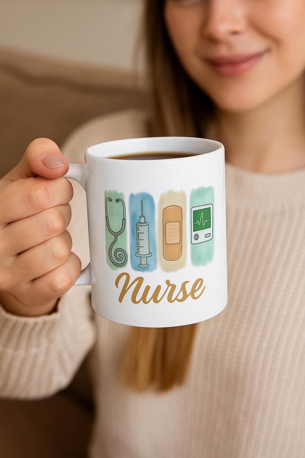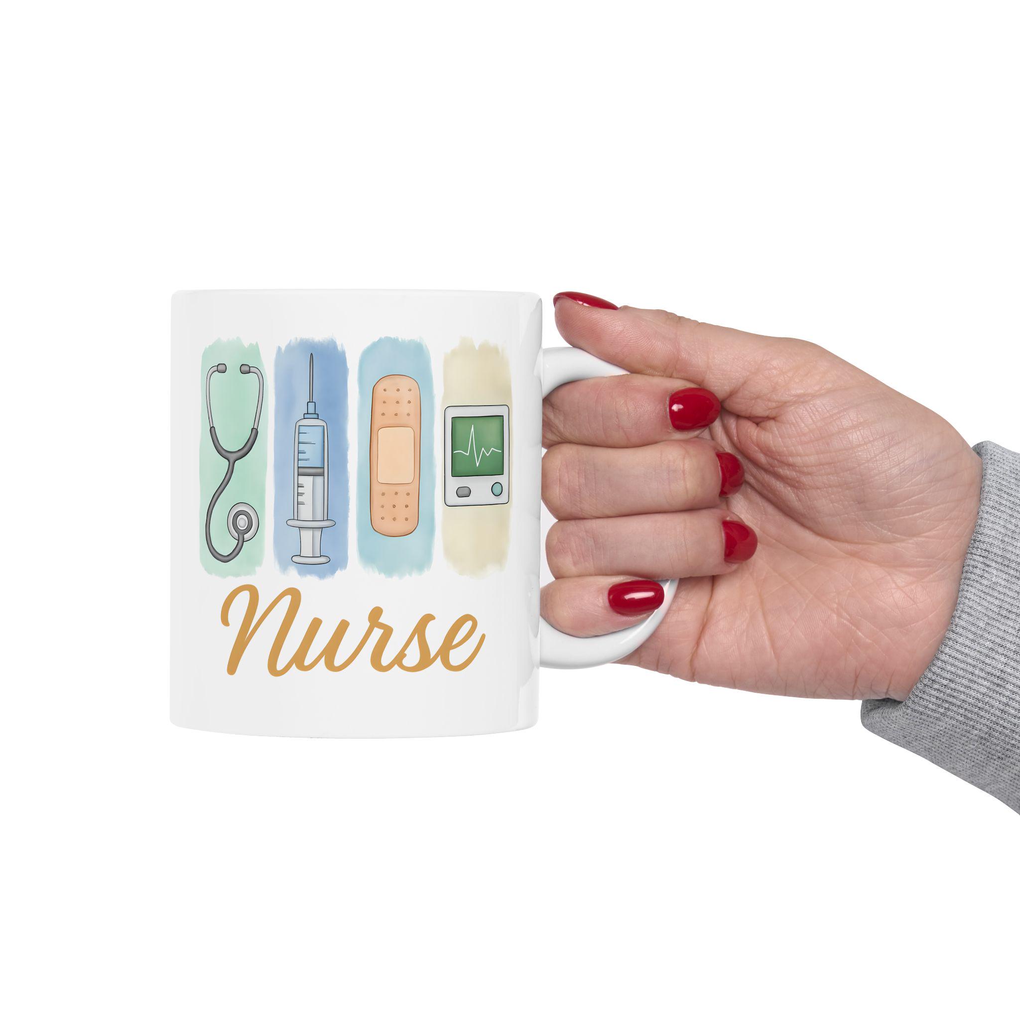 Featuring hand-drawn medical tools (stethoscope, syringe, bandage, and heart monitor) and the word “Nurse” in a script font, this mug makes the perfect gift for nurses, nursing students, or recent grads. Great for coffee, tea, or surviving long shifts.