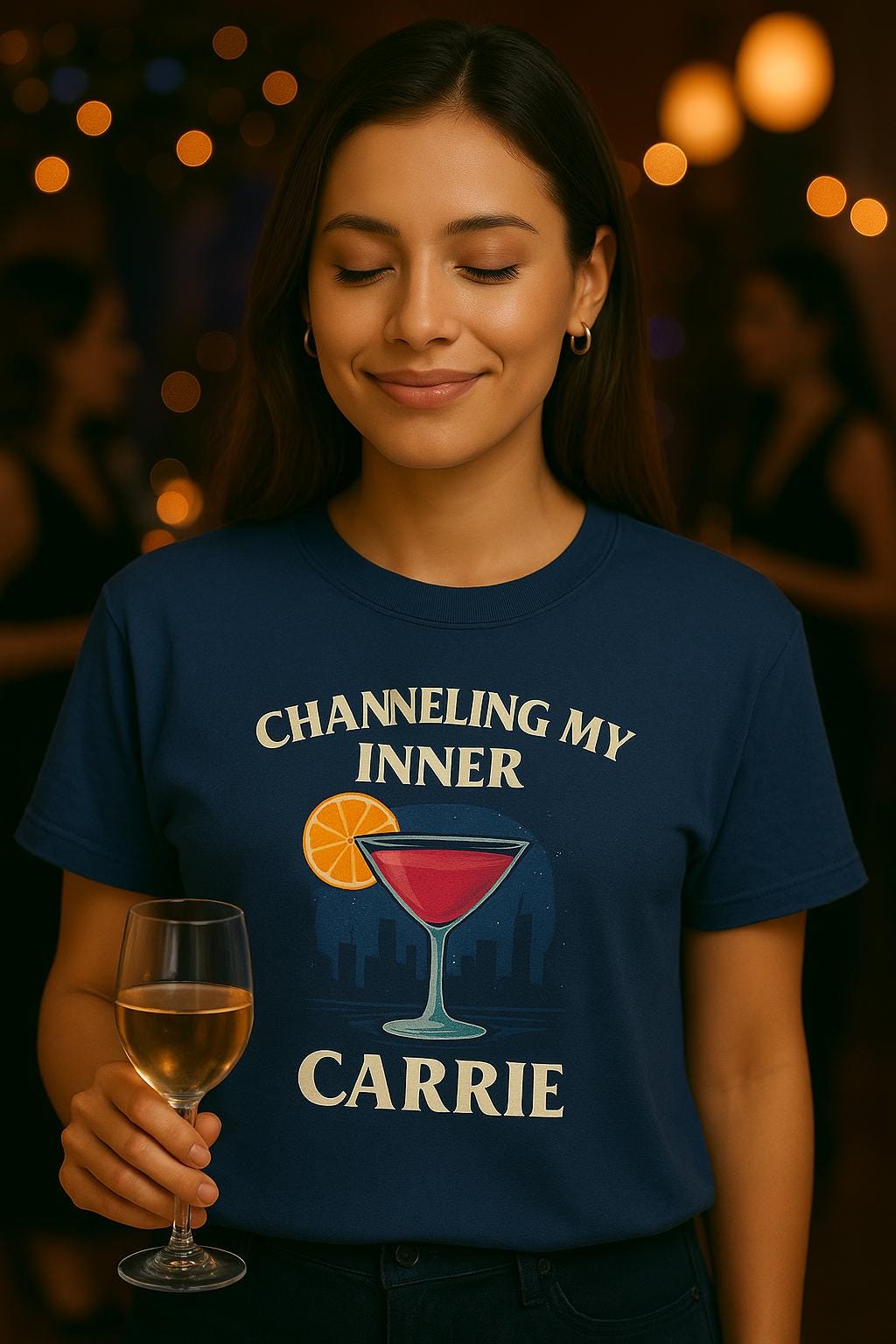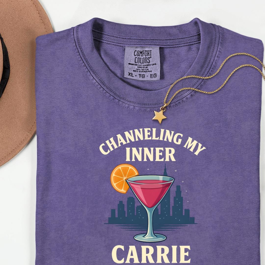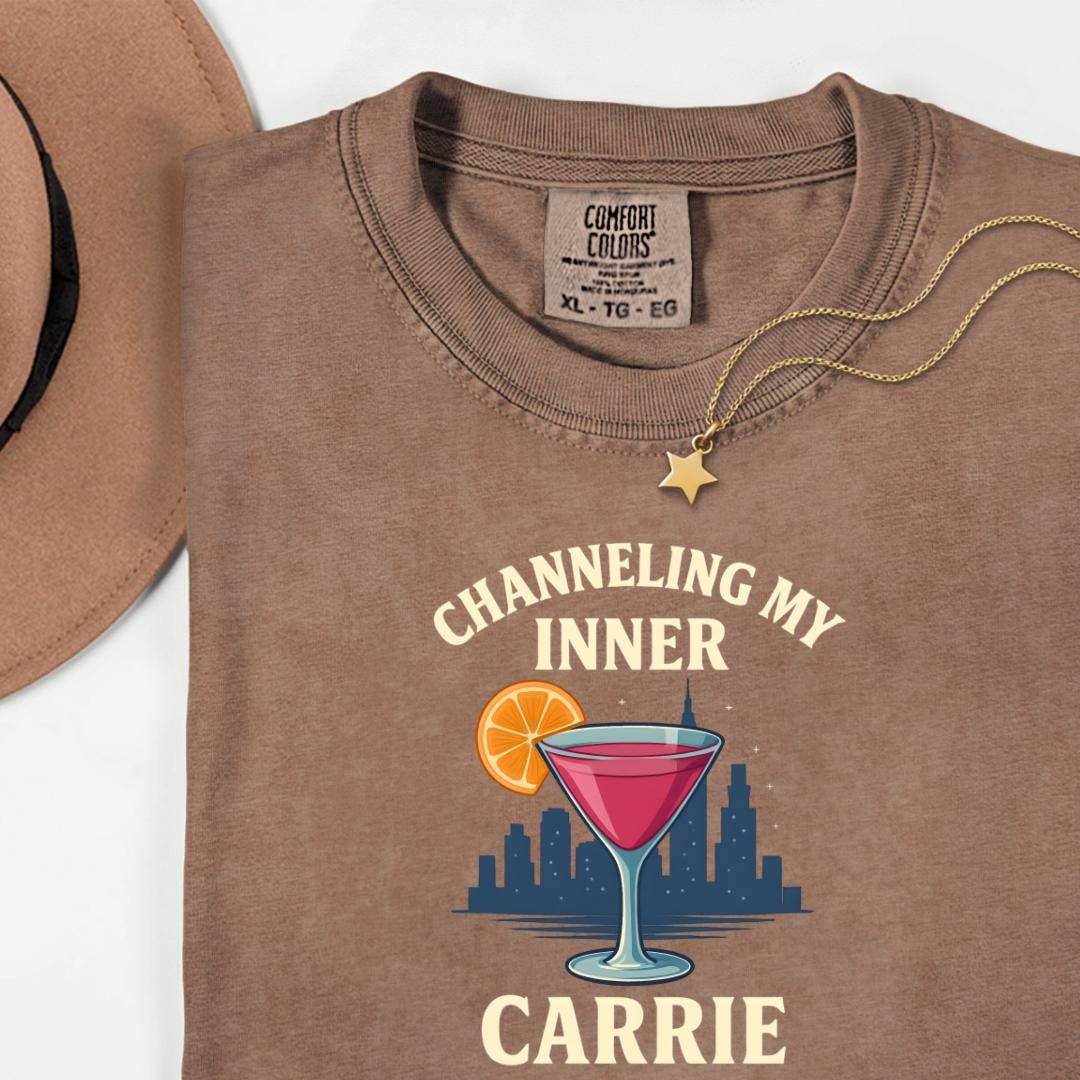 Add this SATC-inspired tee to your wardrobe today and enjoy free US shipping on orders over $35. Explore our shop’s hassle-free returns and prompt customer support to make your experience seamless and enjoyable.Channeling My Inner Carrie – for the girls who brunch, write, sip cosmos, and serve iconic energy. 🍸 This Comfort Colors tee features bold vintage-style text, a martini glass with a citrus twist, and a dreamy skyline backdrop—your ultimate Girls Night Out (or In) uniform.