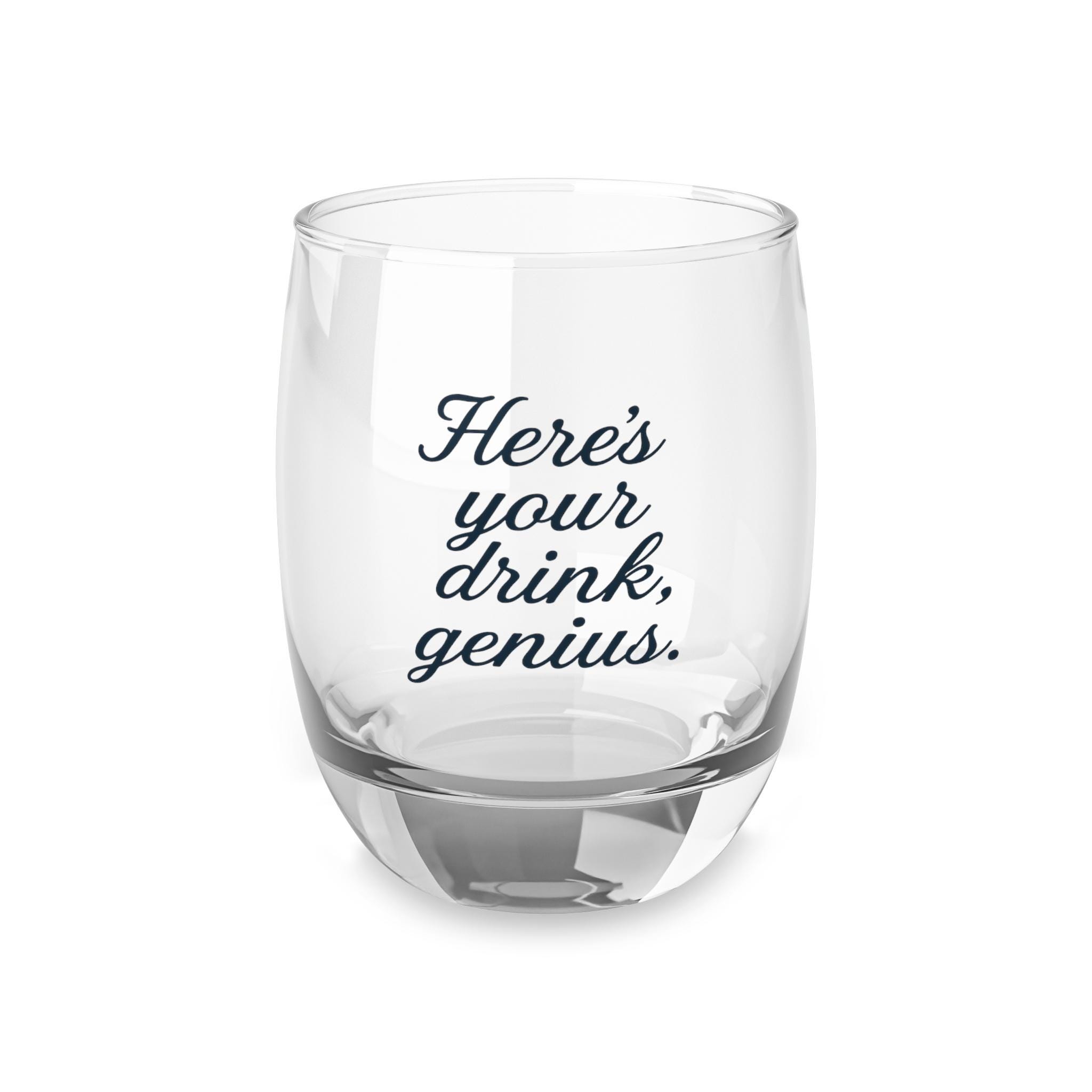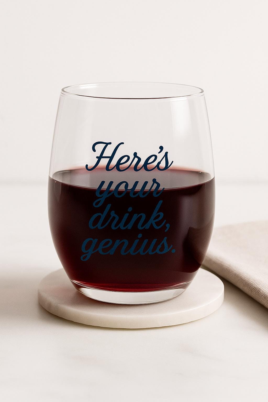 Funny Wine Glass: "Here's Your Drink, Genius" - Snarky Barware Gift