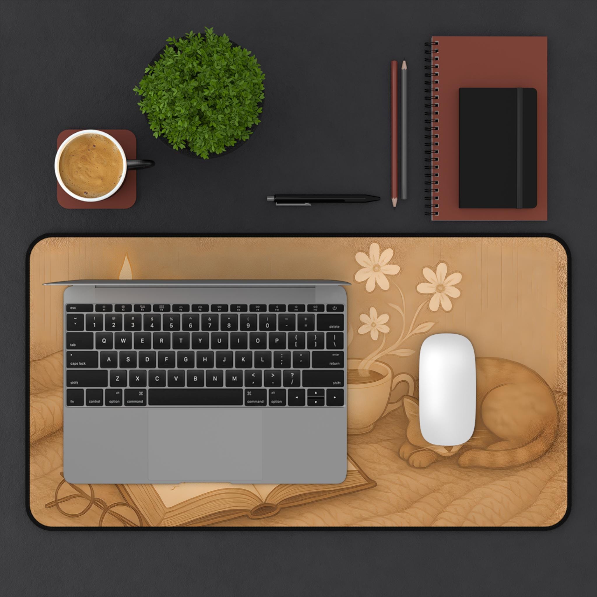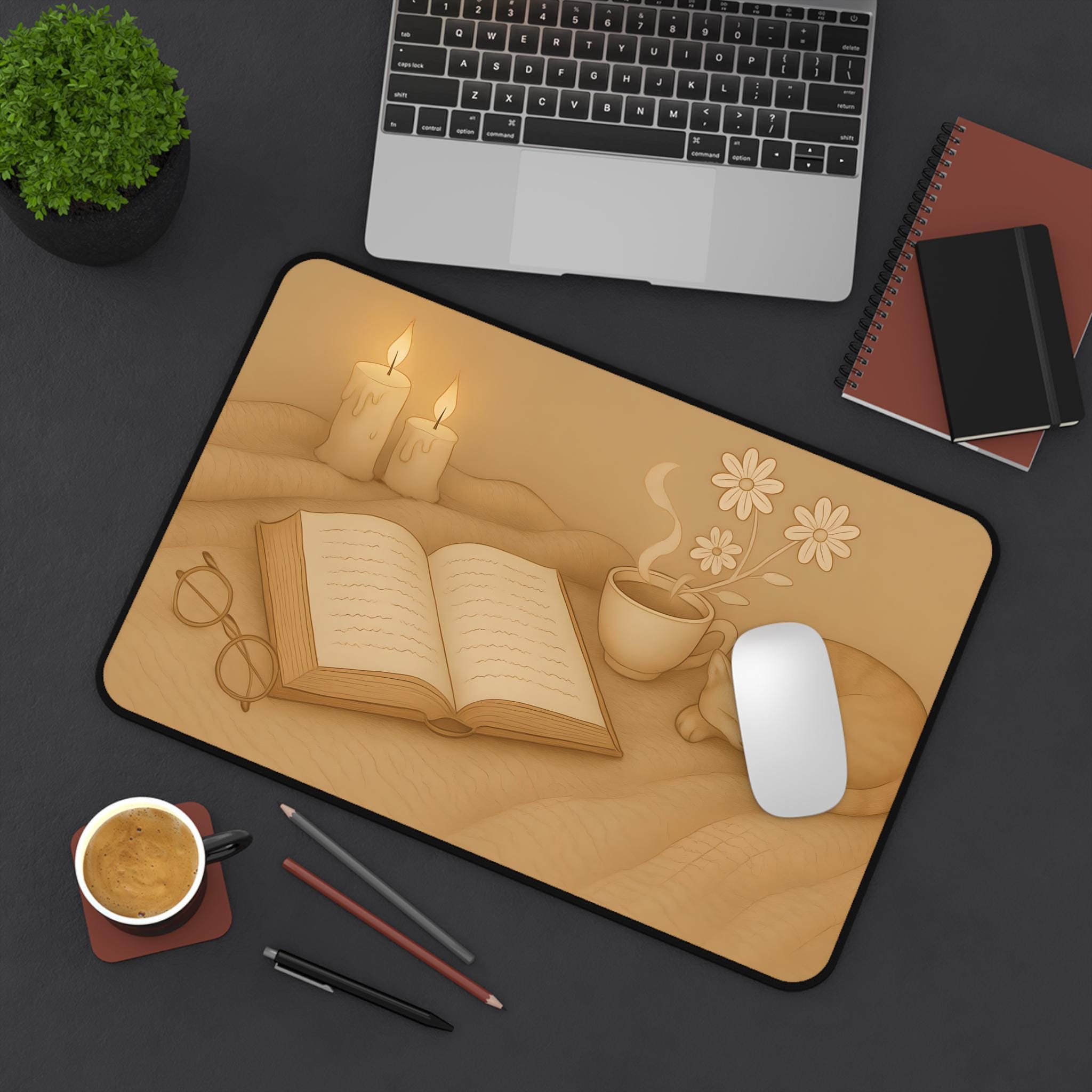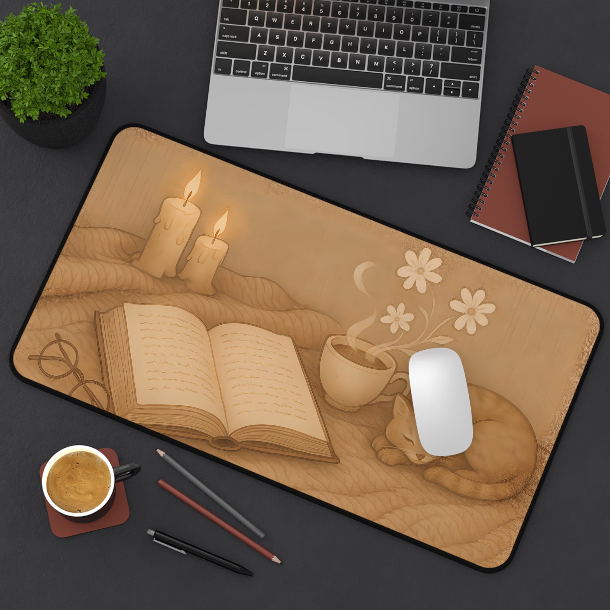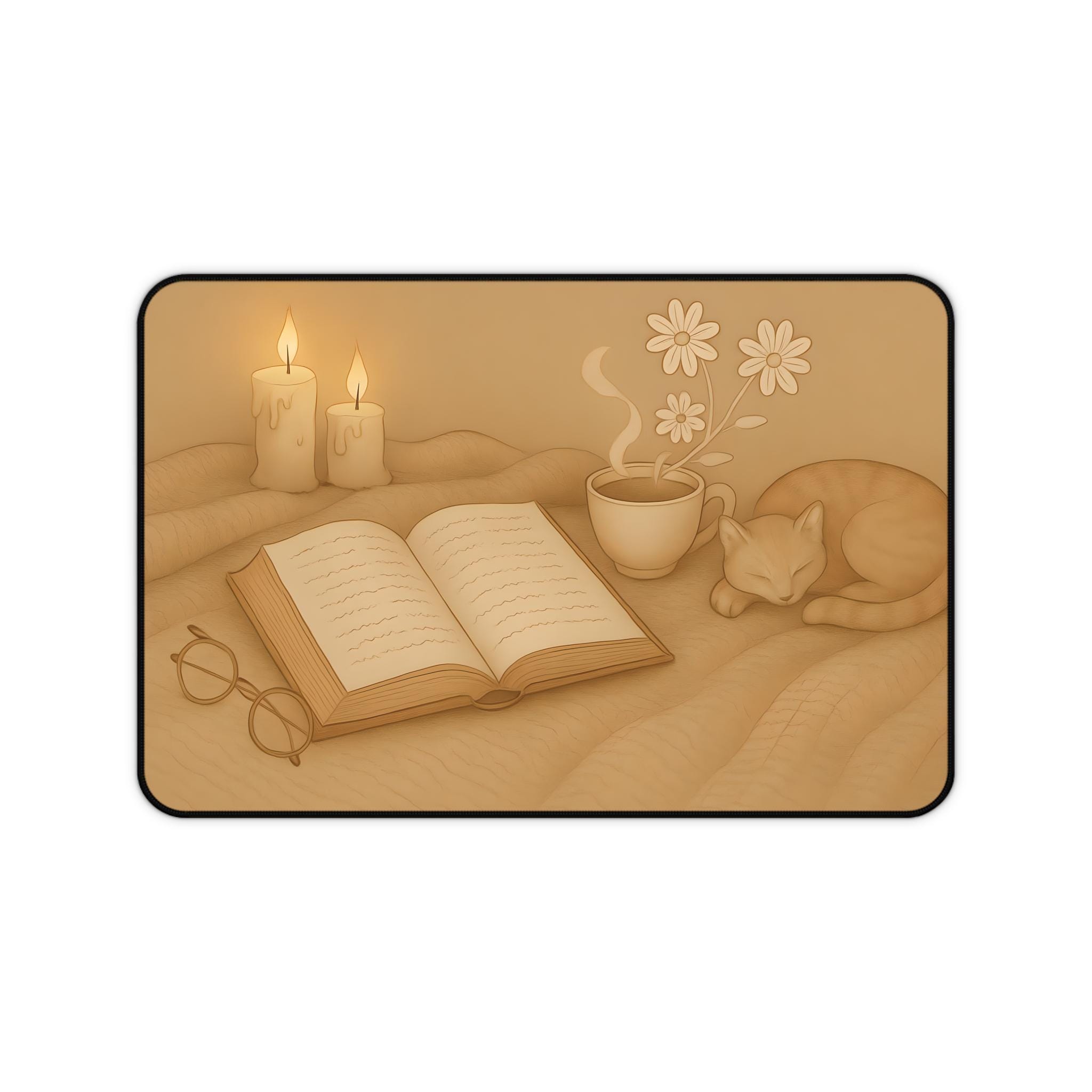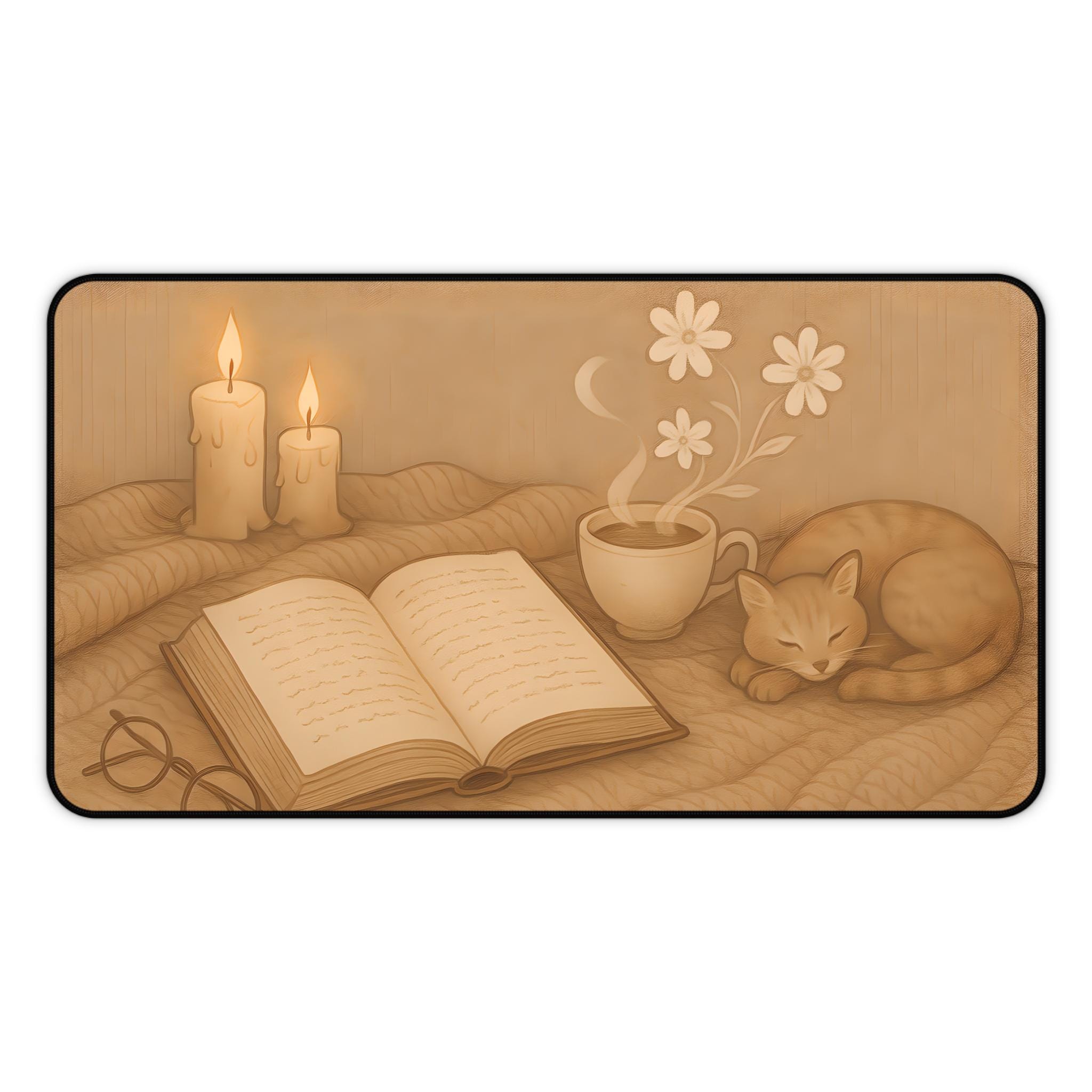 Cottagecore Cat Reading Nook Desk Mat: Cozy Tea Candle Decor