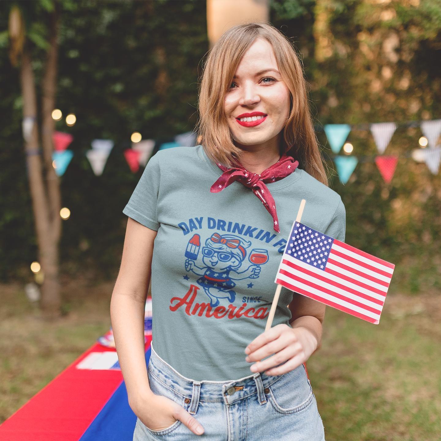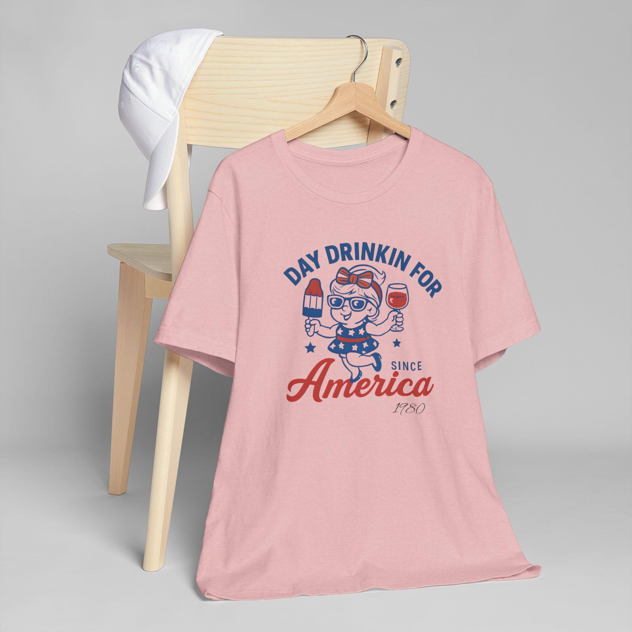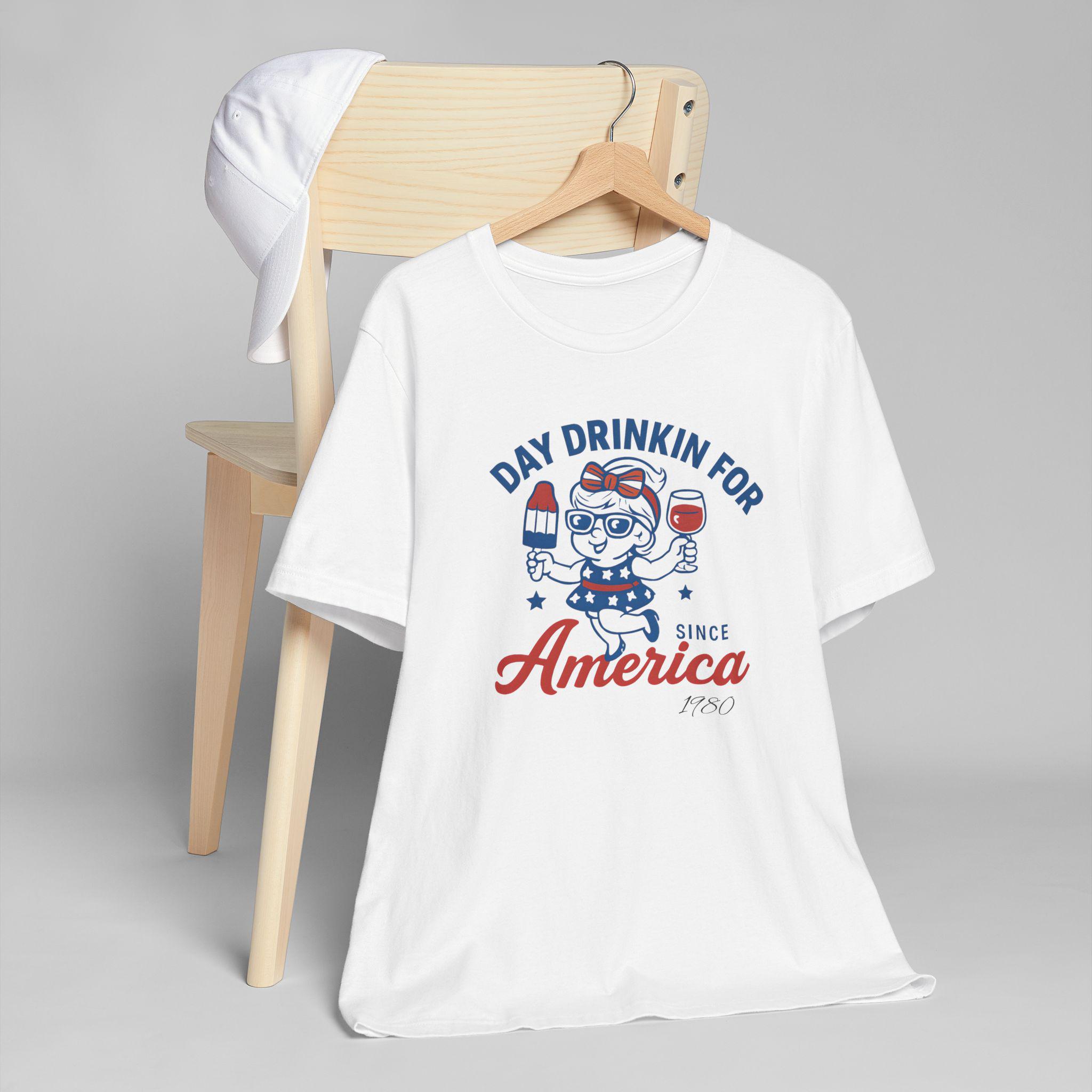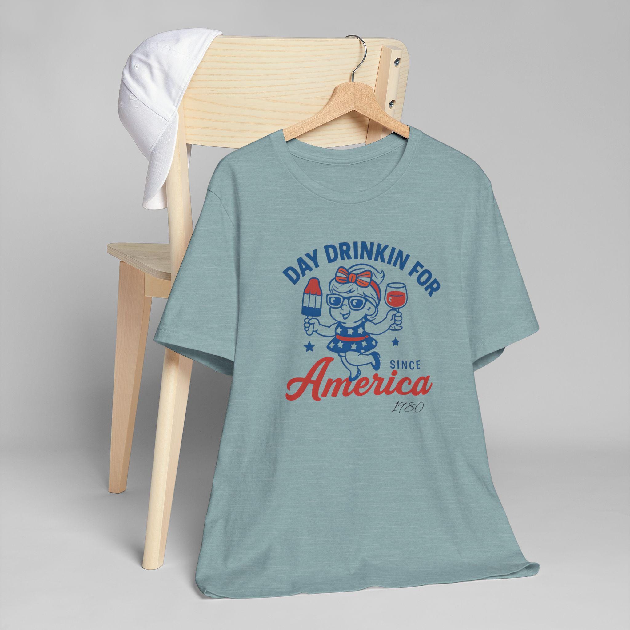 Funny July 4th Graphic Tee: Day Drinkin' for America - Vintage Patriotic Shirt