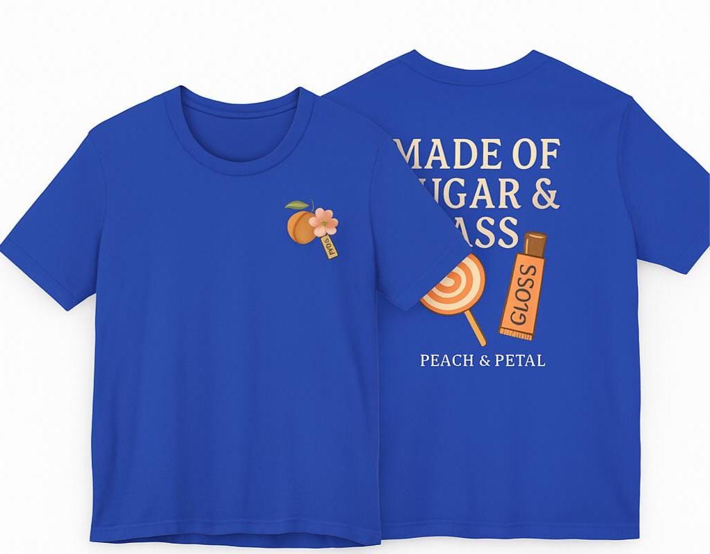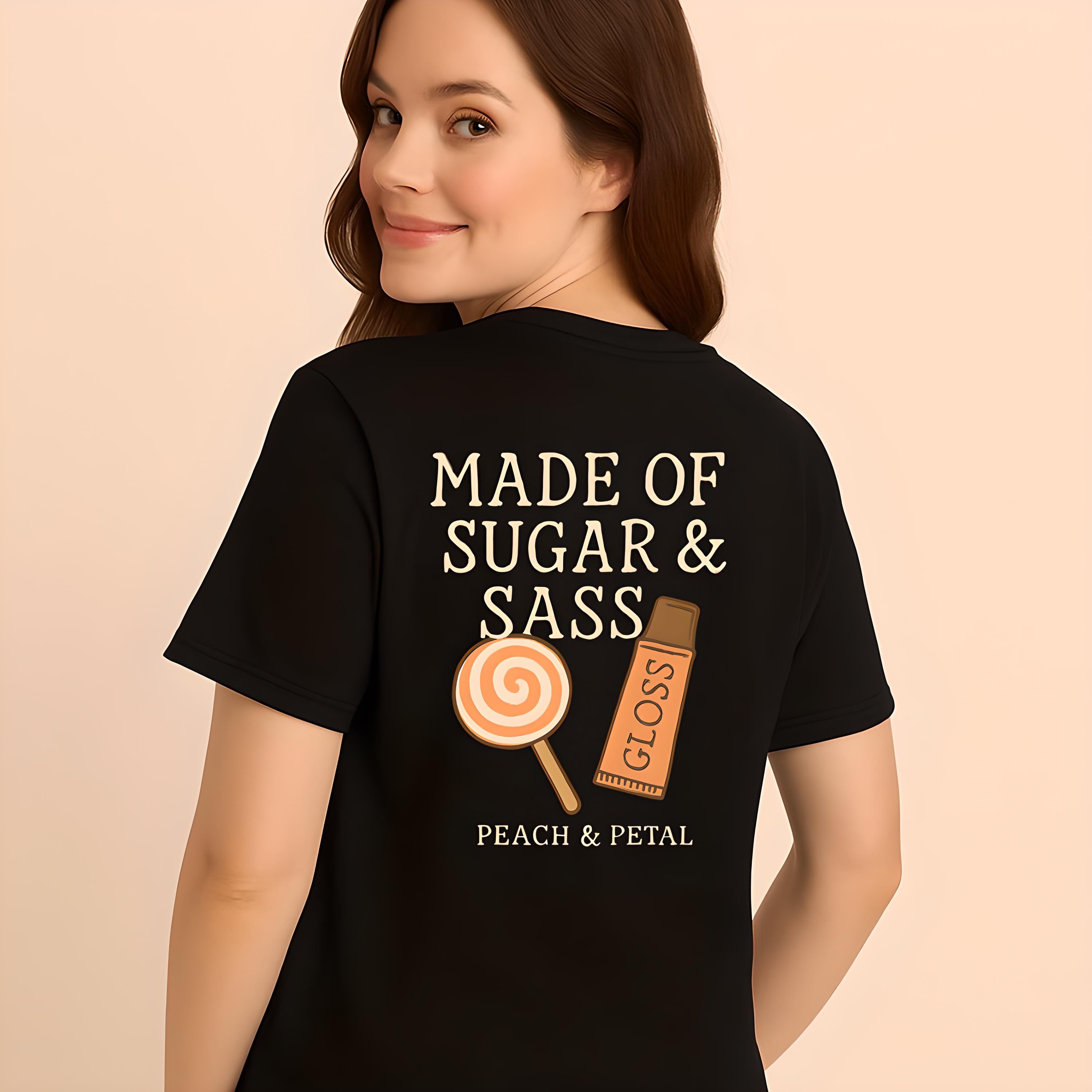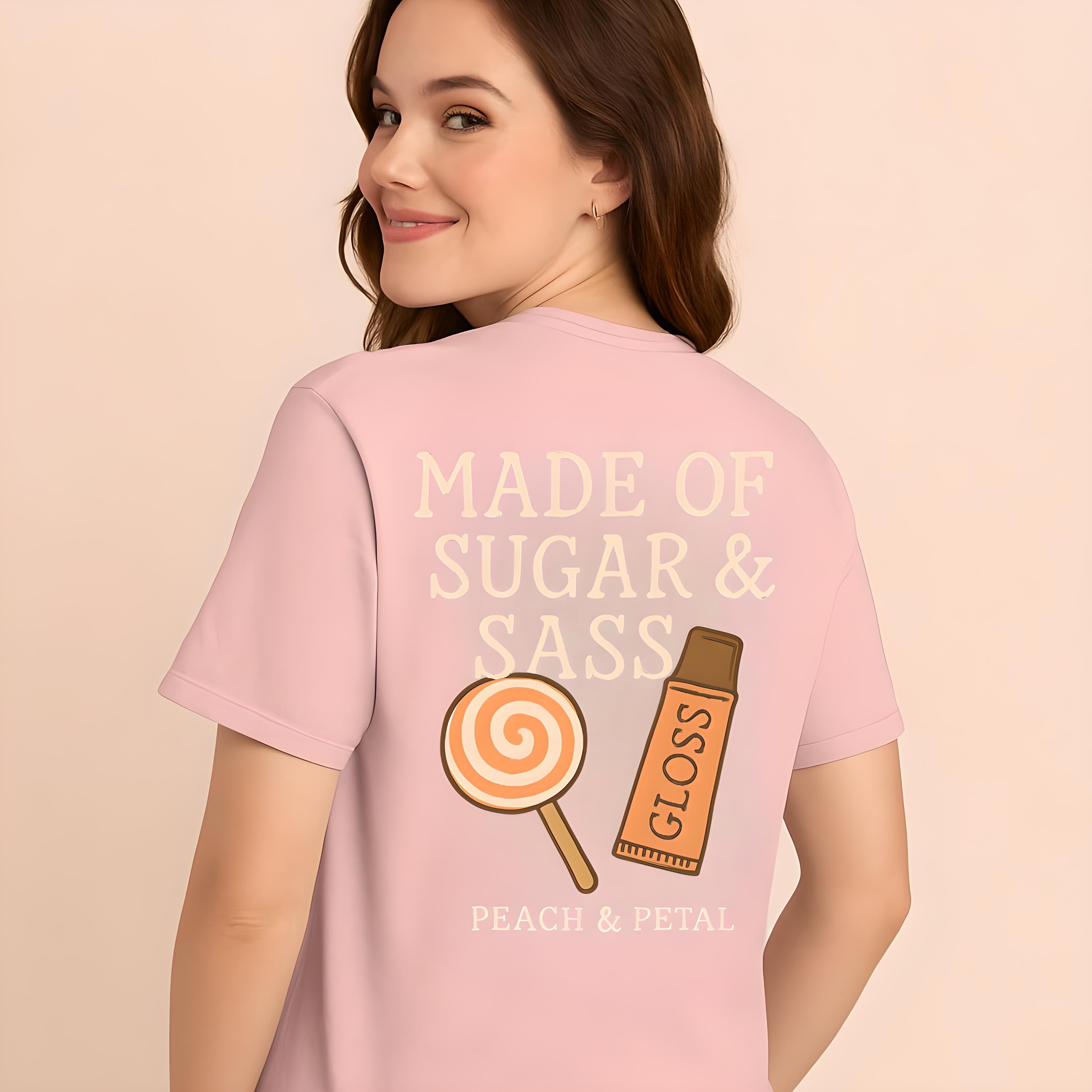 This Made of Sugar & Sass tee from the Peach & Petal Collection features a retro lollipop and lip gloss graphic on the back and our signature peach logo on the chest. It’s soft, bold, and totally adorable.