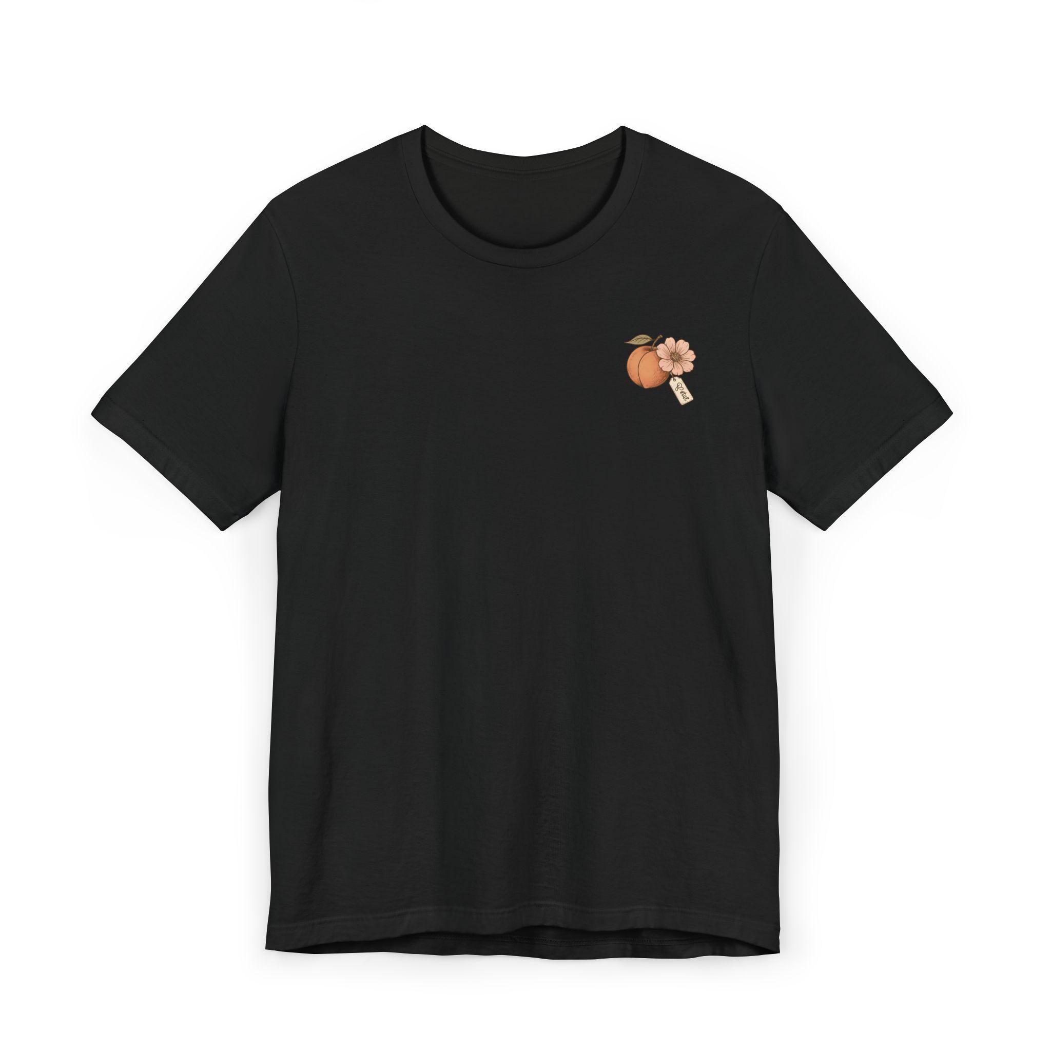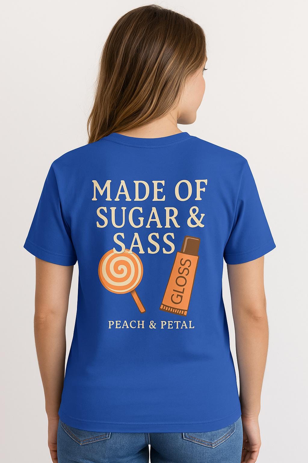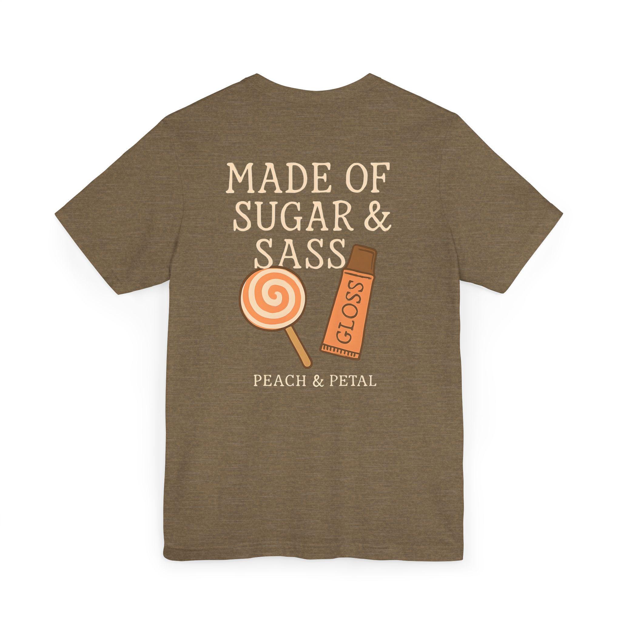 This Made of Sugar & Sass tee from the Peach & Petal Collection features a retro lollipop and lip gloss graphic on the back and our signature peach logo on the chest. It’s soft, bold, and totally adorable.
