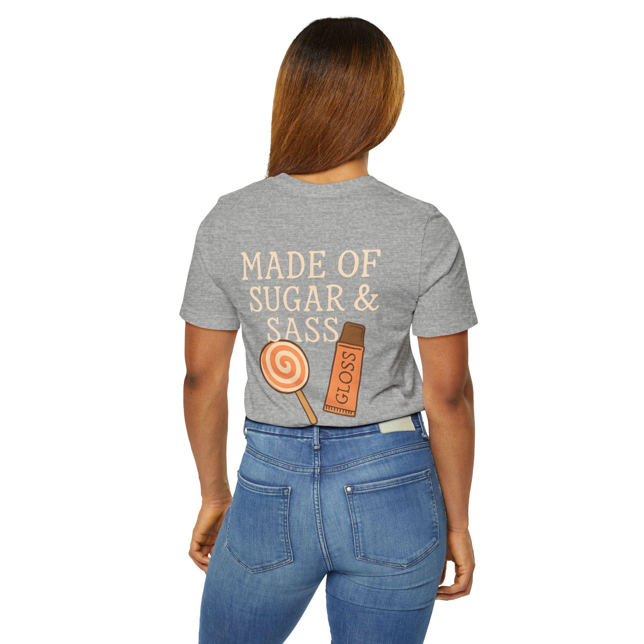 🍭 Back: “Made of Sugar & Sass” with gloss & swirl pop