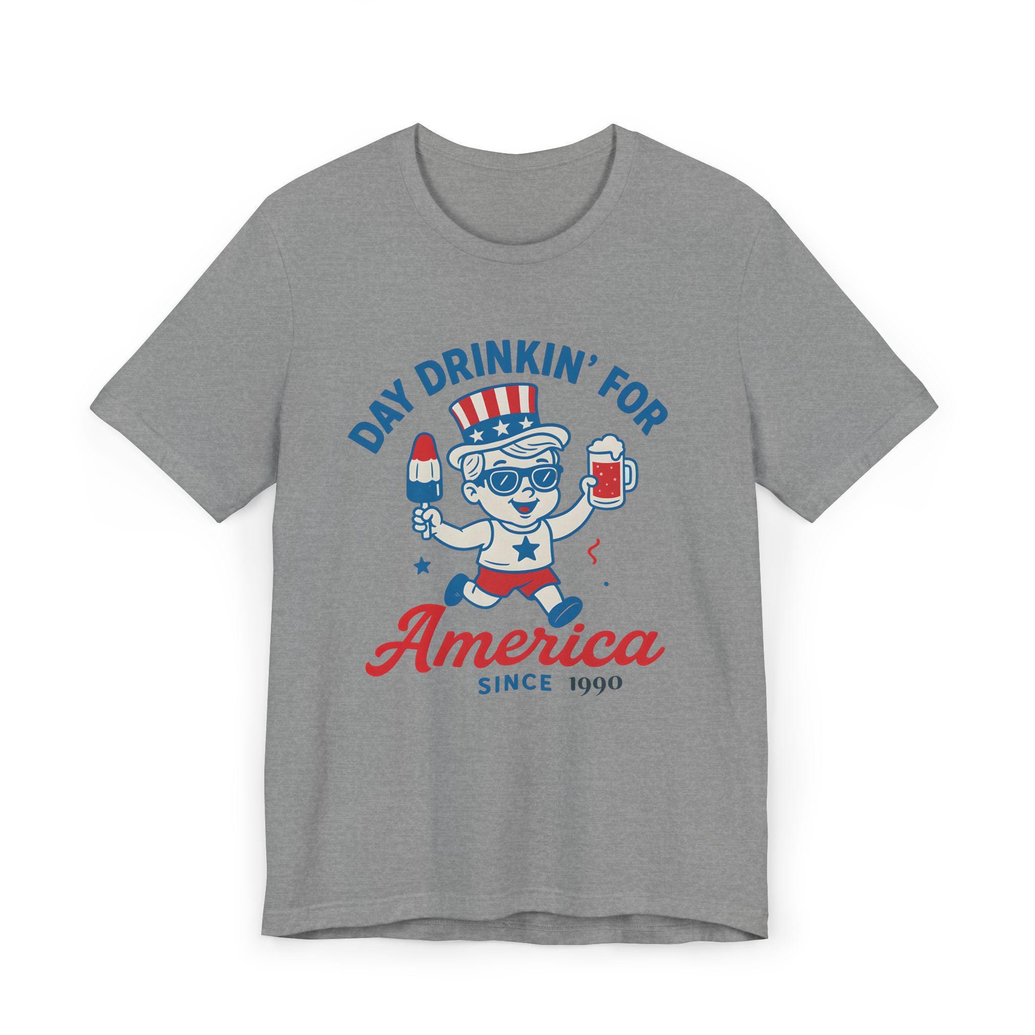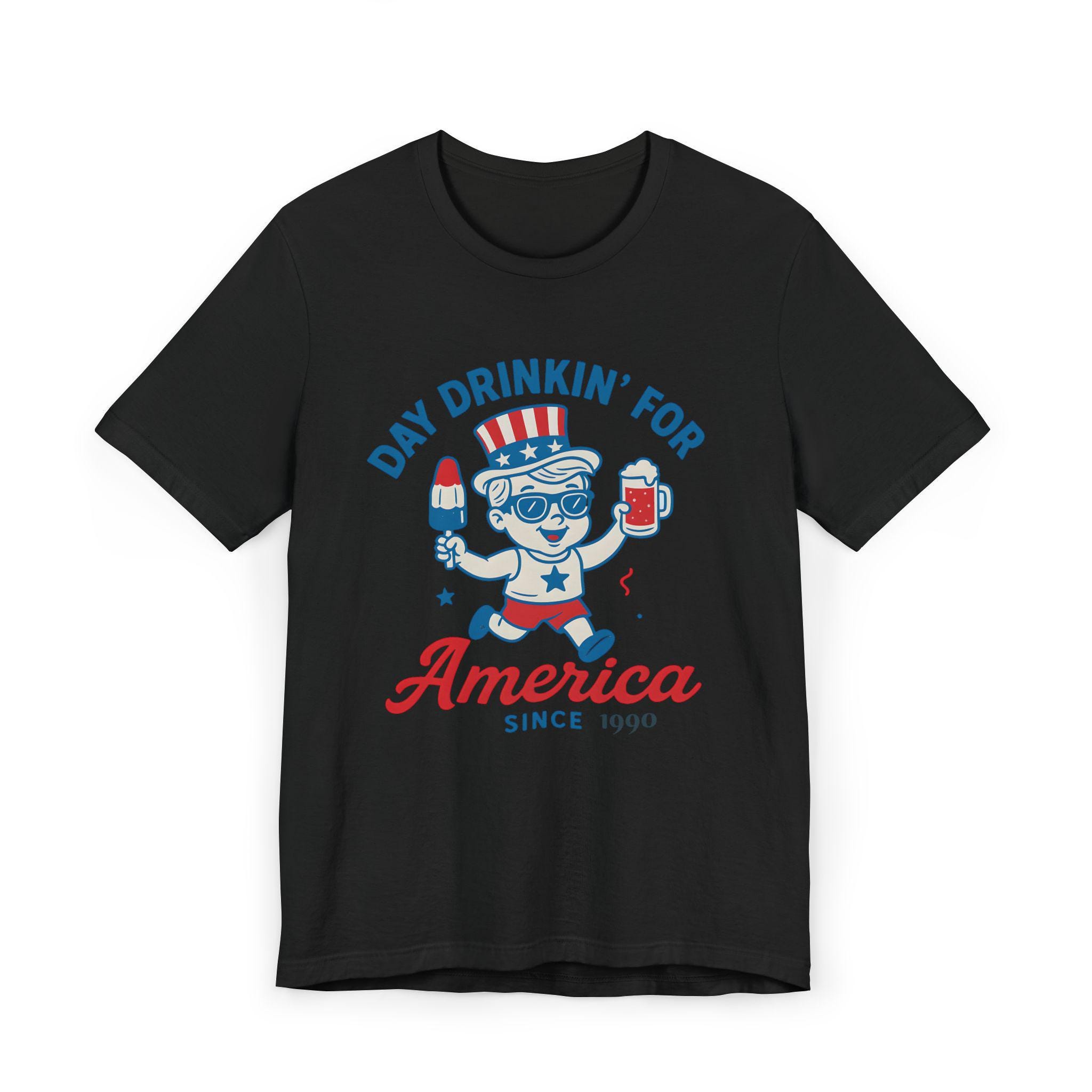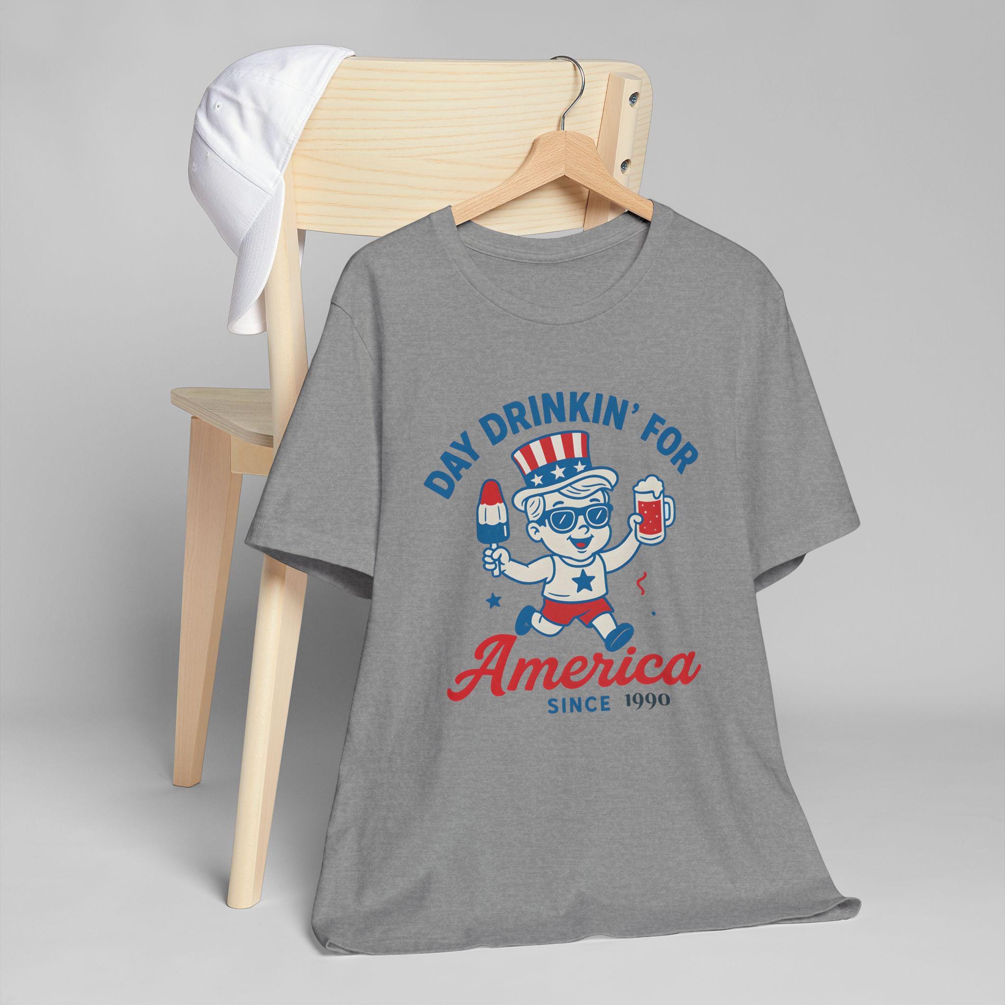 Get your freedom fizz on with this “Day Drinkin’ for America Since 1990” Jersey Tee – the perfect patriotic party shirt for beer lovers!