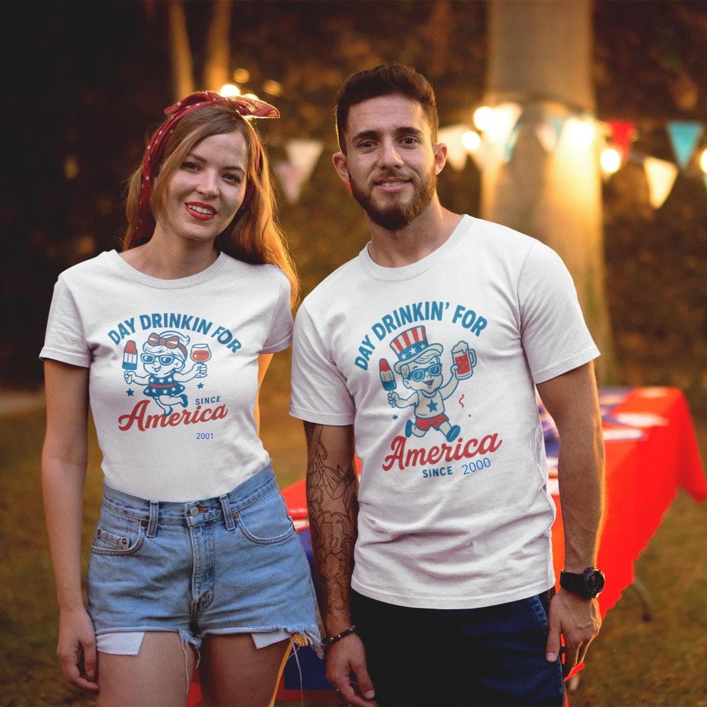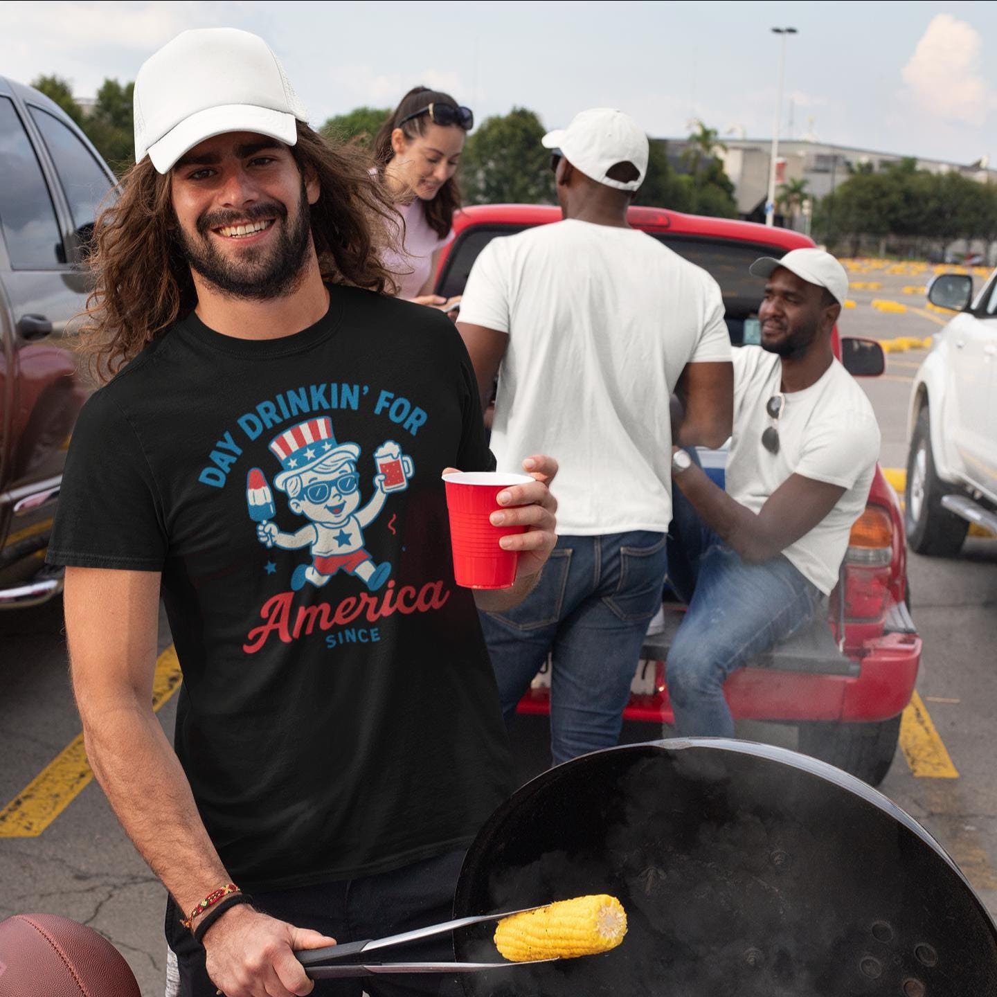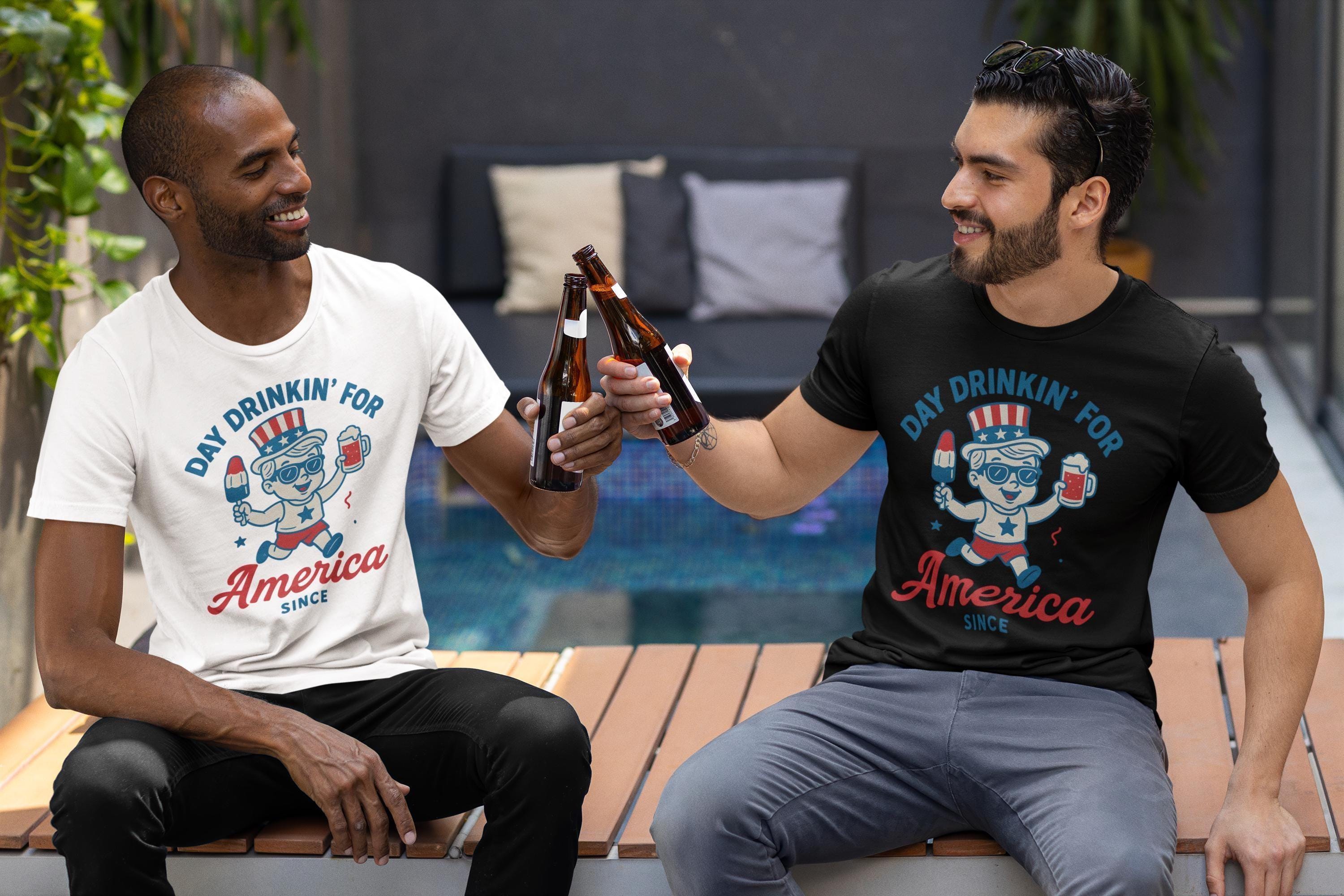 Get your freedom fizz on with this “Day Drinkin’ for America Since 1990” Jersey Tee – the perfect patriotic party shirt for beer lovers!