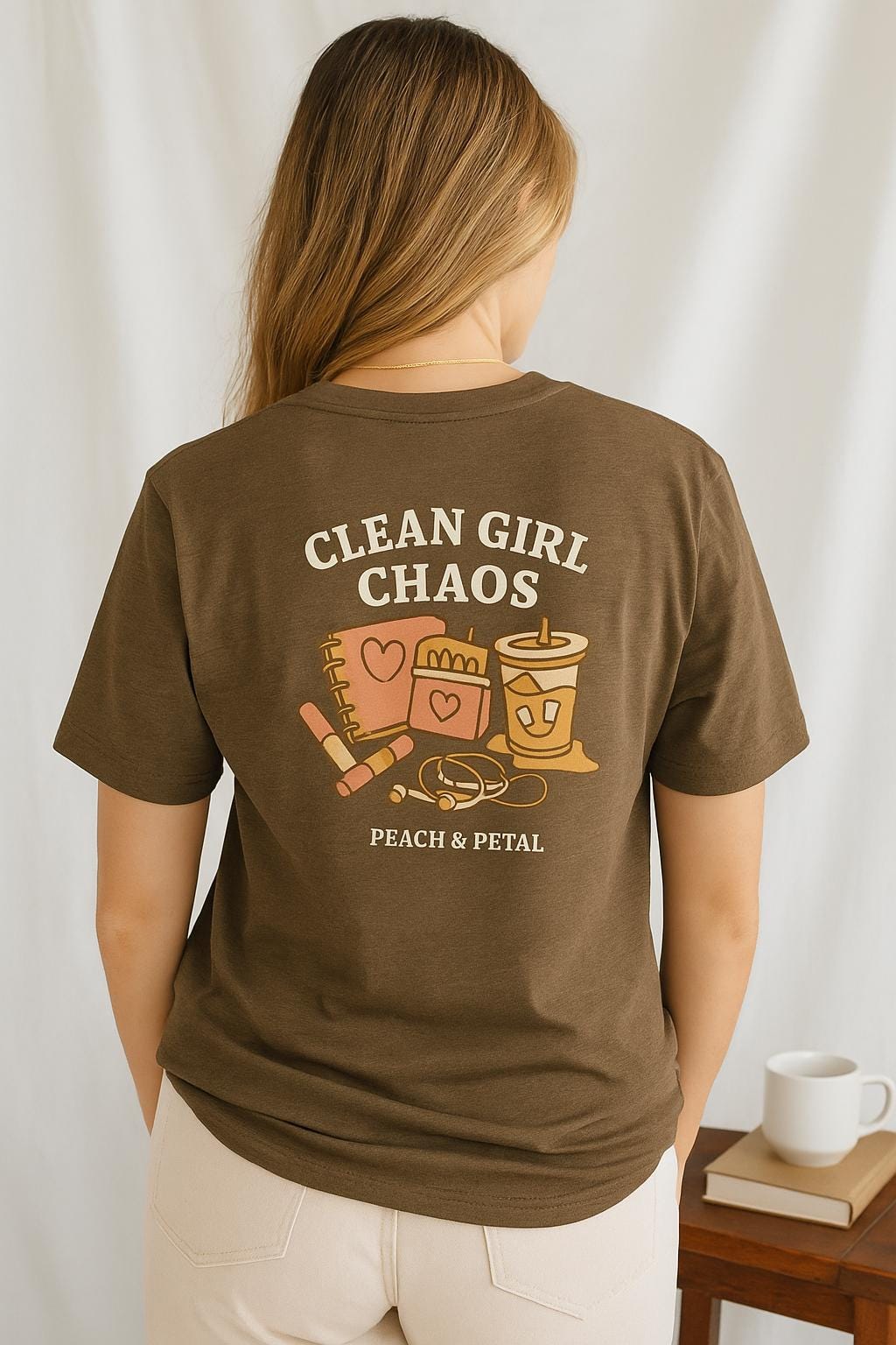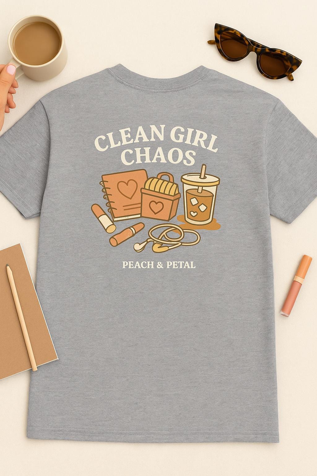 Channel your inner “Clean Girl Chaos” with this aesthetic jersey tee from the Peach & Petal Collection. Perfect for iced coffee enthusiasts, skincare lovers, and note-taking enthusiasts, this comfy tee features a bold back graphic showcasing all your essential items—journals, gloss, earbuds, and caffeine—plus our minimalist logo on the front.
