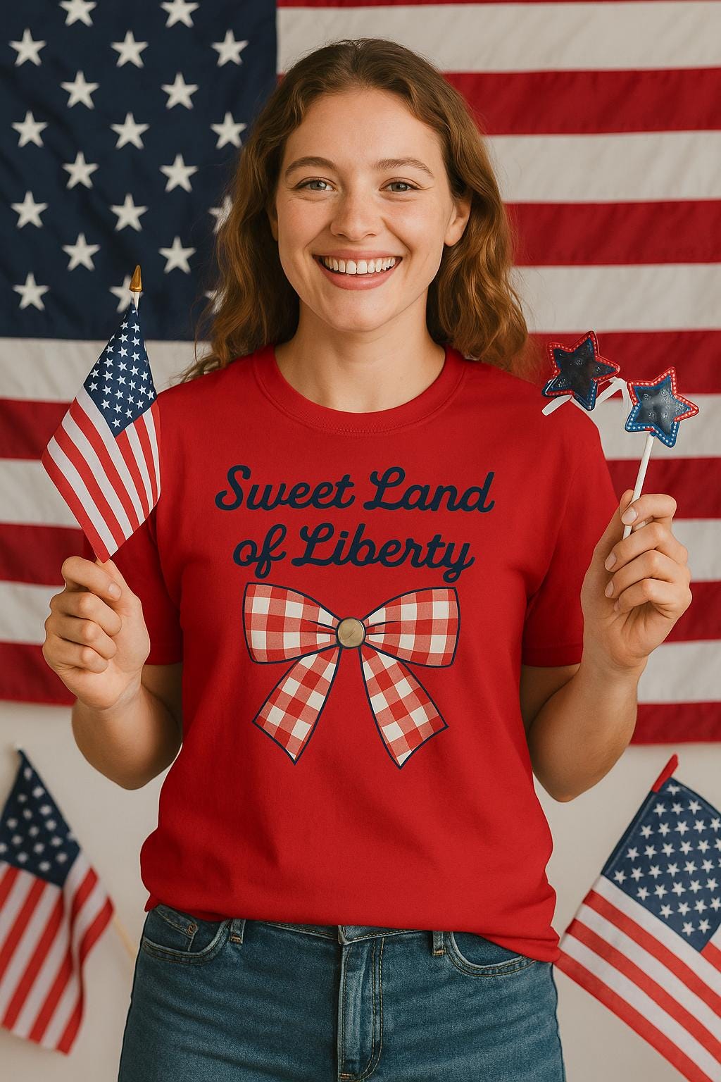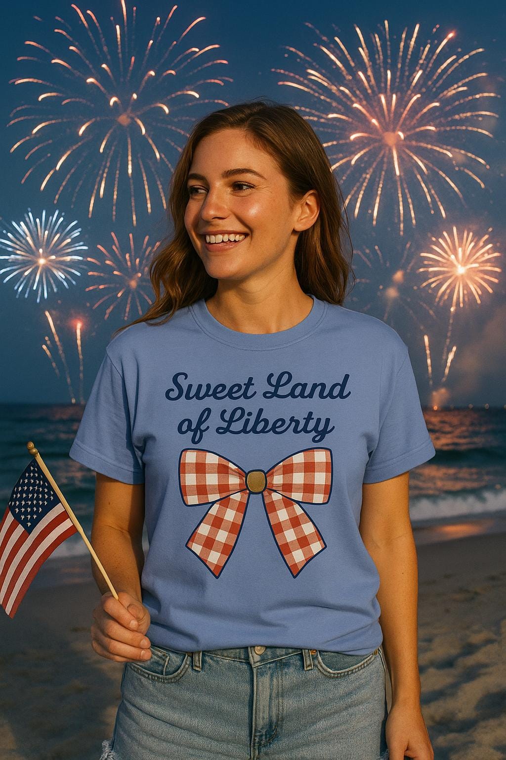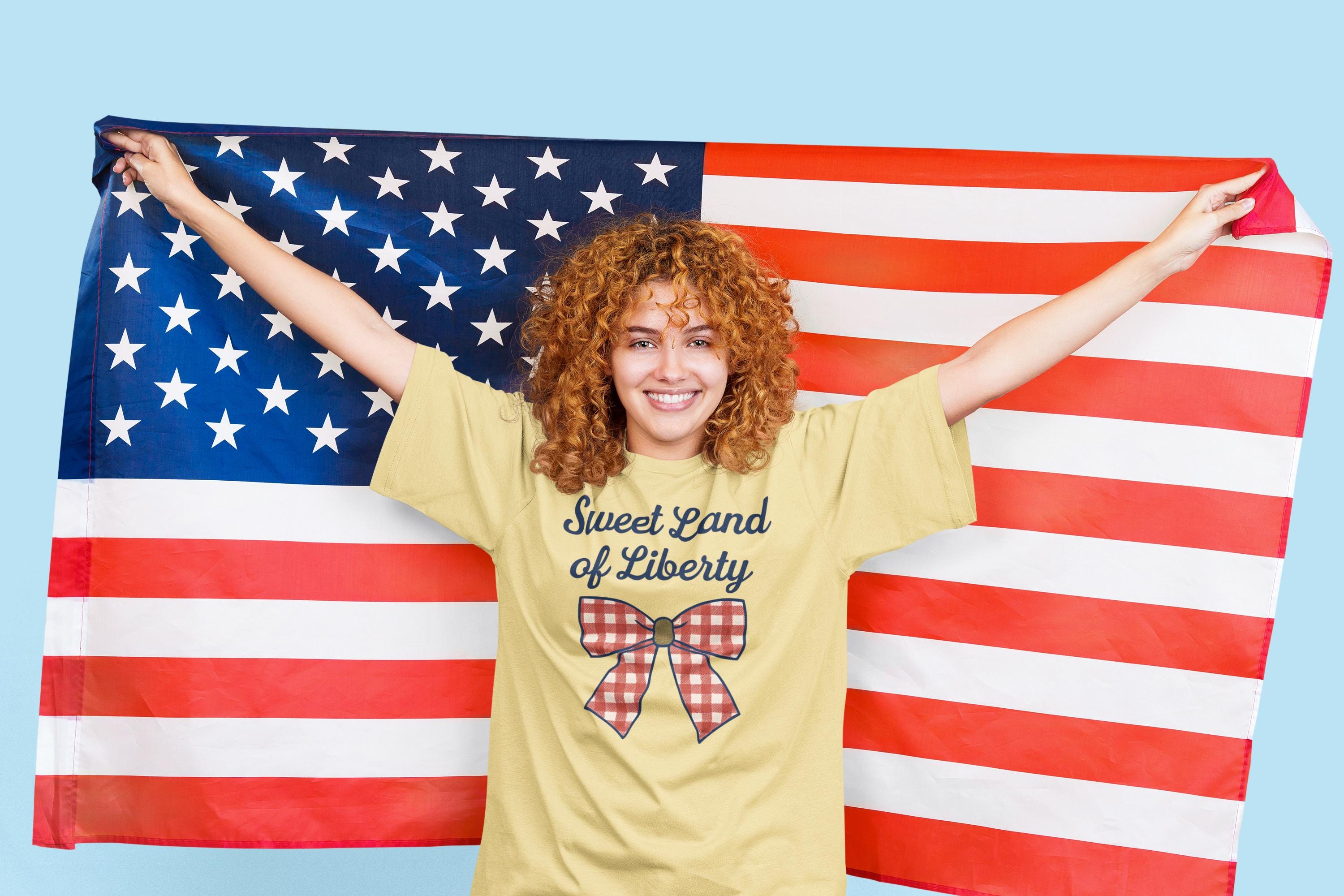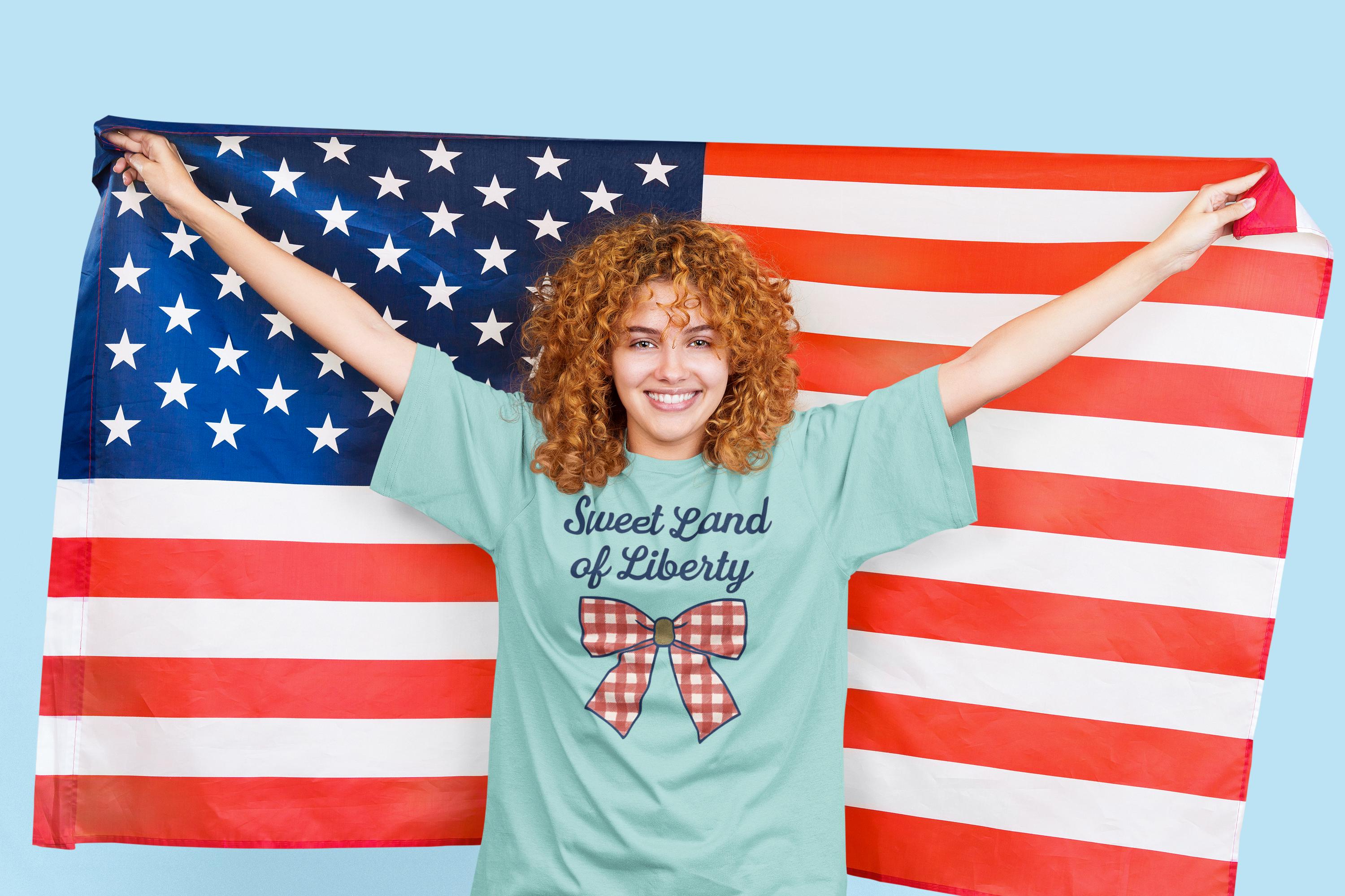 Show off your sweet, star-spangled style with this “Sweet Land of Liberty” Comfort Colors tee featuring a retro gingham bow!