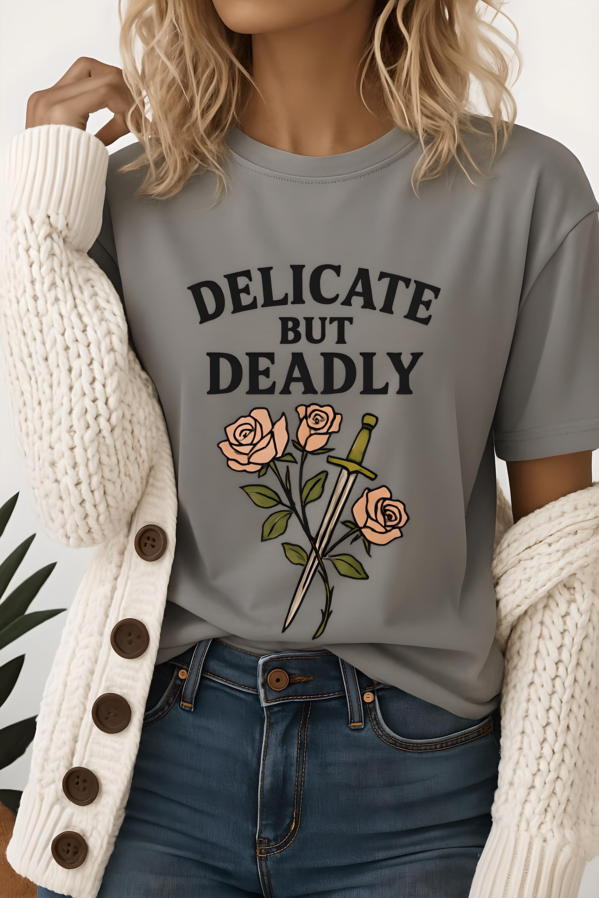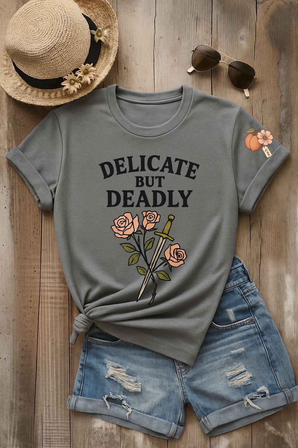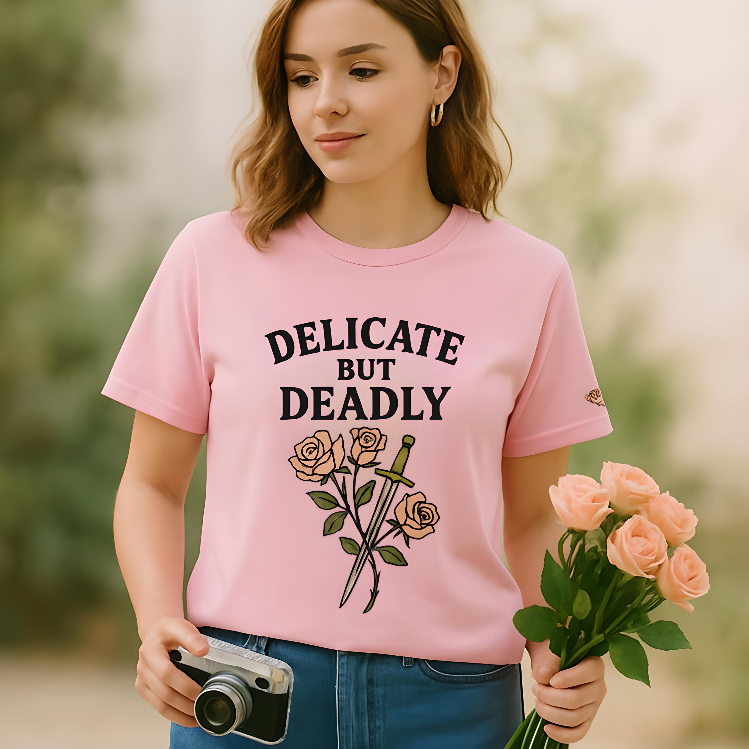 🌸 Front: “Delicate But Deadly” sword + rose graphic