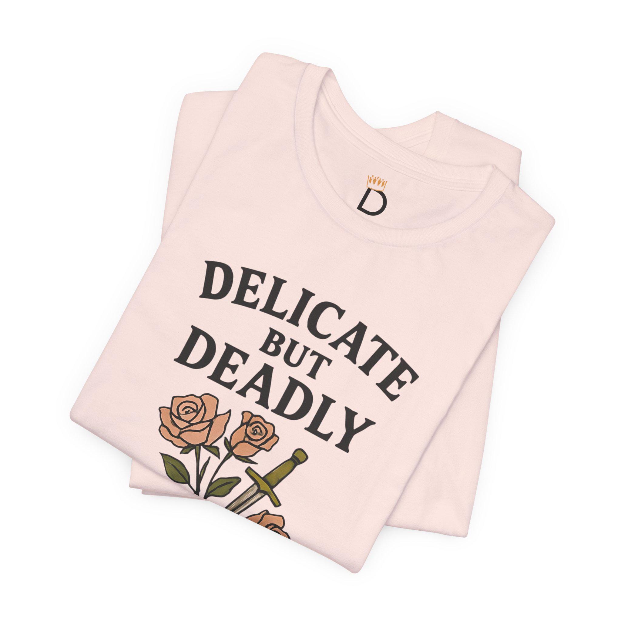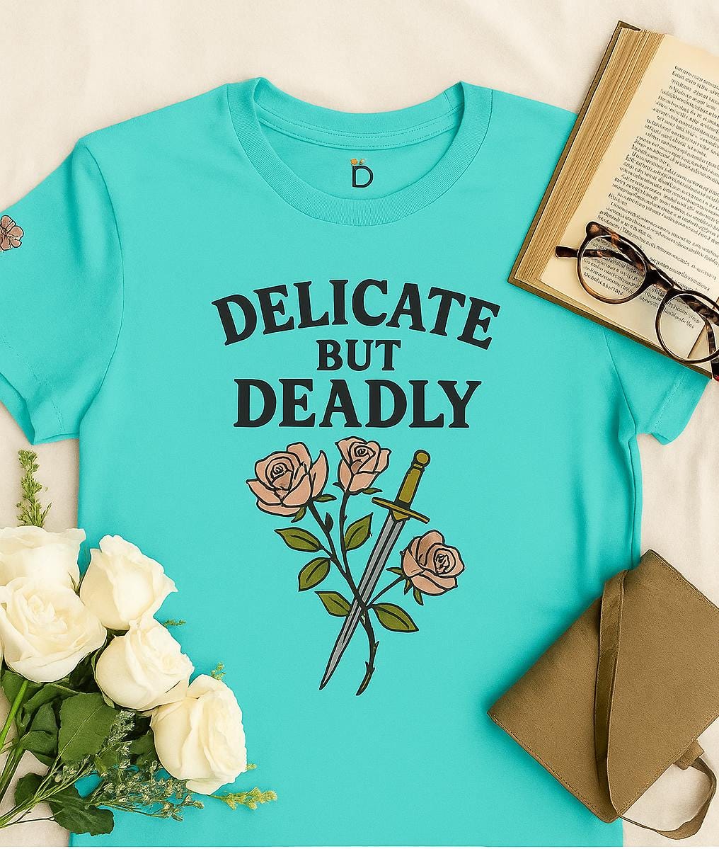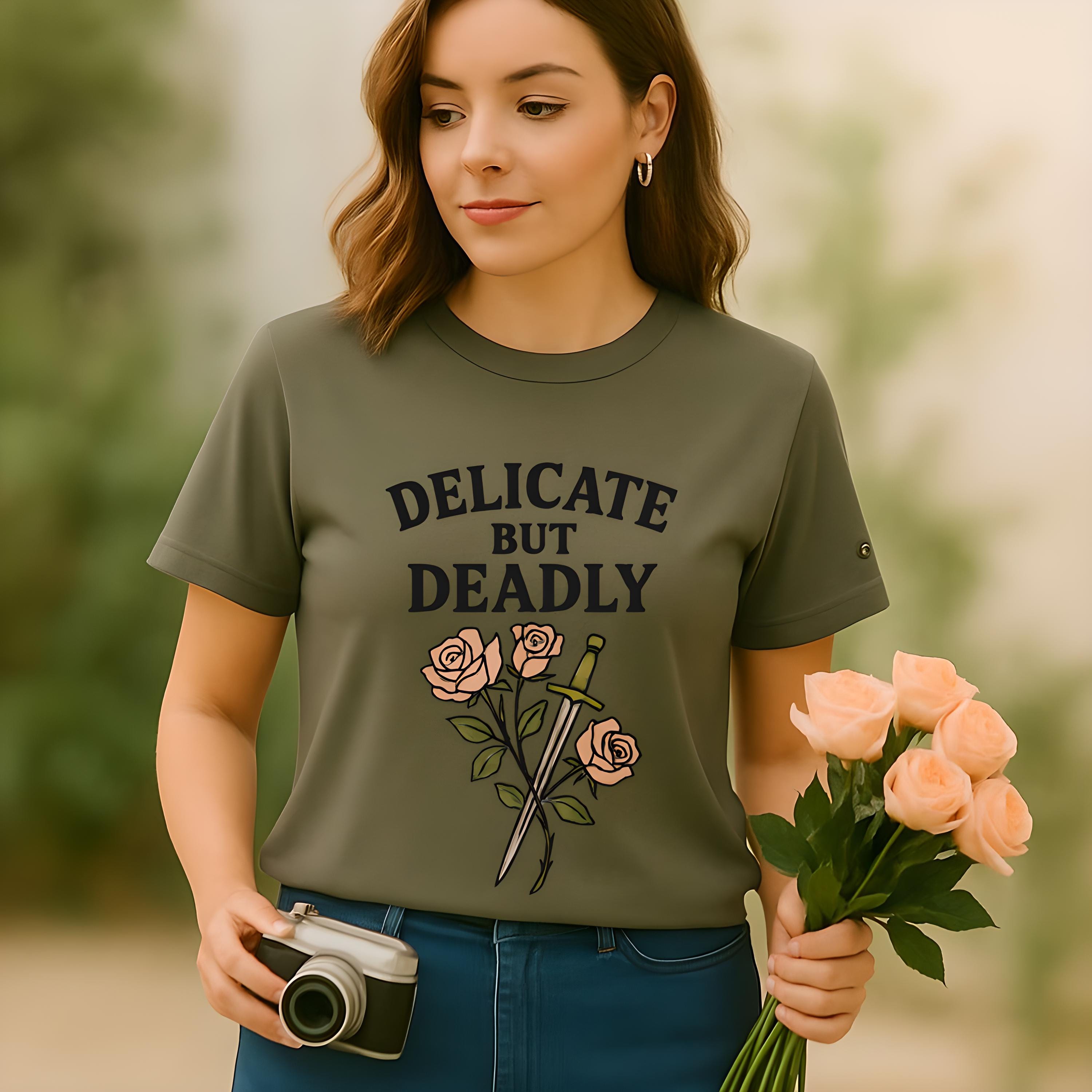 🌸 Front: “Delicate But Deadly” sword + rose graphic