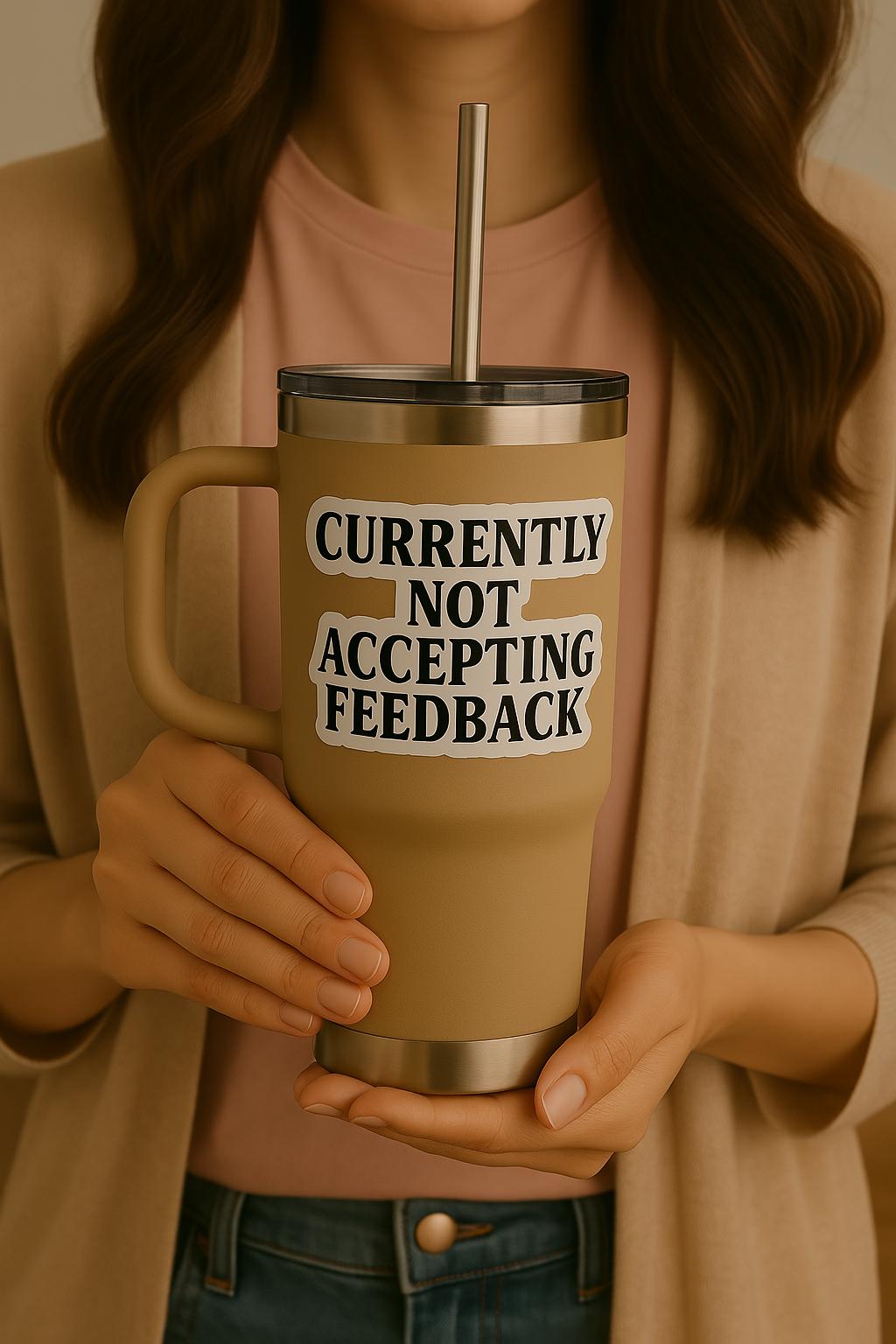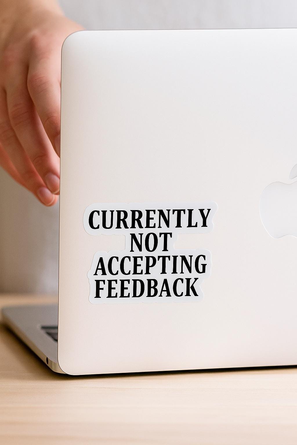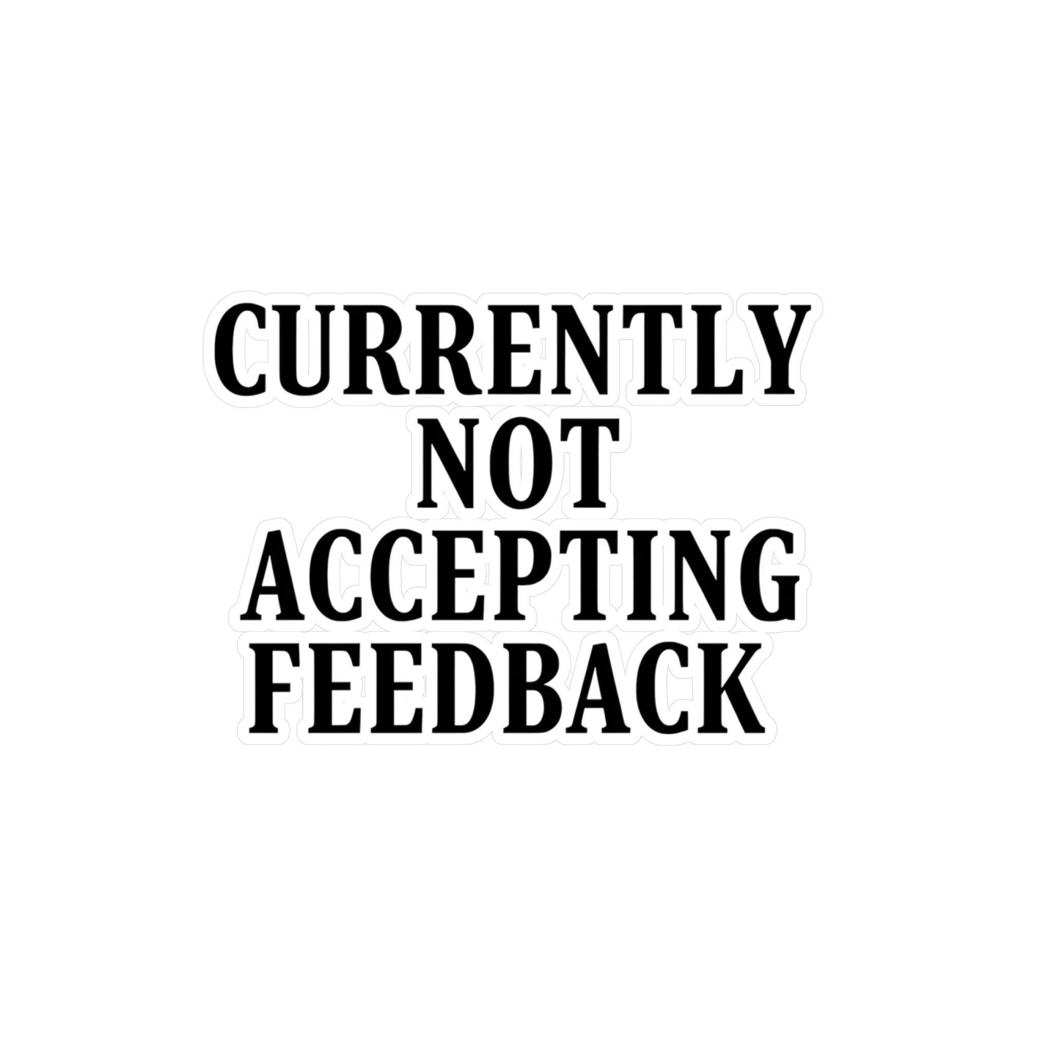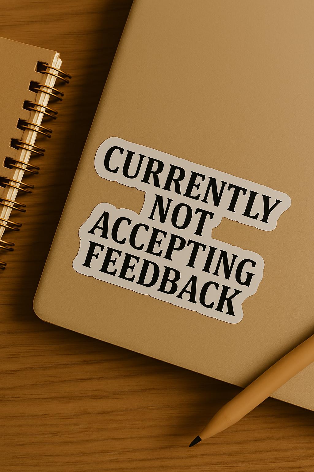These vibrant kiss-cut vinyl decals feature the design 'Currently Not Accepting Feedback'. Waterproof Stickers. They are perfect for those looking to add a touch of personality to their laptops, notebooks, and water bottles. Ideal for individuals who appreciate quirky and sarcastic humor. Great for birthdays, graduation gifts, or any occasion where a fun sticker can bring a smile.