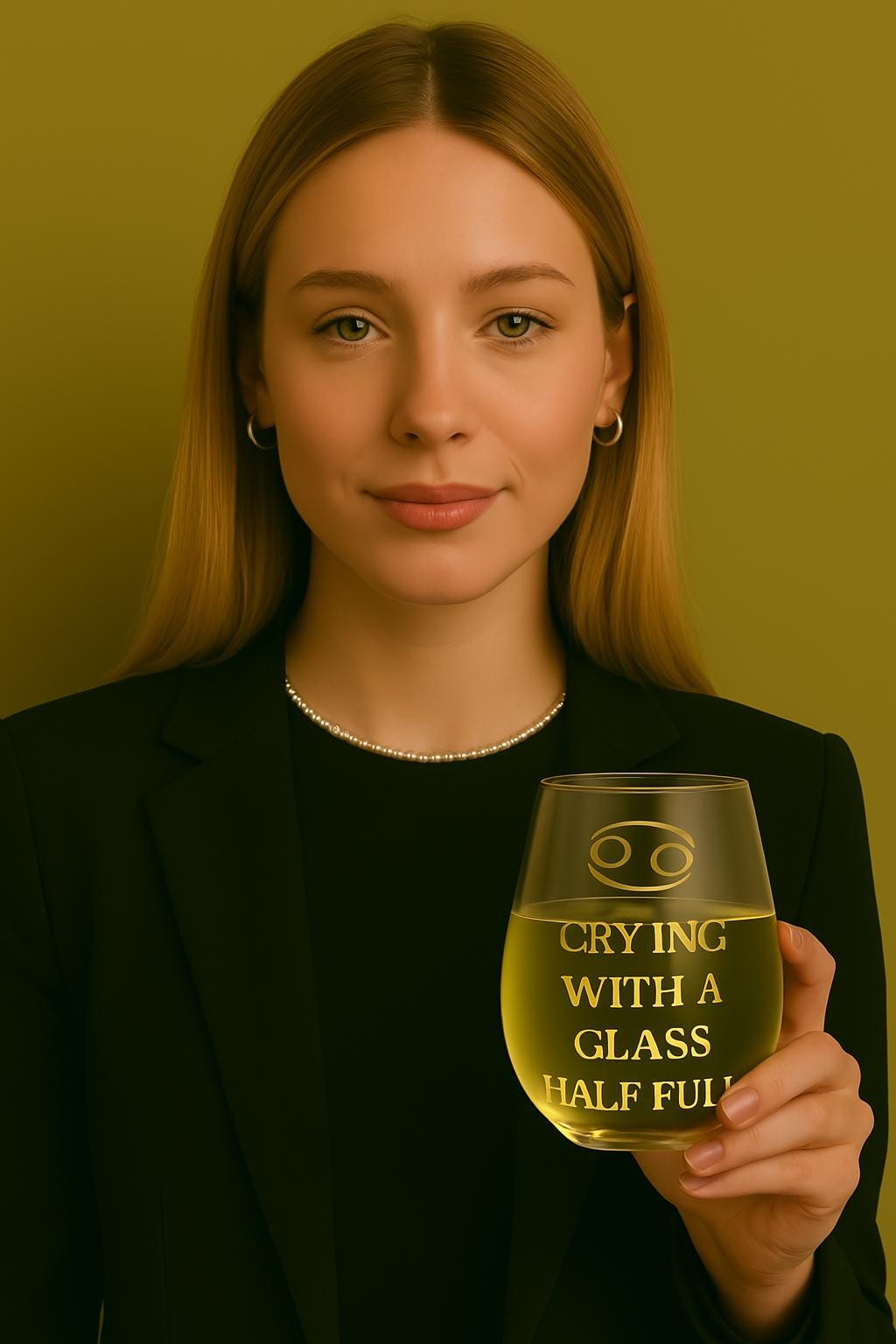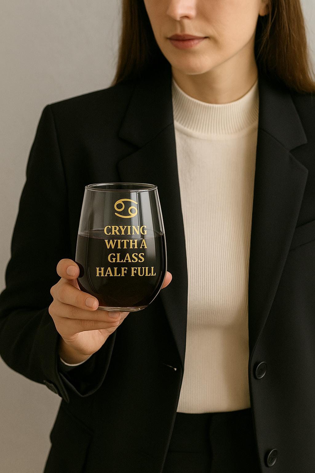 Cancer Wine Glass For the Cancer who feels everything... but still pours a generous glass. This stemless wine or whiskey glass features the iconic Cancer zodiac symbol in luxe gold above the phrase “Crying With a Glass Half Full”—a cosmic wink to your emotional superpowers and unmatched loyalty.