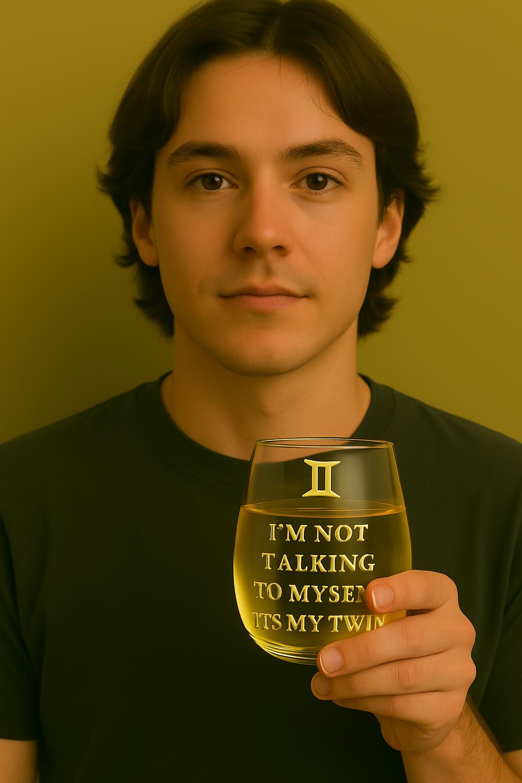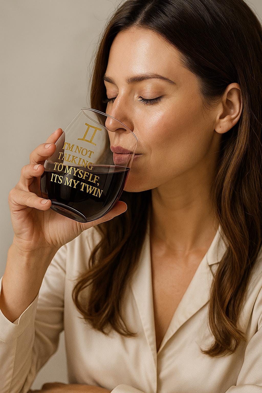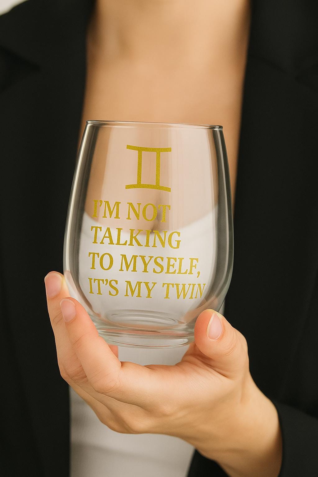 Celebrate your inner twin with this stylish 6 oz stemless wine glass featuring bold gold lettering that reads: “I’m Not Talking to Myself, It’s My Twin.” Perfect for astrology lovers, wine enthusiasts, and anyone who proudly owns their Gemini energy.