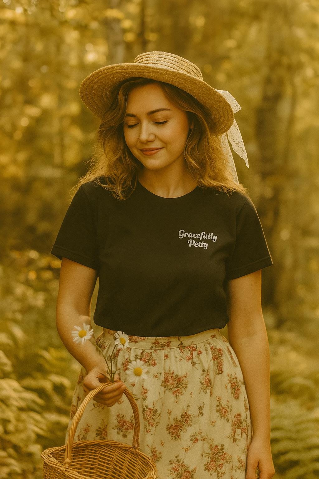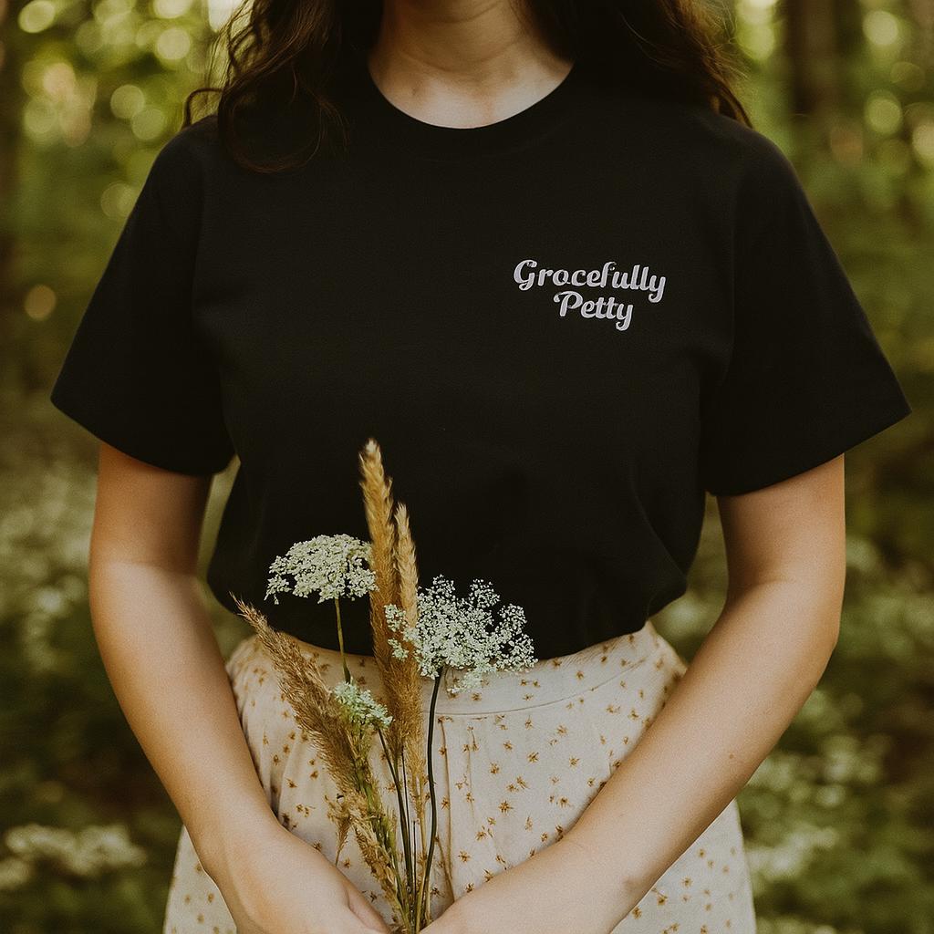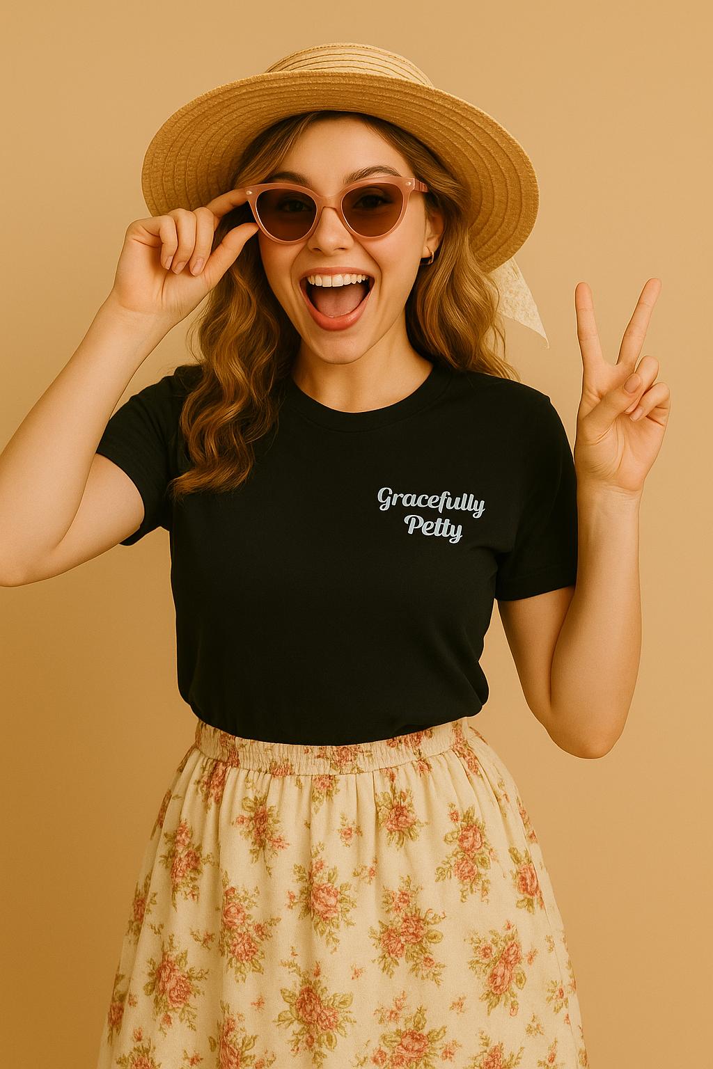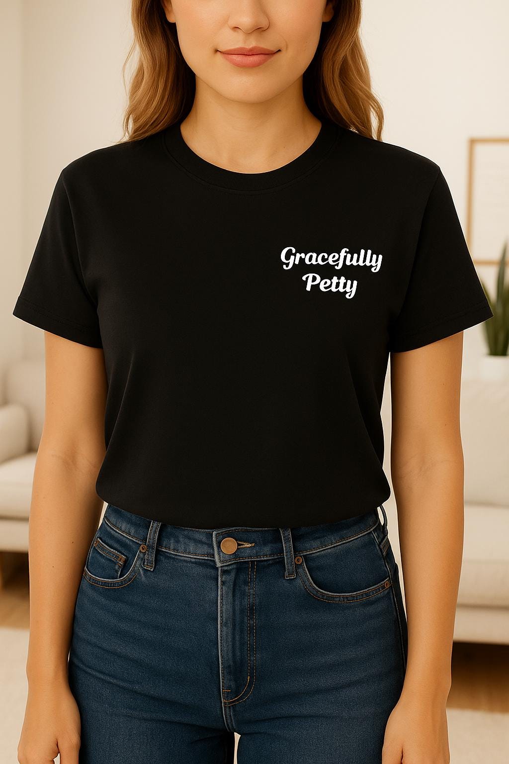 Embrace your graceful attitude with this Funny Black Tee for Women, featuring bold white text that perfectly balances sass and style. The crisp, minimal design showcased in the image makes this "Gracefully Petty" shirt a witty addition to any wardrobe, setting it apart with genuine humor and charm.