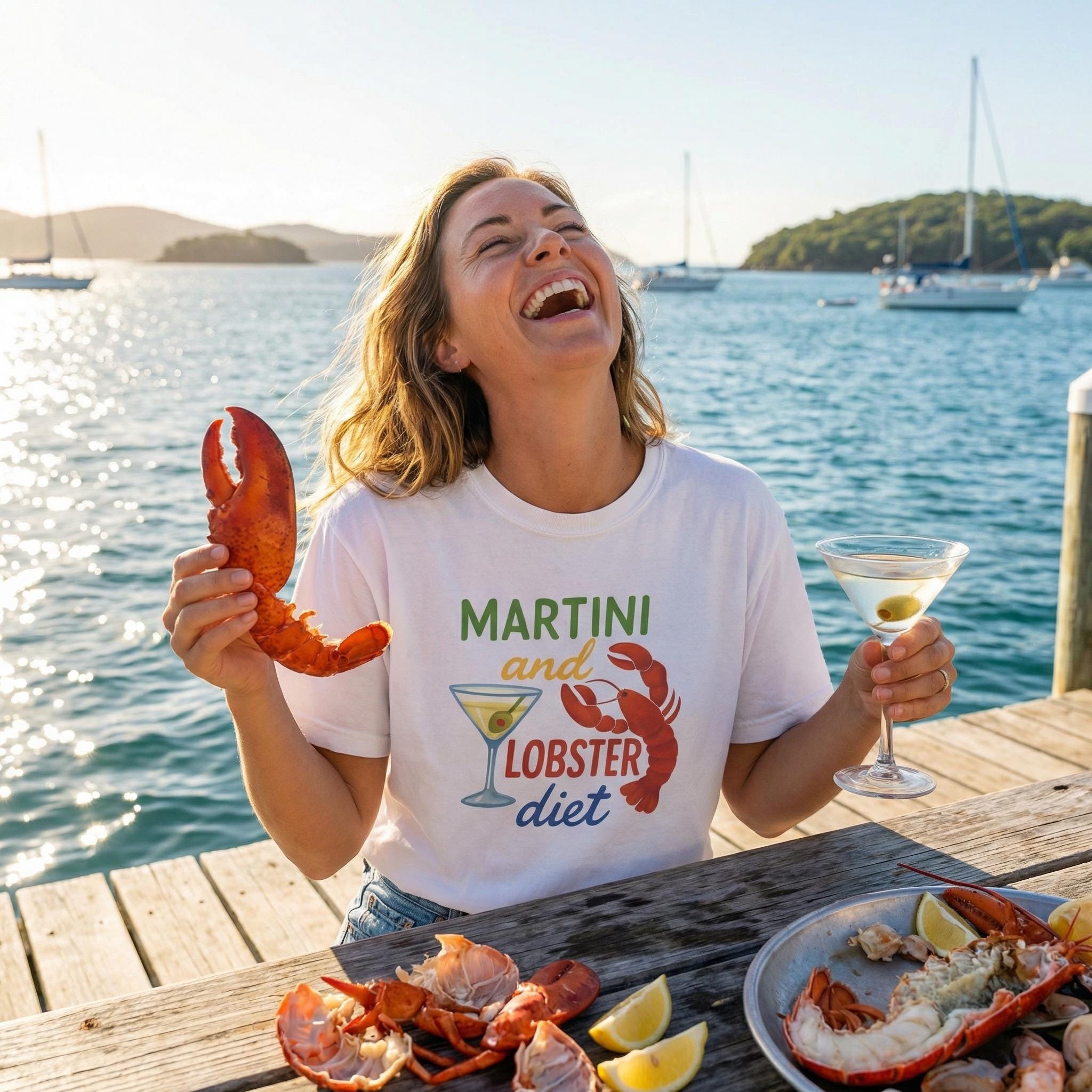Forget the kale; we’re here for the crustaceans and the cocktails. Our "Martini and Lobster Diet" tee is for the woman who knows that life is too short for boring meals and filtered thoughts. Featuring a vibrant, retro-style illustration of a classic martini and a bold red lobster, this shirt is your official uniform for summer soirées, beach club lunches, or whenever you’re feeling "refined but rude."